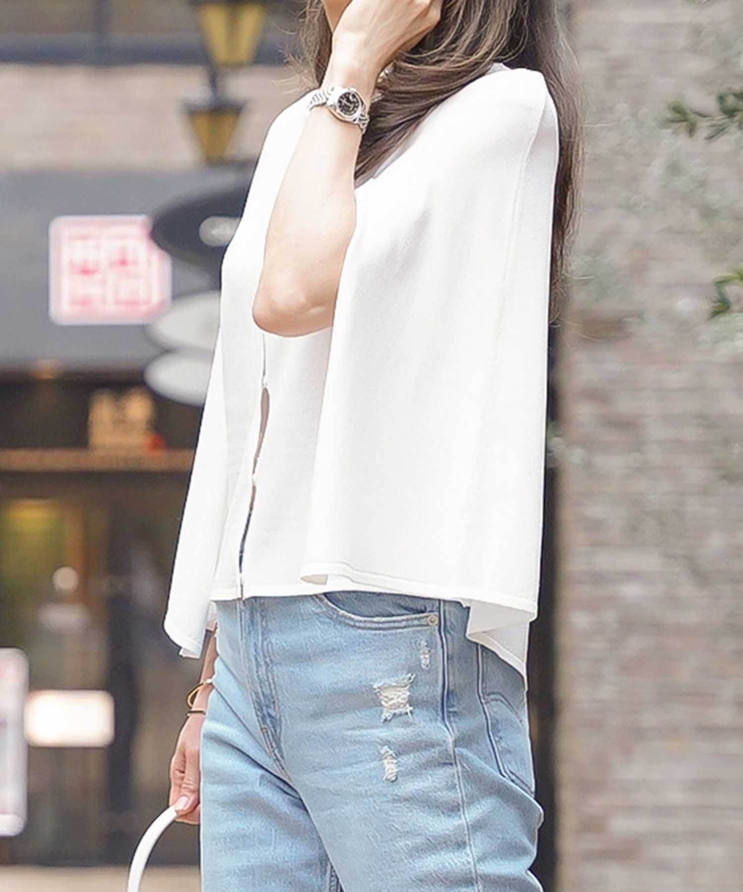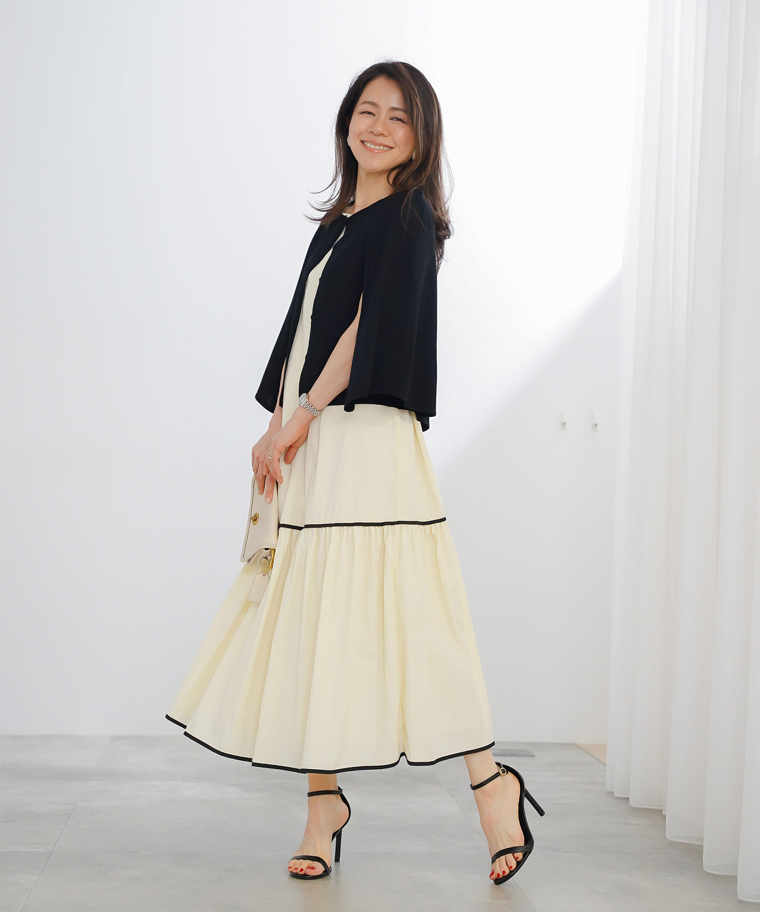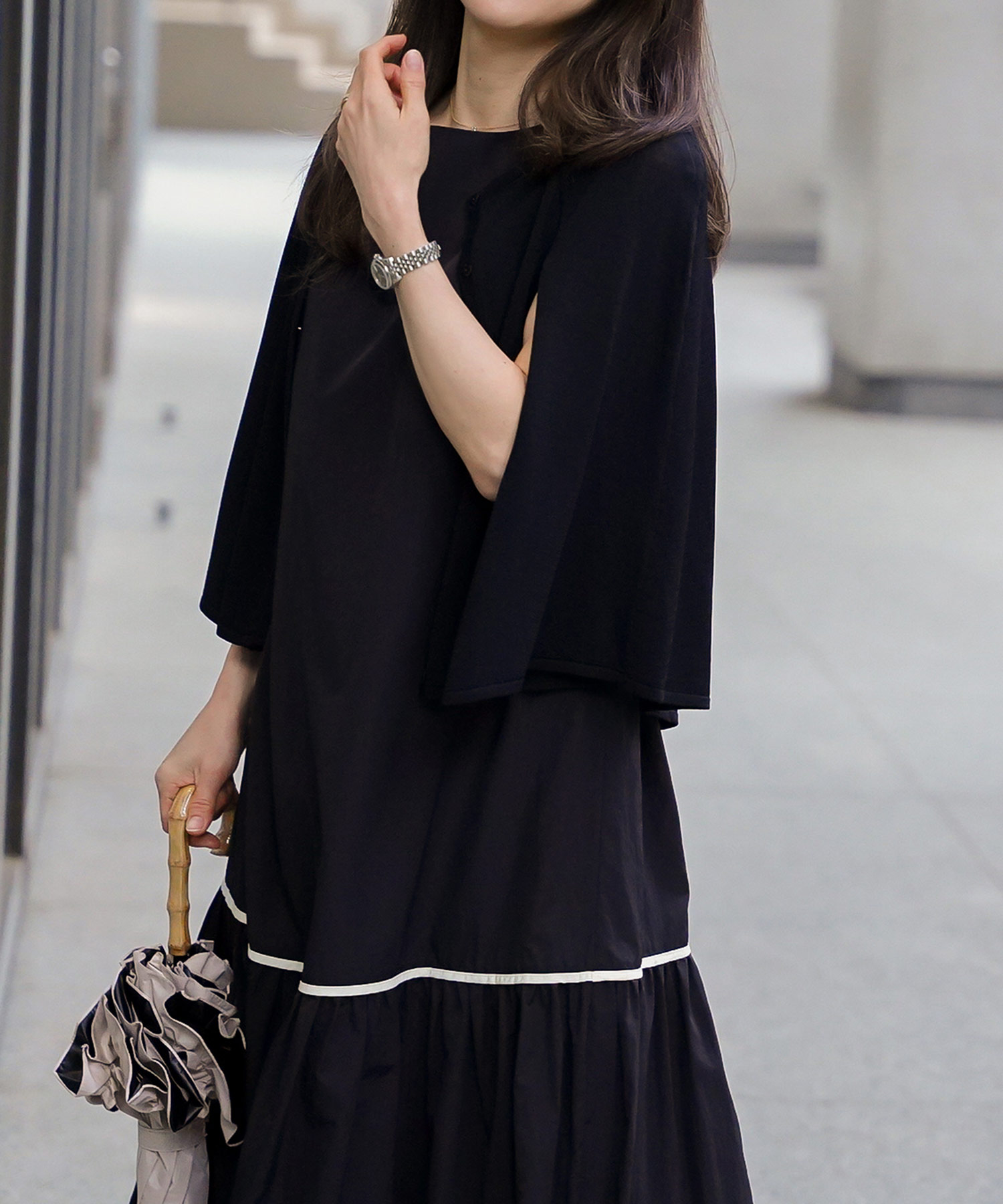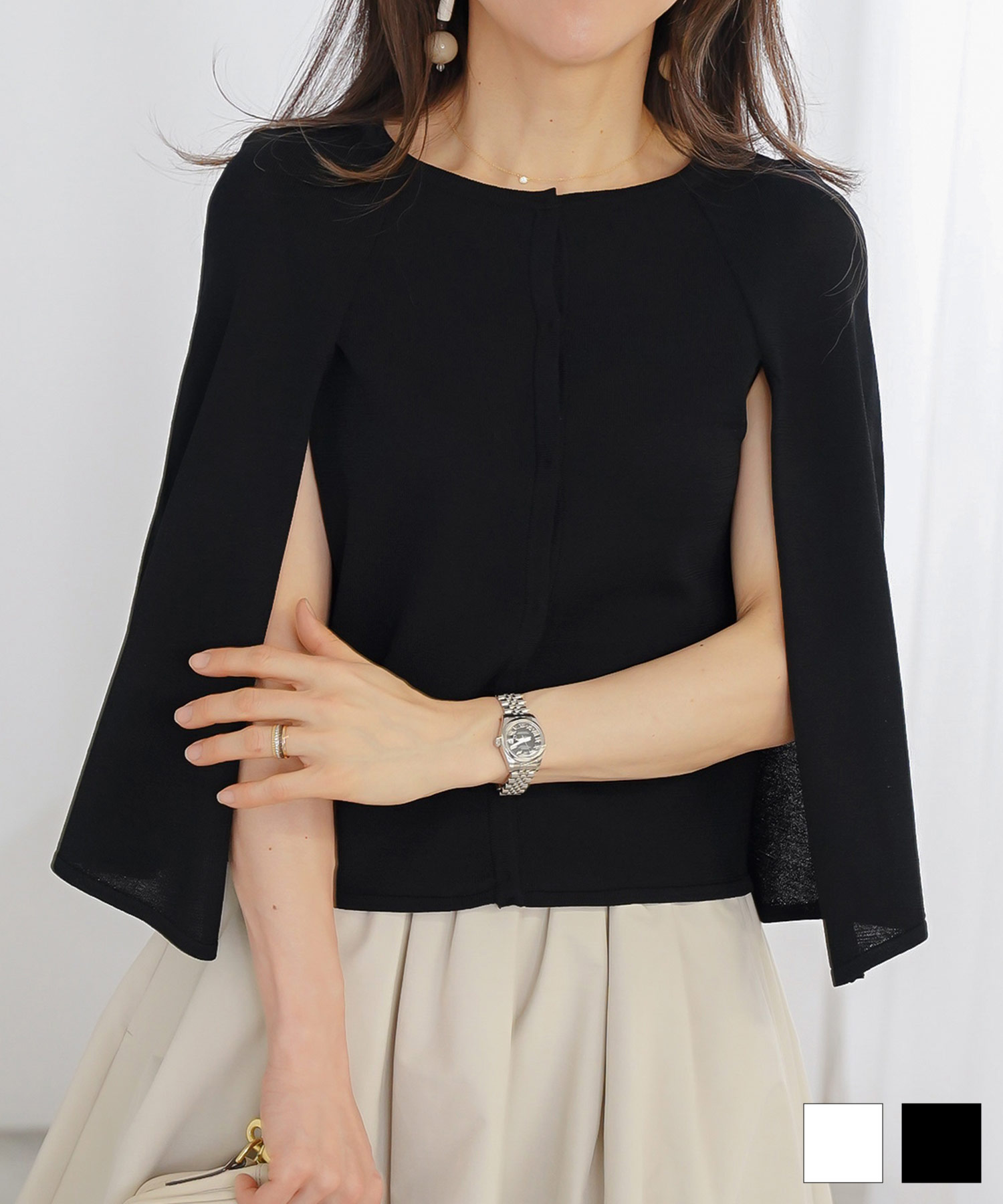ジャケットなしでも上品に整えたい日に取り入れやすい、ケープデザインのニットカーディガンです。肩にふわりとかかるようなシルエットがやわらかな印象を添えつつ、きれいめな雰囲気をキープしやすいのが魅力。羽織りとしてはもちろん、トップス感覚でも着こなしやすく、春秋の気温差が気になる日や、冷房対策をしたい場面にも活躍してくれる一枚です。