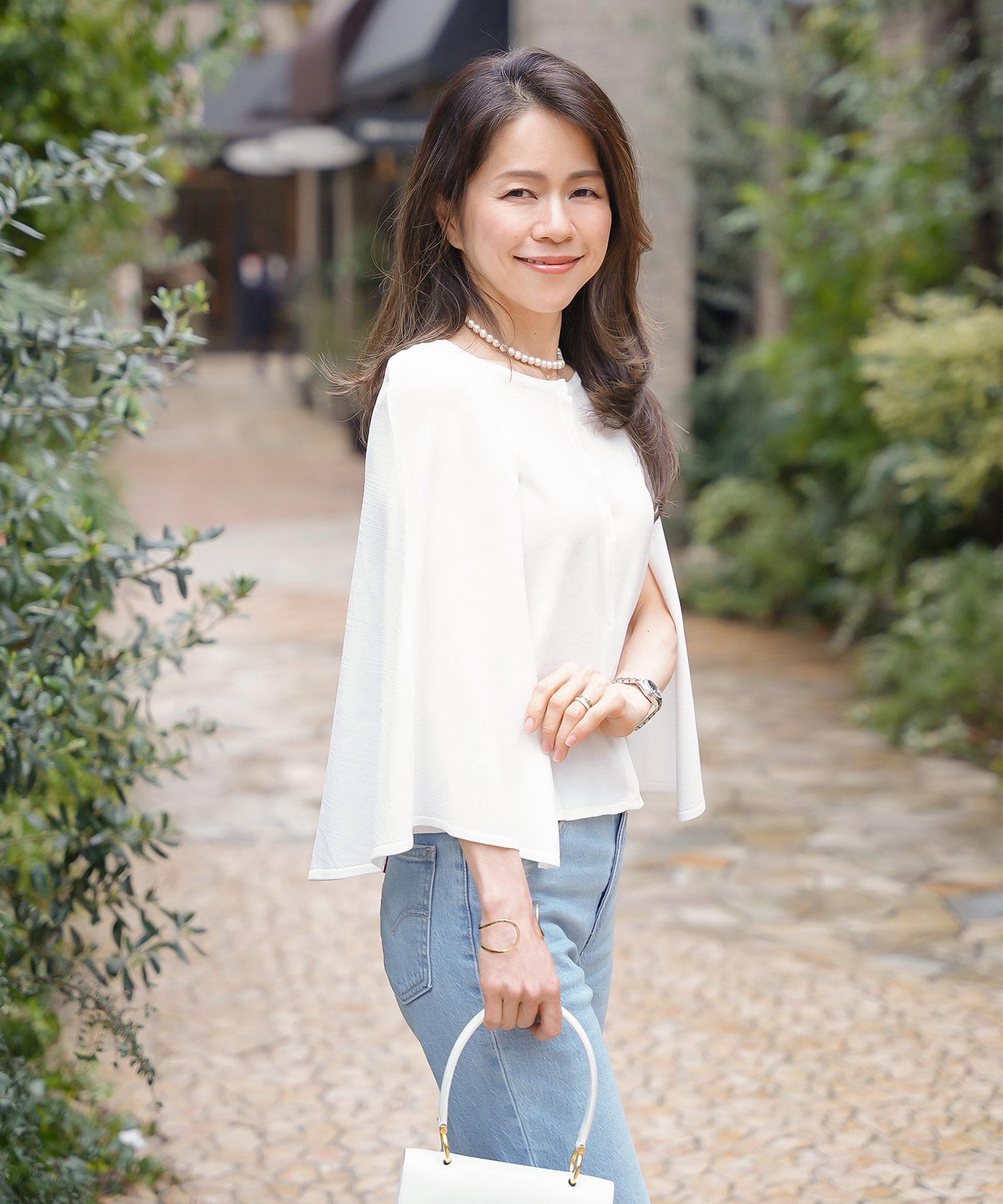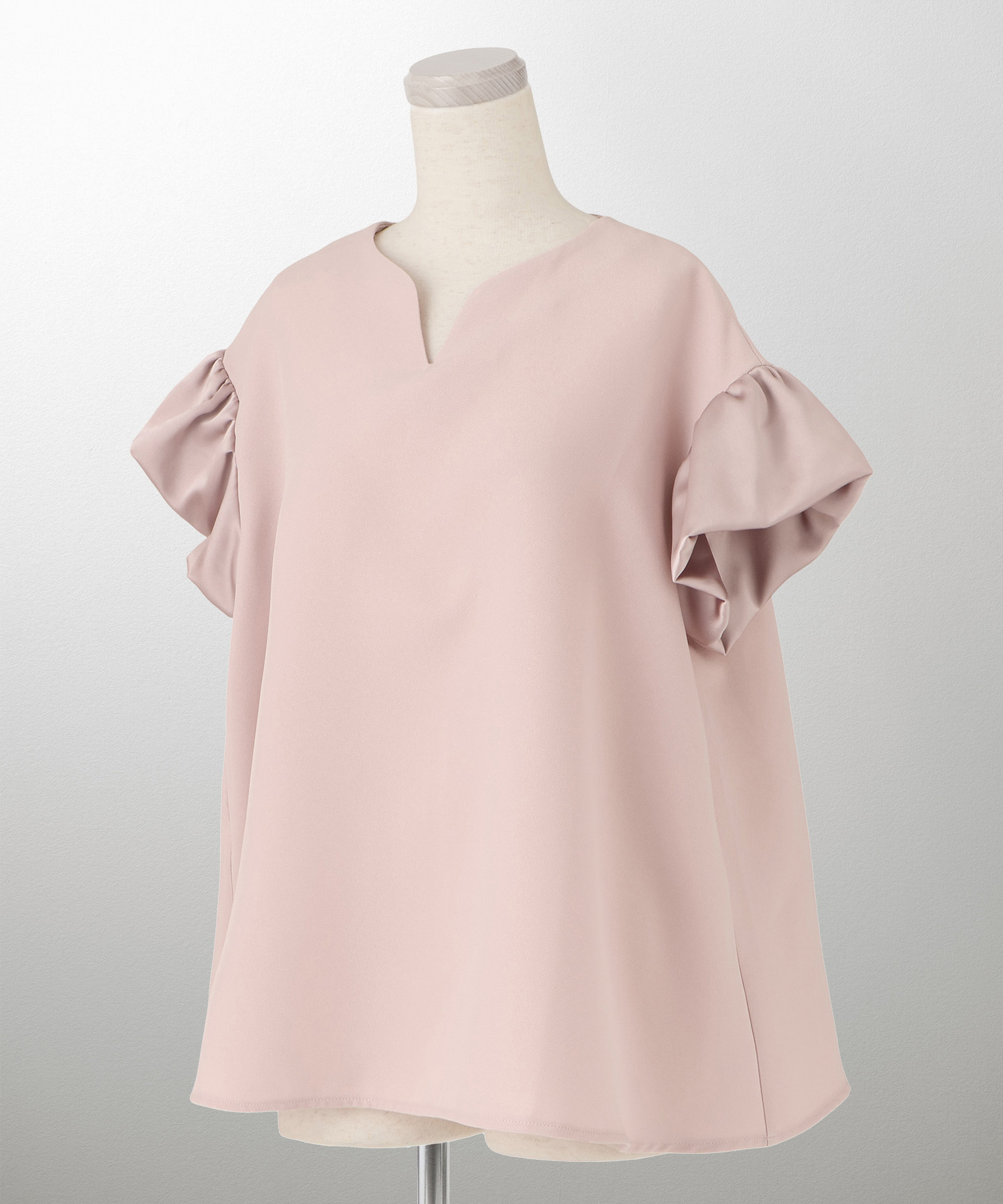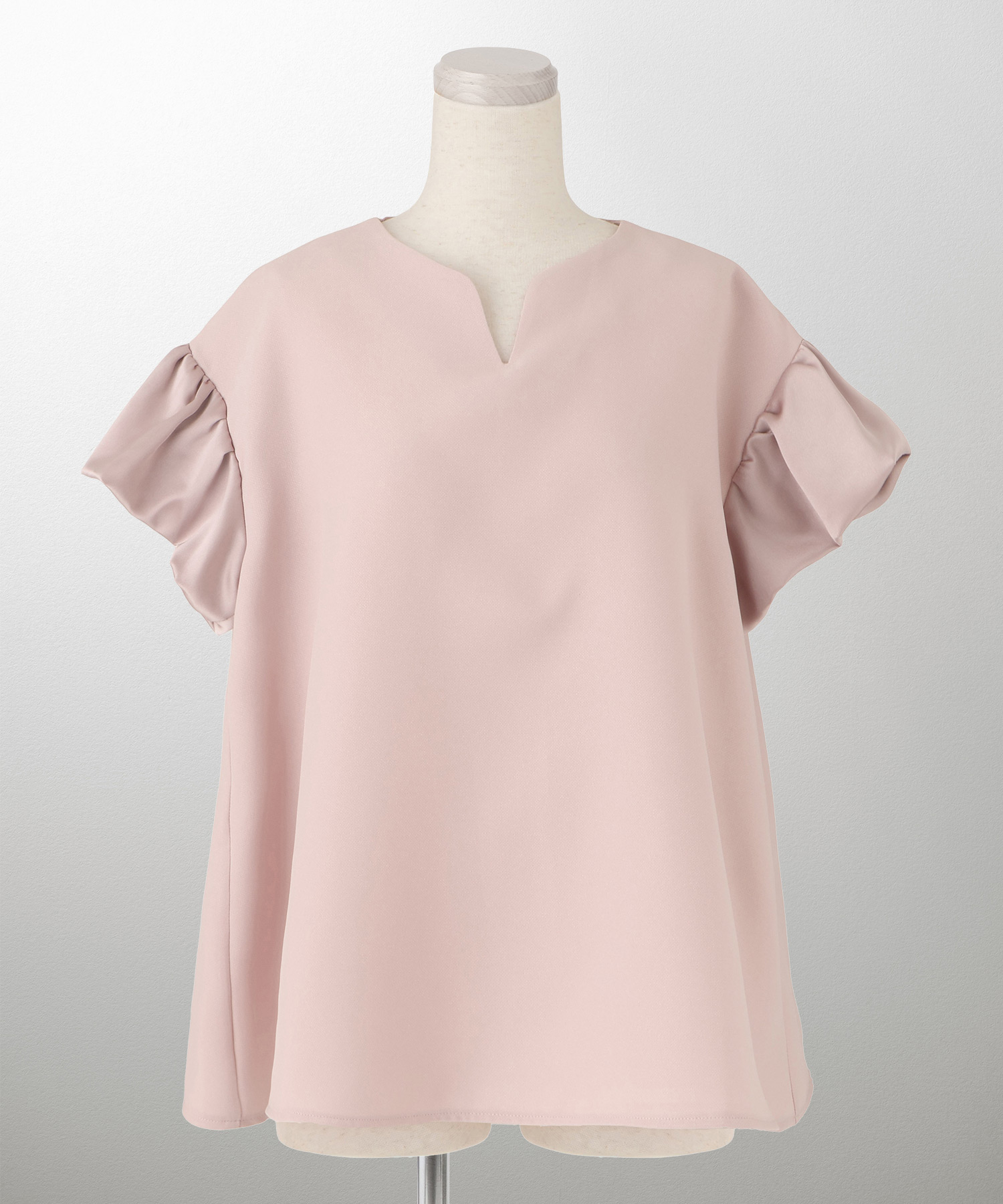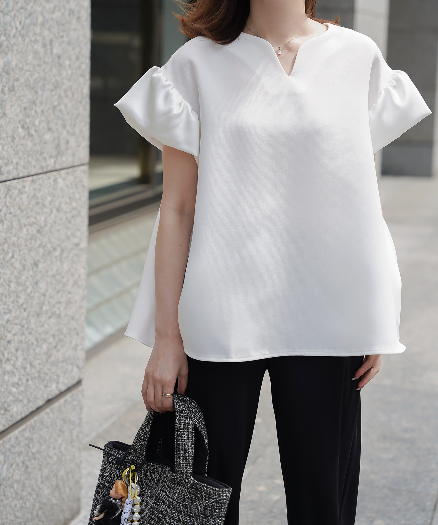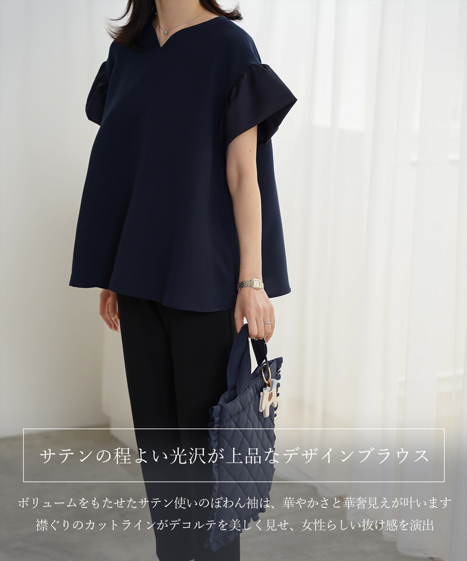 ほのかな光沢感が上品な印象を引き立てる、サテン素材のフレアスリーブブラウスです。揺れ感のある袖がやわらかく女性らしい雰囲気を演出しつつ、素材のきれいさできちんと見えも叶えてくれます。ジャケットを羽織らなくても顔まわりが華やぎやすく、会食やレストランなど、少し品よく見せたい場面にも取り入れやすいアイテムです。