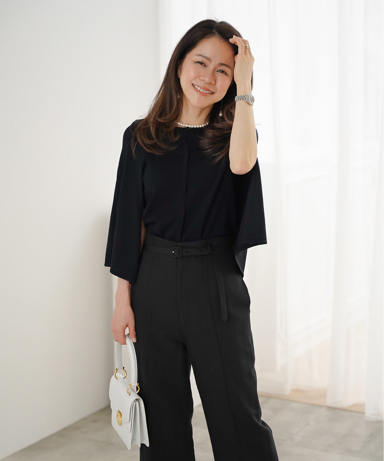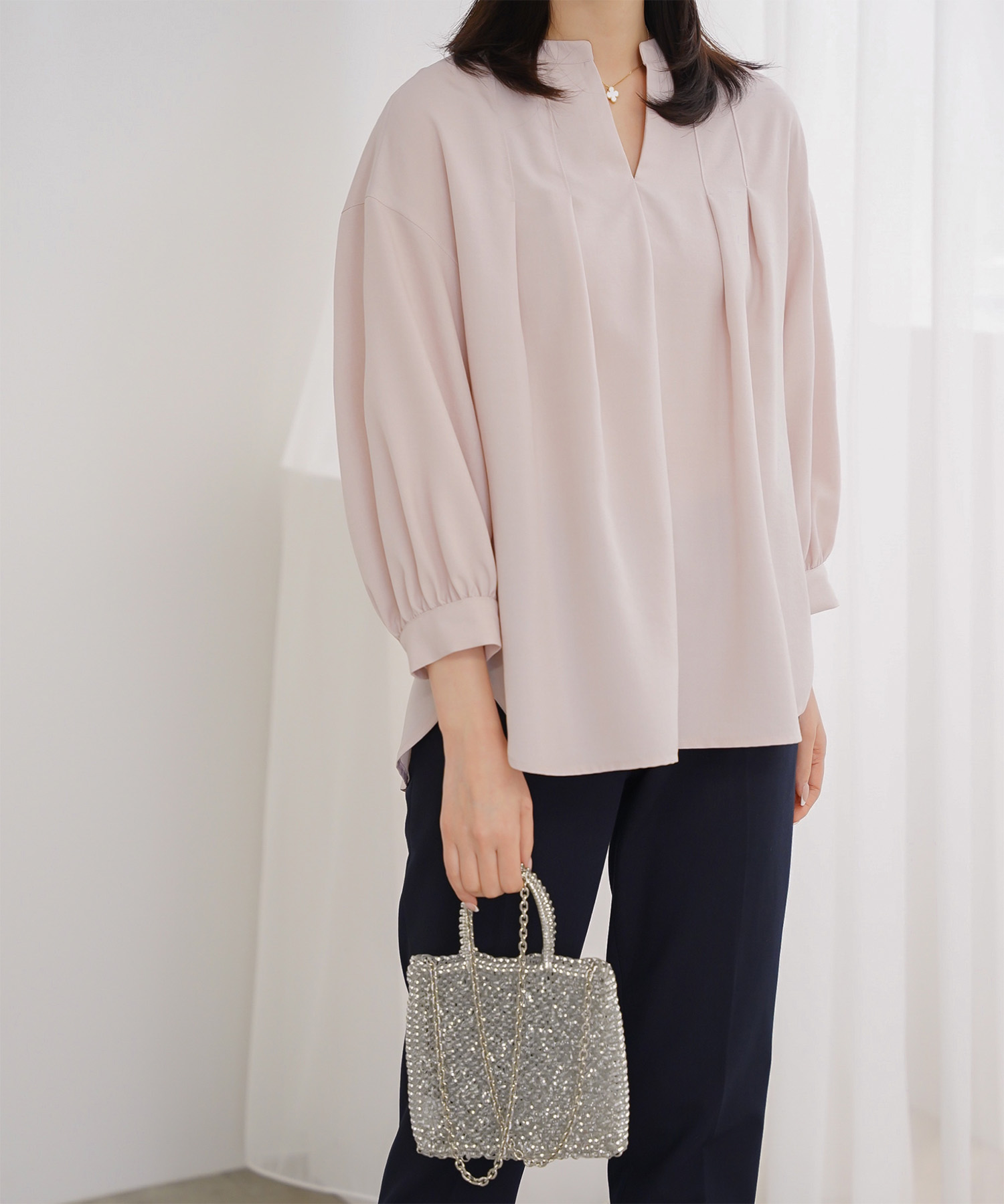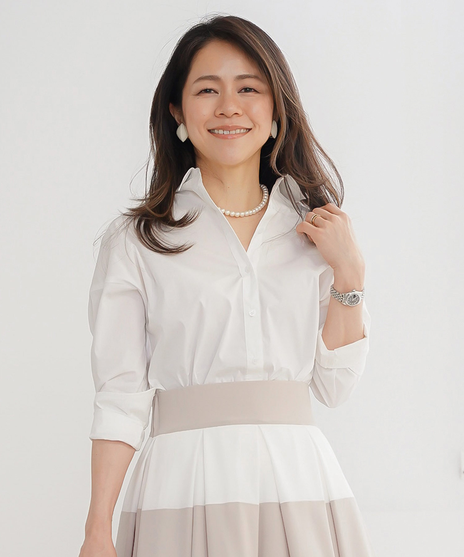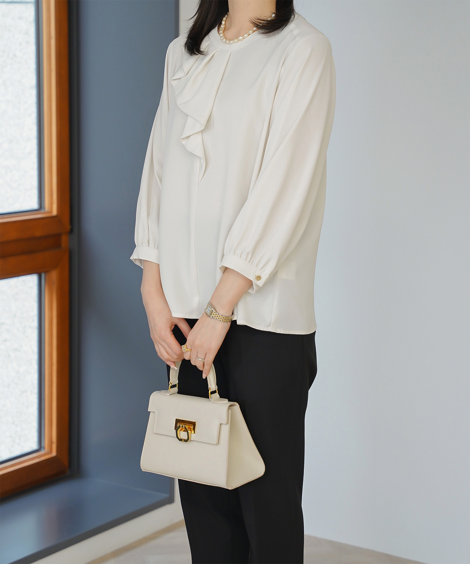 ジャケットなしでもきちんと見えを意識したい日に取り入れやすい、上品な印象のトップスです。顔まわりをすっきり見せながら、ほどよい華やかさも添えてくれるため、取引先訪問や学校行事、きれいめなランチ会など幅広いシーンになじみやすいのが魅力。シンプルなボトムスと合わせるだけでも整いやすく、スマートカジュアルを意識した装いにも活躍してくれます。