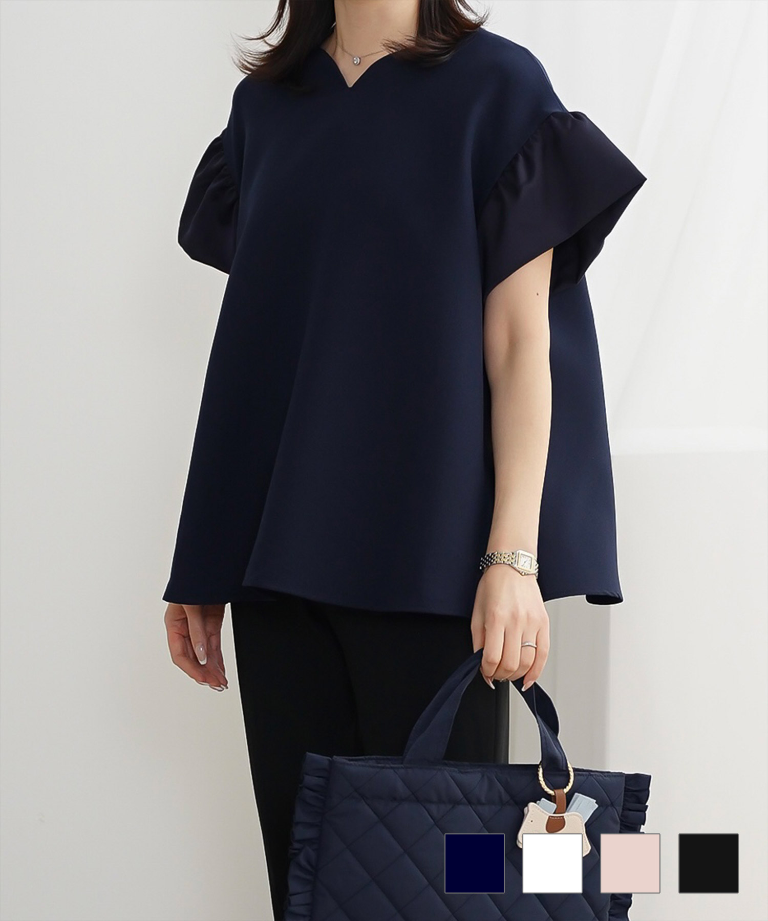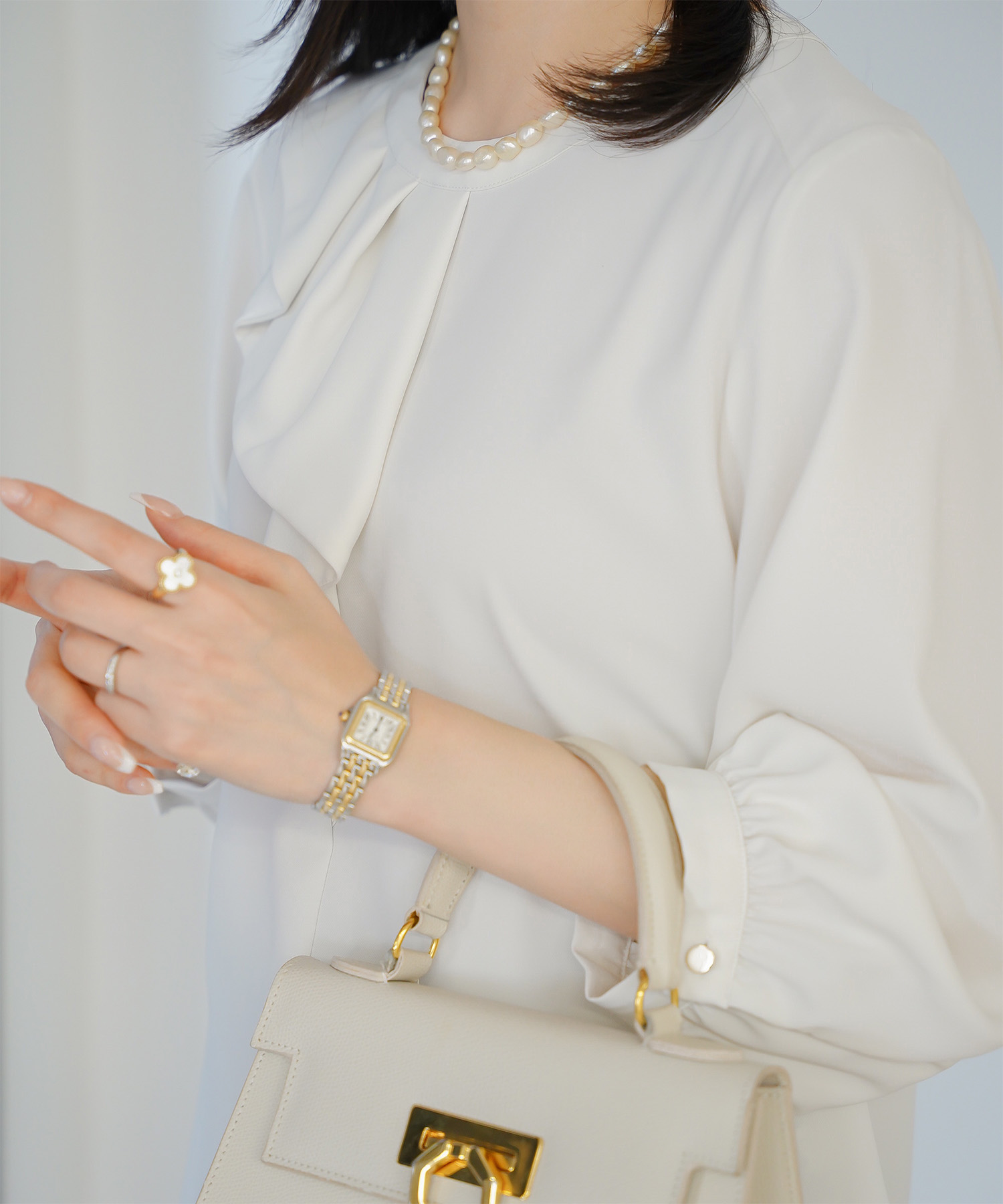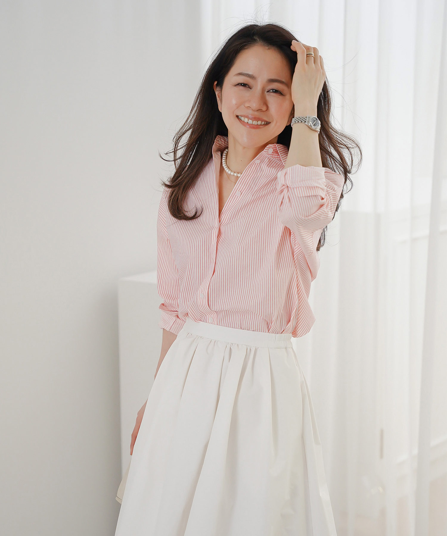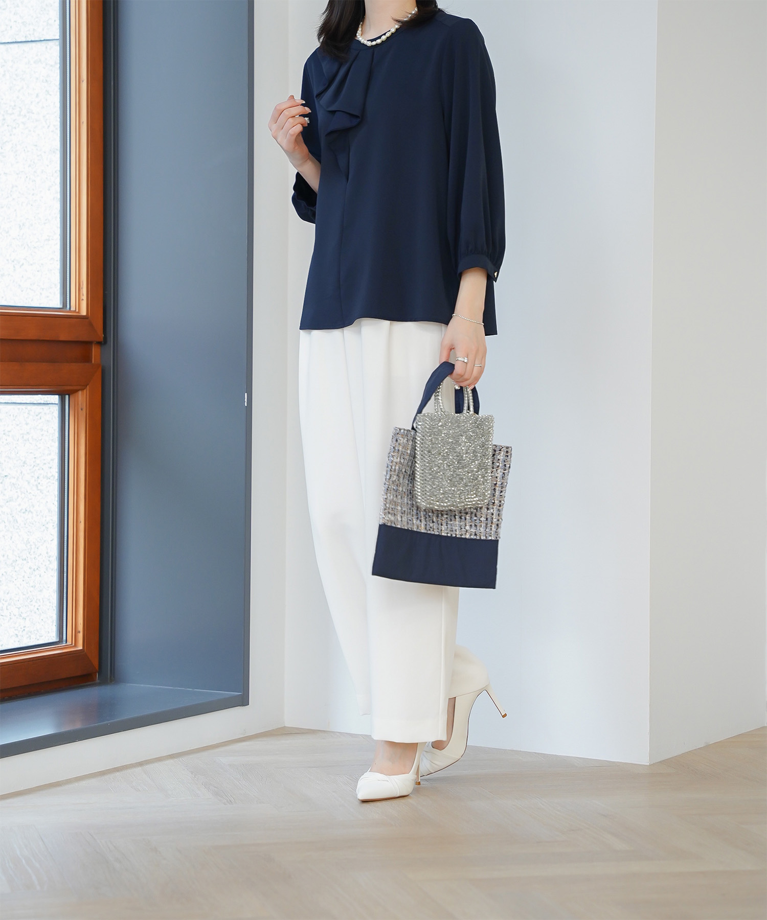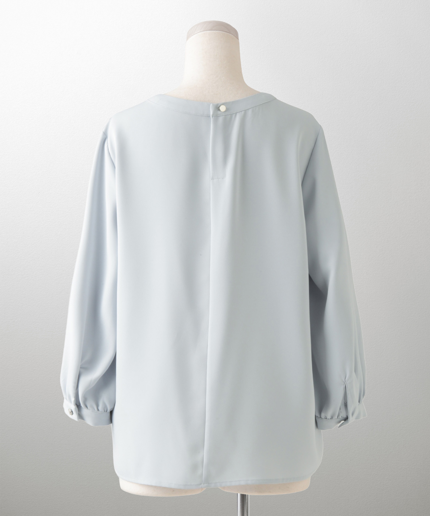 ジャケットなしでもきちんと見えを意識したい日に取り入れやすい、上品な印象のトップスです。顔まわりをすっきり見せながら、ほどよい華やかさも添えてくれるため、取引先訪問や学校行事、きれいめなランチ会など幅広いシーンになじみやすいのが魅力。シンプルなボトムスと合わせるだけでも整いやすく、スマートカジュアルを意識した装いにも活躍してくれます。