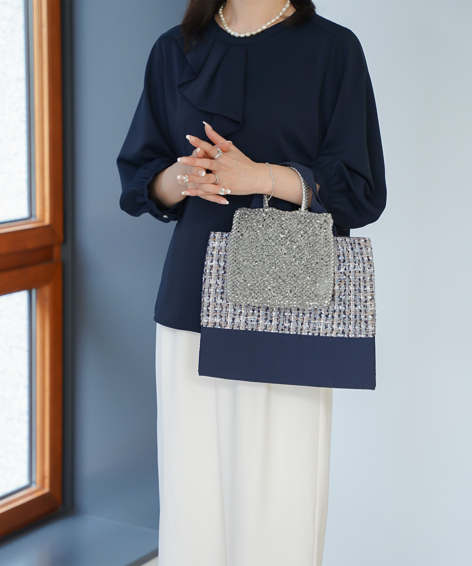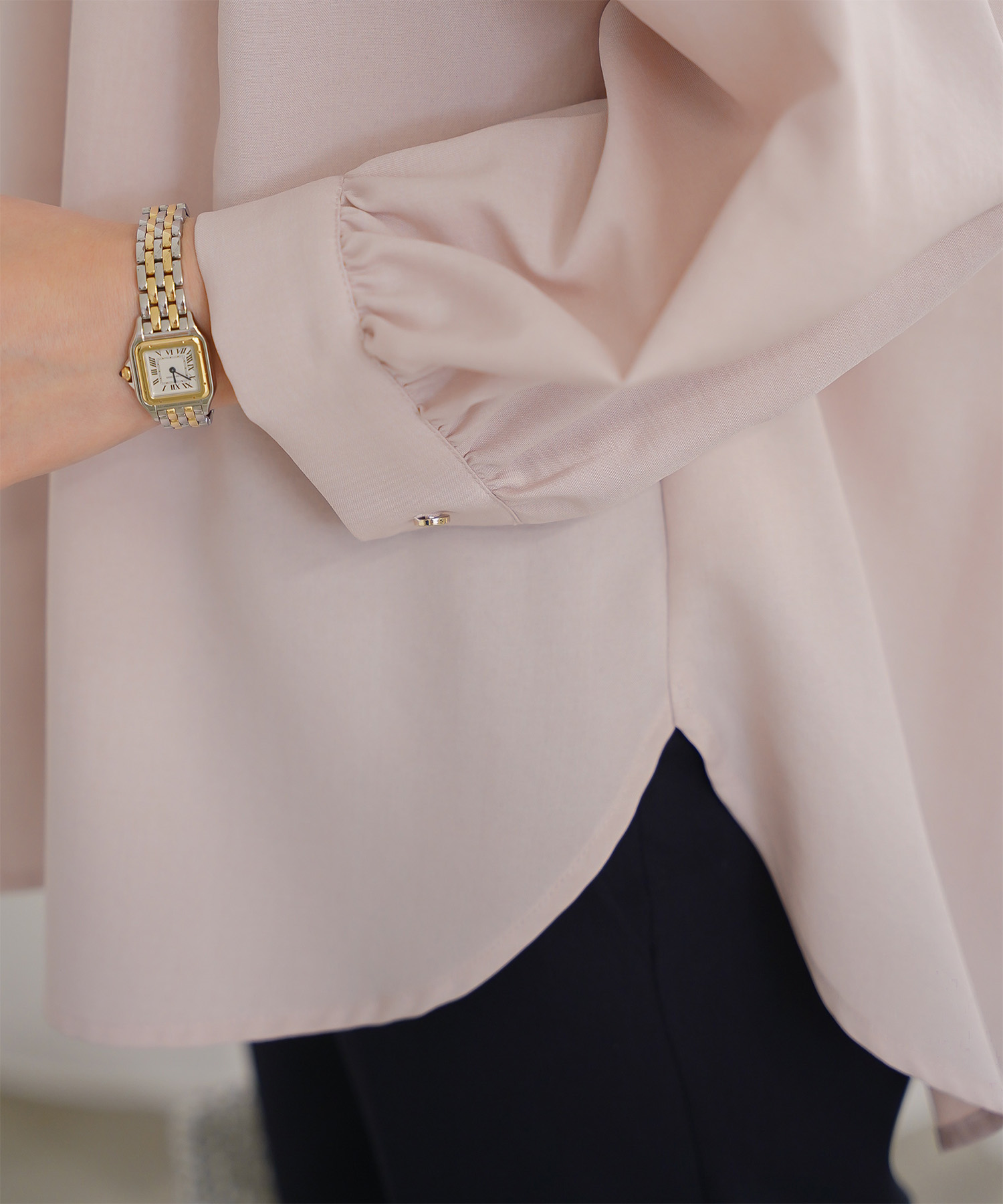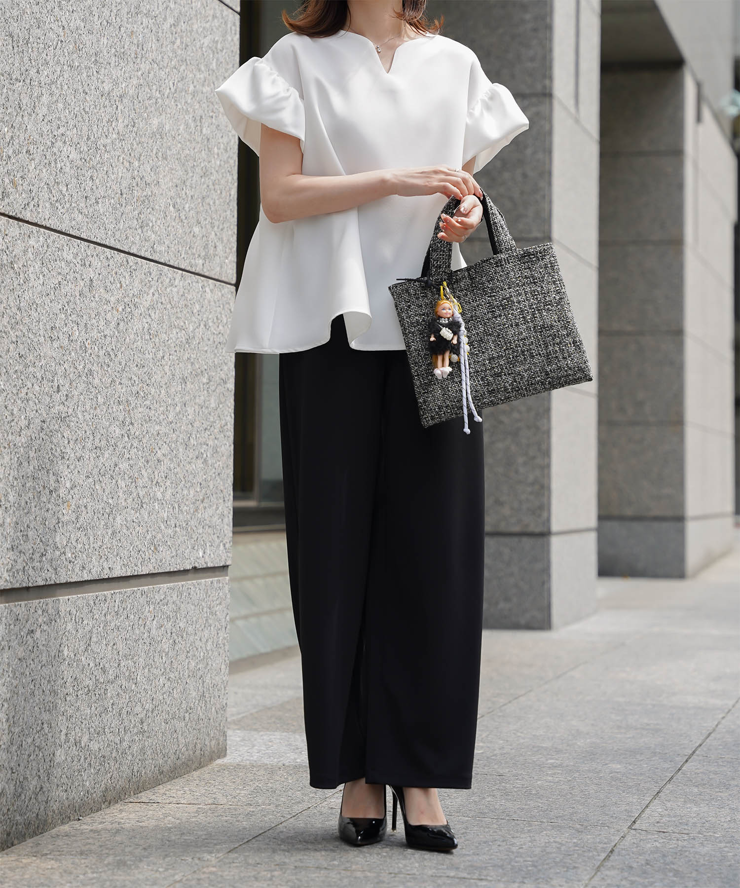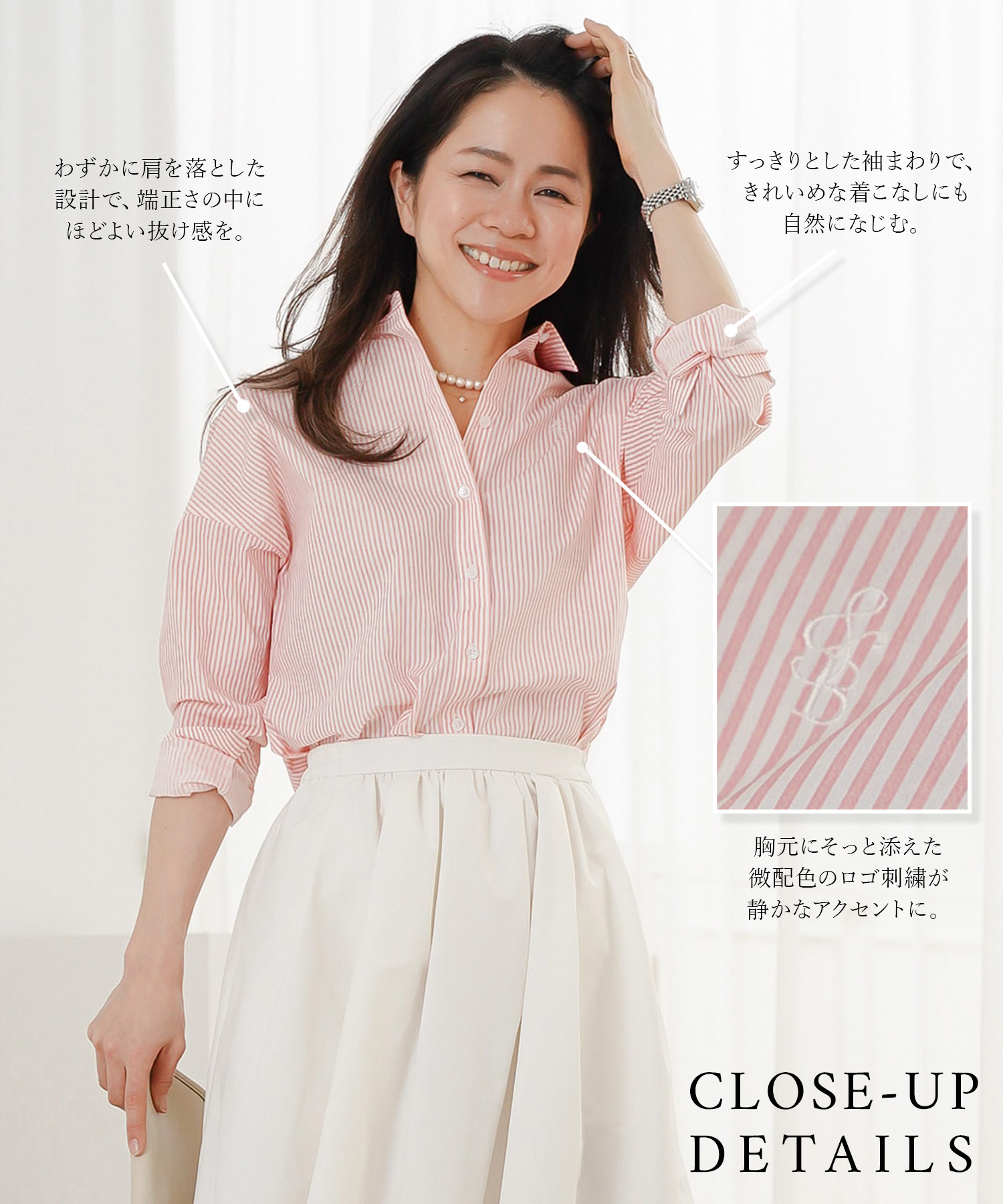 ジャケットなしでもきちんと見えを意識したい日に取り入れやすい、上品な印象のトップスです。顔まわりをすっきり見せながら、ほどよい華やかさも添えてくれるため、取引先訪問や学校行事、きれいめなランチ会など幅広いシーンになじみやすいのが魅力。シンプルなボトムスと合わせるだけでも整いやすく、スマートカジュアルを意識した装いにも活躍してくれます。
