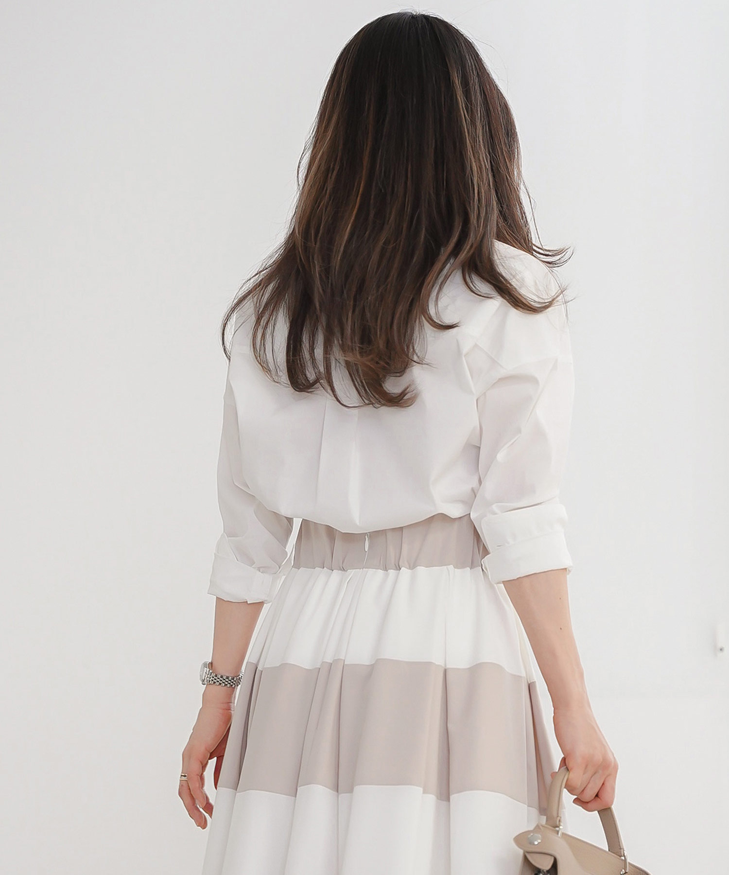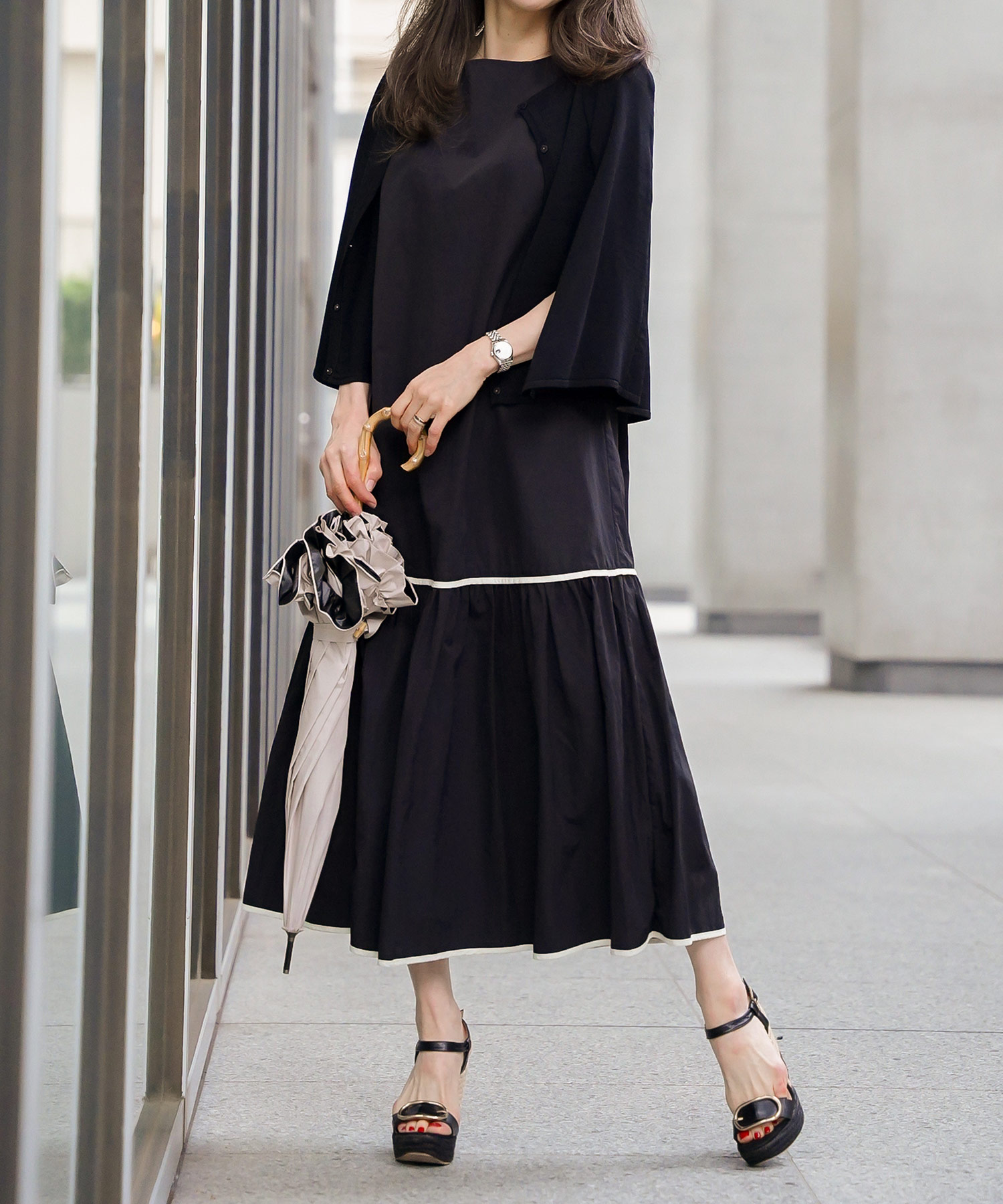 一枚で上品な印象に整う、ホールガーメント仕様のニットワンピースです。バイカラーの配色がさりげないアクセントになり、ジャケットなしでもきちんと感のある着こなしを作りやすいのが魅力。体のラインを拾いすぎず、すっきり見えを叶えやすいため、取引先訪問やレストランでの食事、少し品よく見せたい場面にも取り入れやすい一枚です。