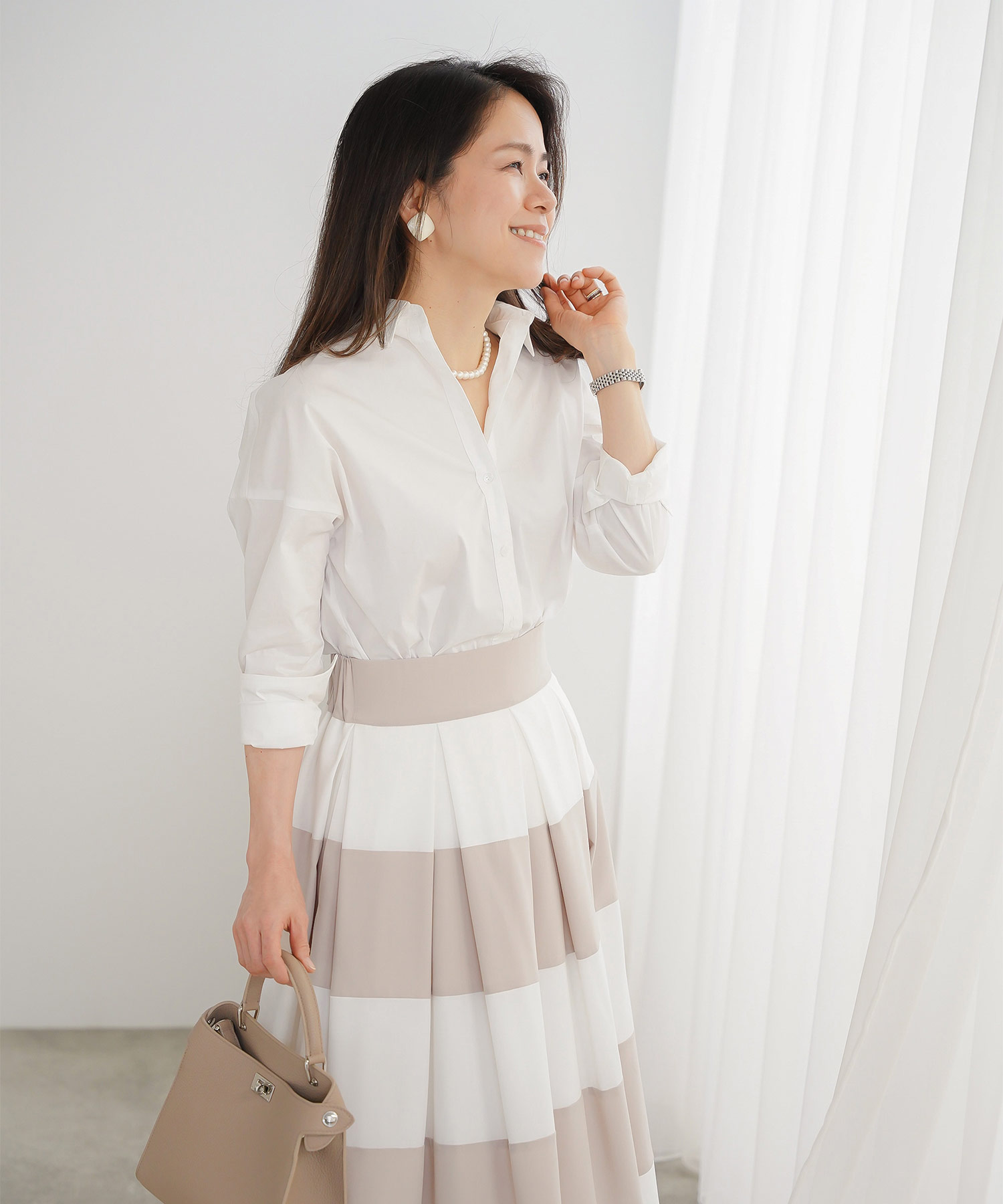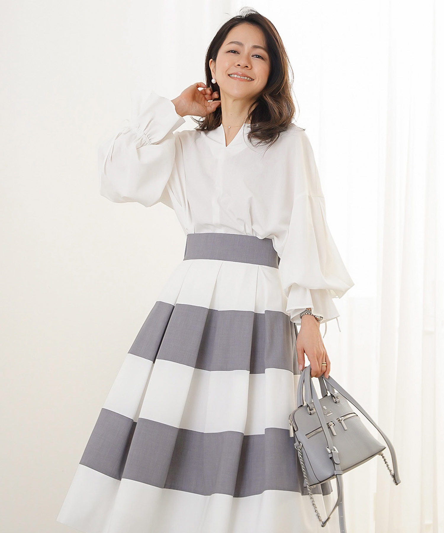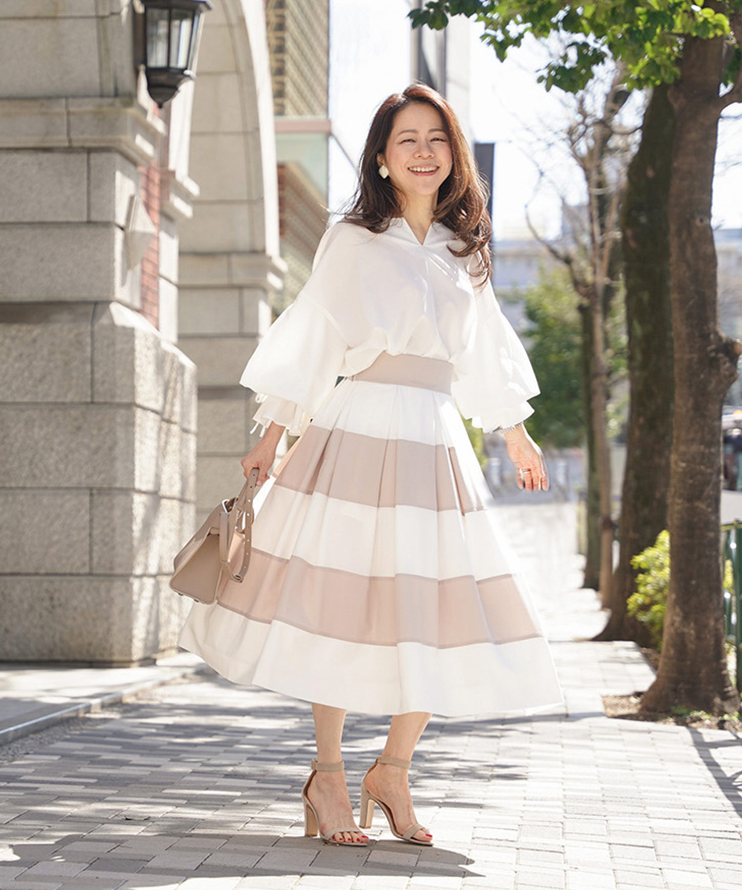 スカートは、揺れ感がきれいに出るものや、広がりすぎないシルエットを選ぶとバランスが取りやすくなります。全体をやさしい色合いでまとめると上品に見えますが、ぼやける場合は靴やバッグで少し引き締めると整いやすくなります。