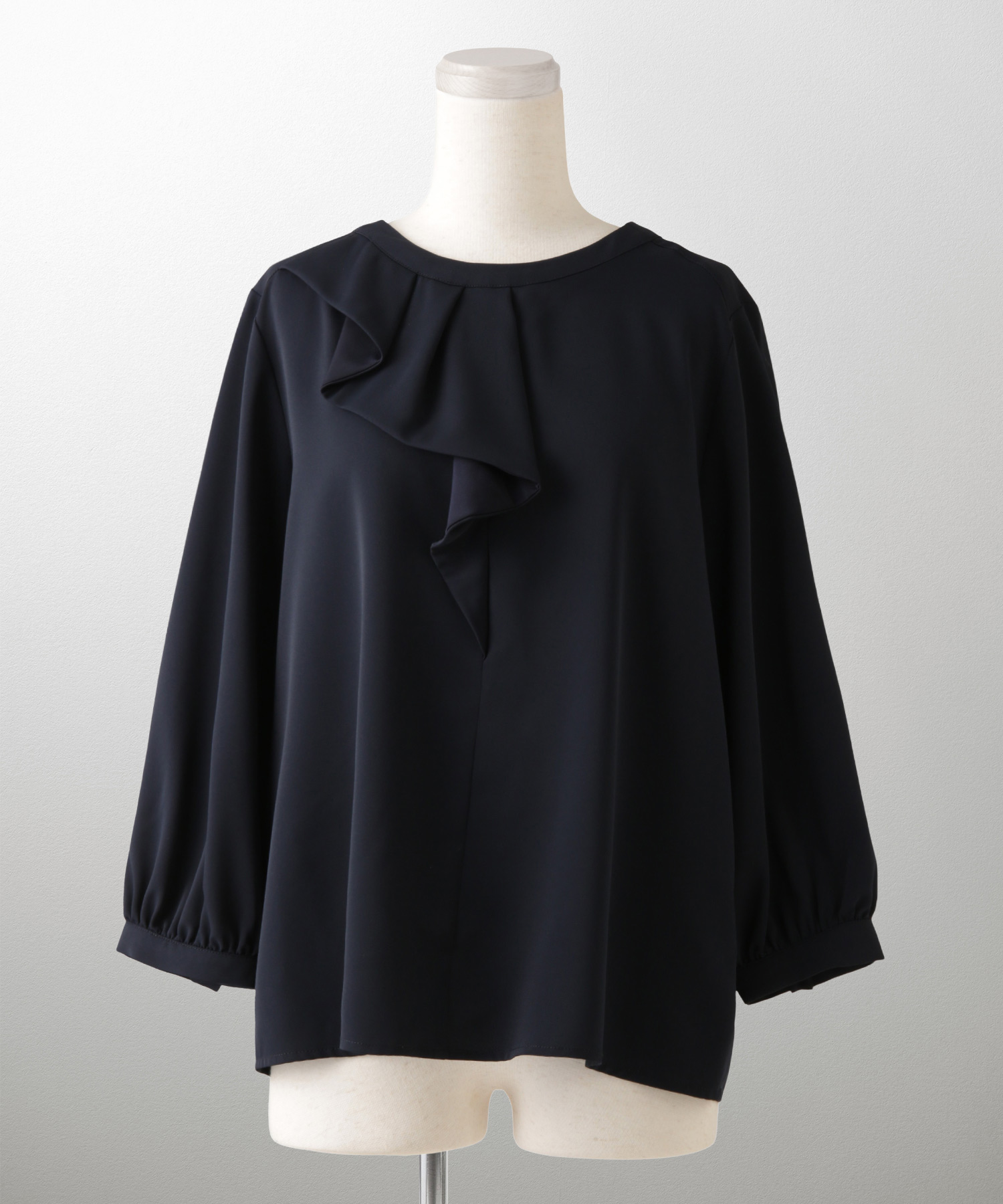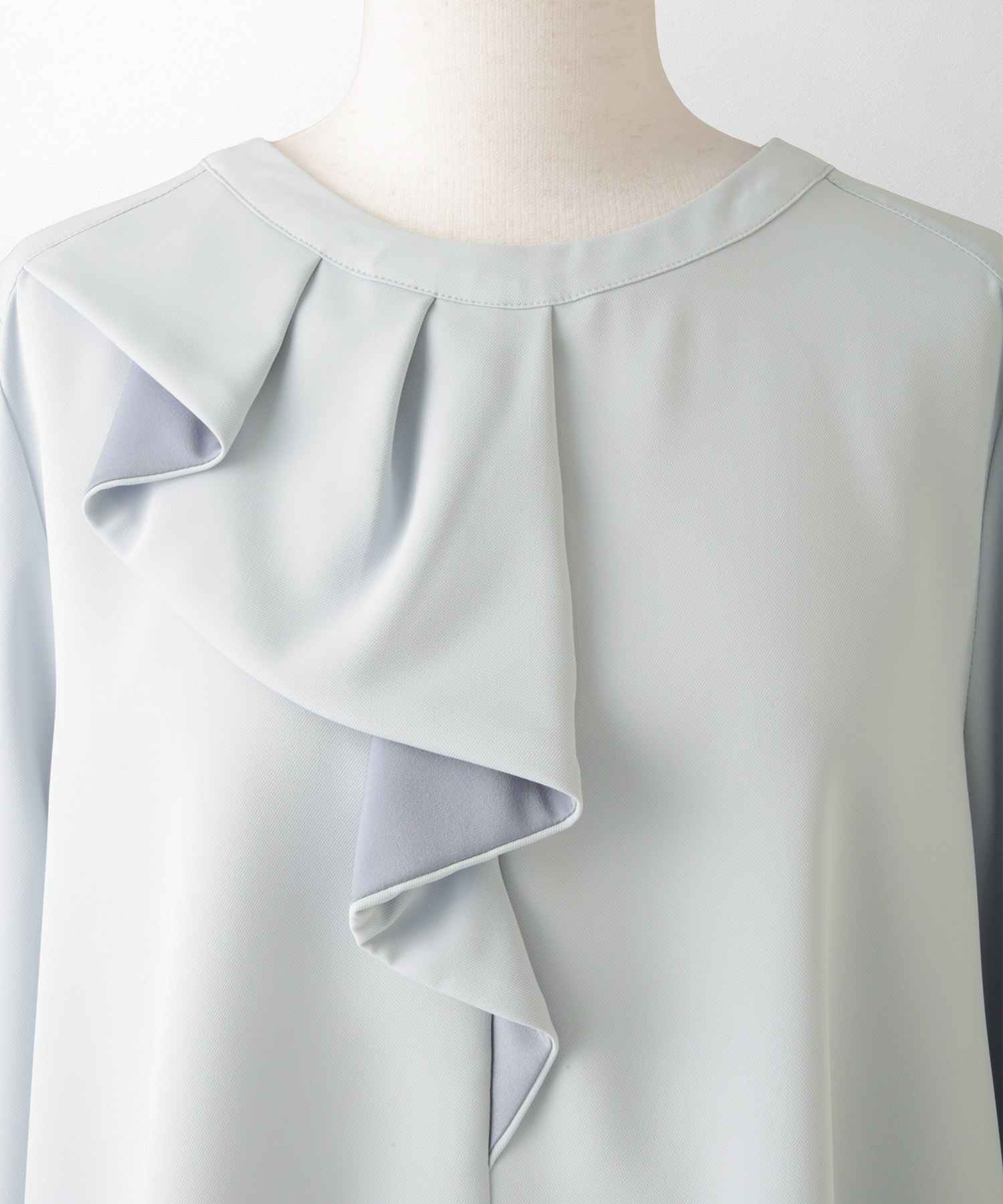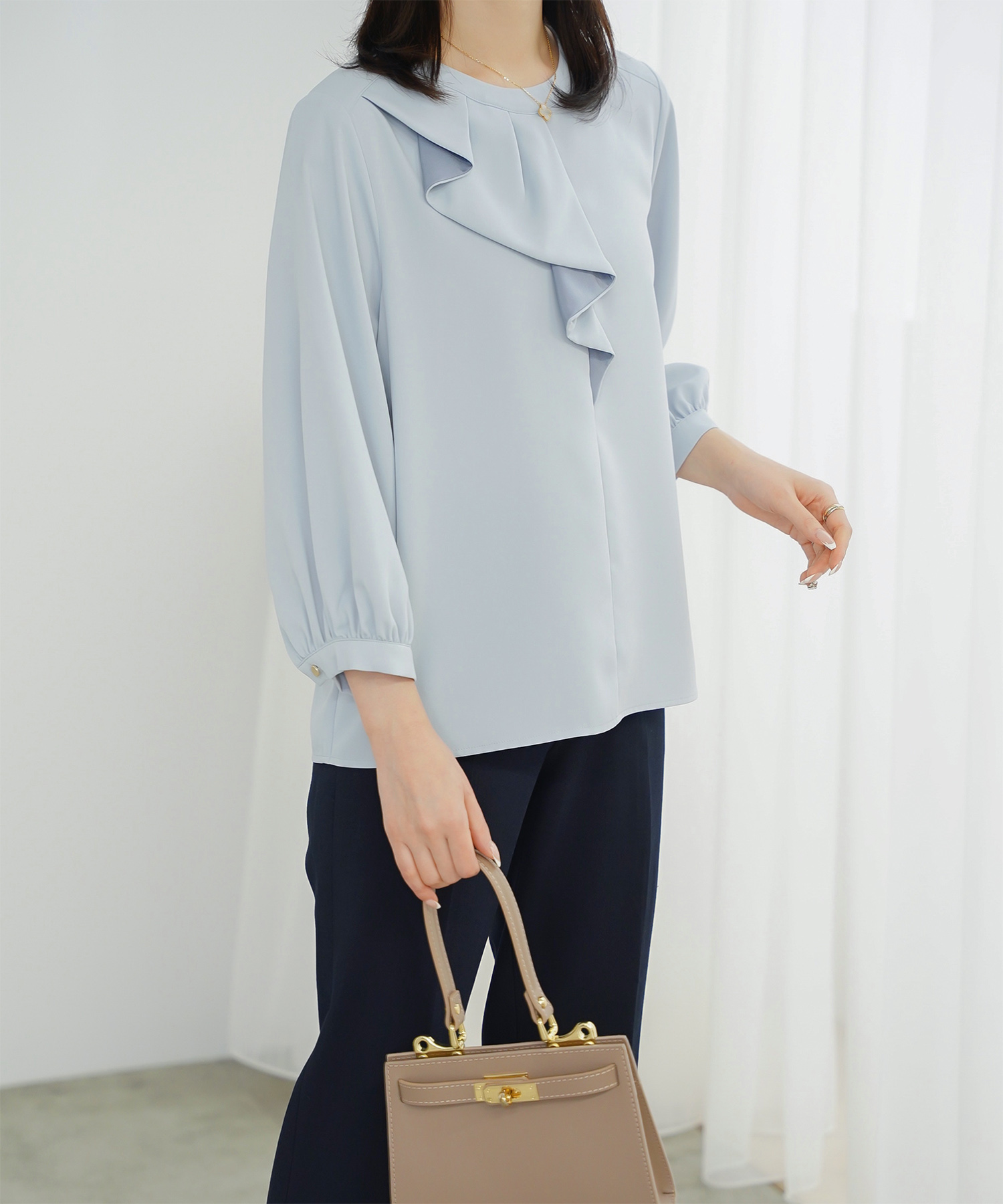 アシンメトリーにあしらわれたラッフルが印象的な、華やかさのあるブラウスです。デザイン性がありながらも派手になりすぎず、ジャケットなしのコーデにほどよい存在感を添えてくれます。シンプルなボトムスと合わせるだけで着映えしやすく、スマートカジュアルを意識した装いにも取り入れやすいアイテムです。