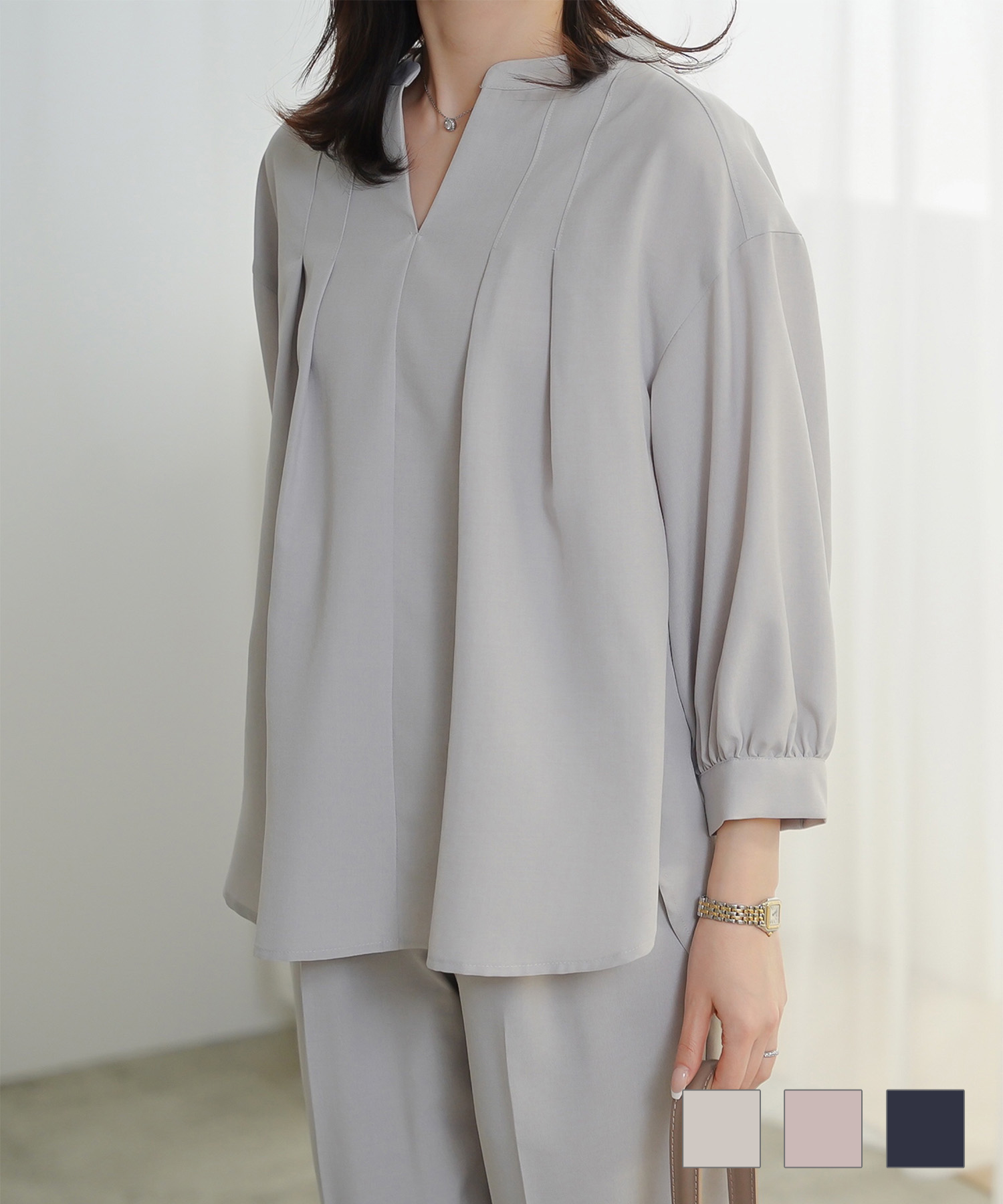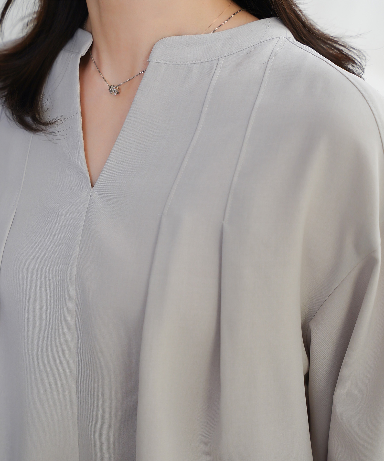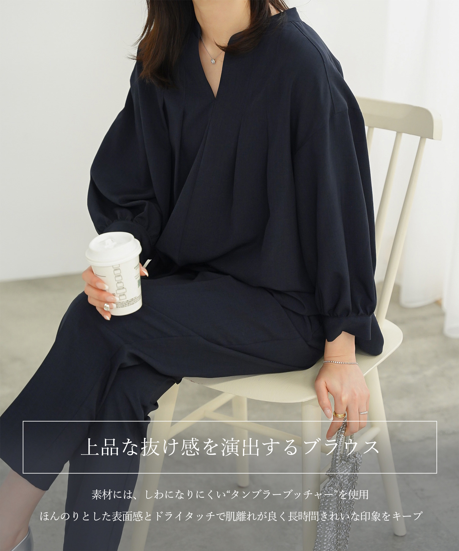すっきりとしたVネックとタックデザインで、シンプルながら上品に整うブラウスです。首元がほどよくシャープに見えるため、ジャケットなしでも顔まわりがもたつかず、洗練された印象に仕上がります。パンツにもスカートにも合わせやすく、取引先訪問や学校行事など、きれいめにまとめたい日にも取り入れやすい一枚です。