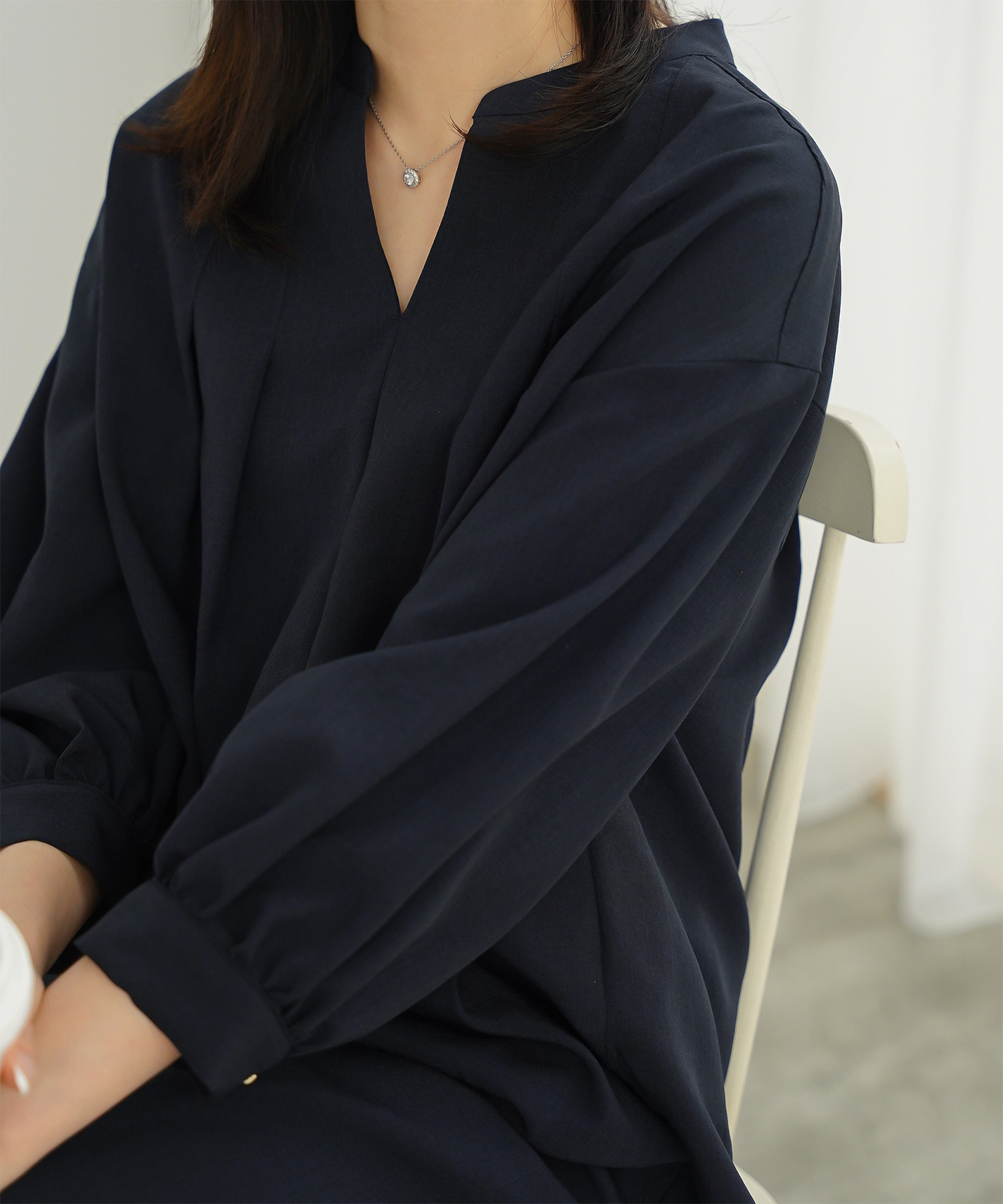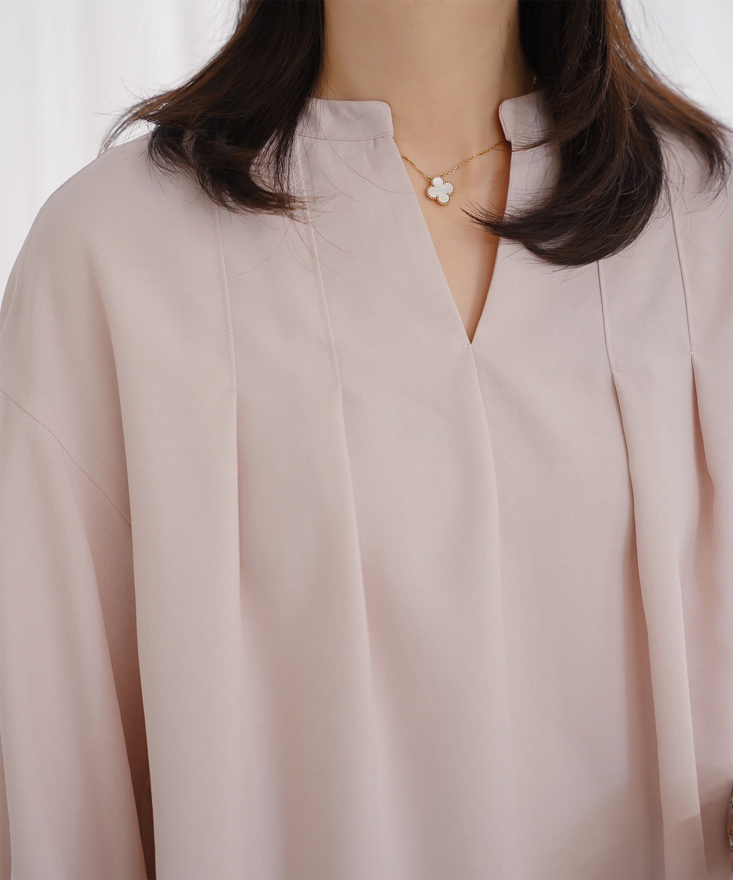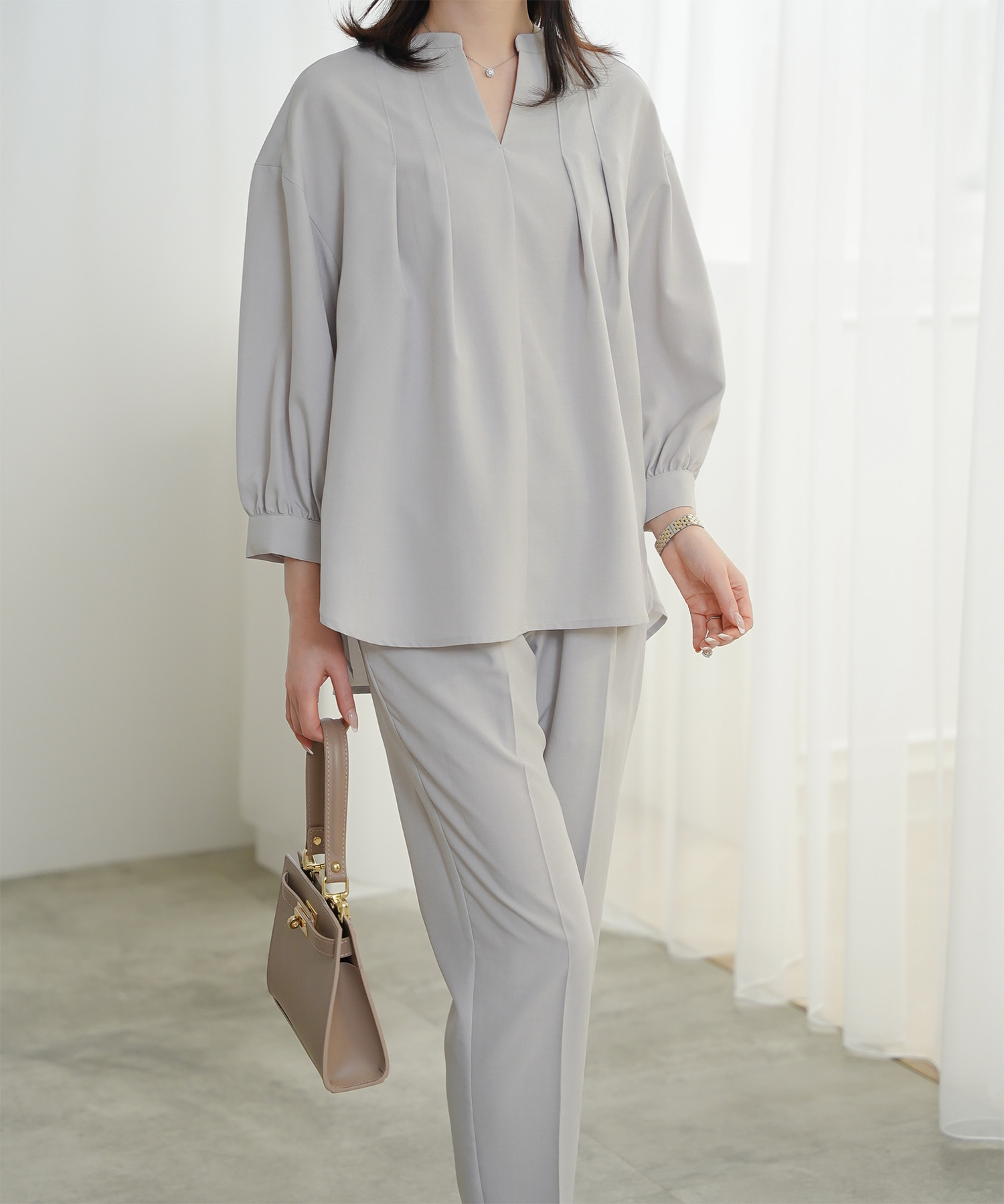 すっきりとしたVネックとタックデザインで、シンプルながら上品に整うブラウスです。首元がほどよくシャープに見えるため、ジャケットなしでも顔まわりがもたつかず、洗練された印象に仕上がります。パンツにもスカートにも合わせやすく、取引先訪問や学校行事など、きれいめにまとめたい日にも取り入れやすい一枚です。