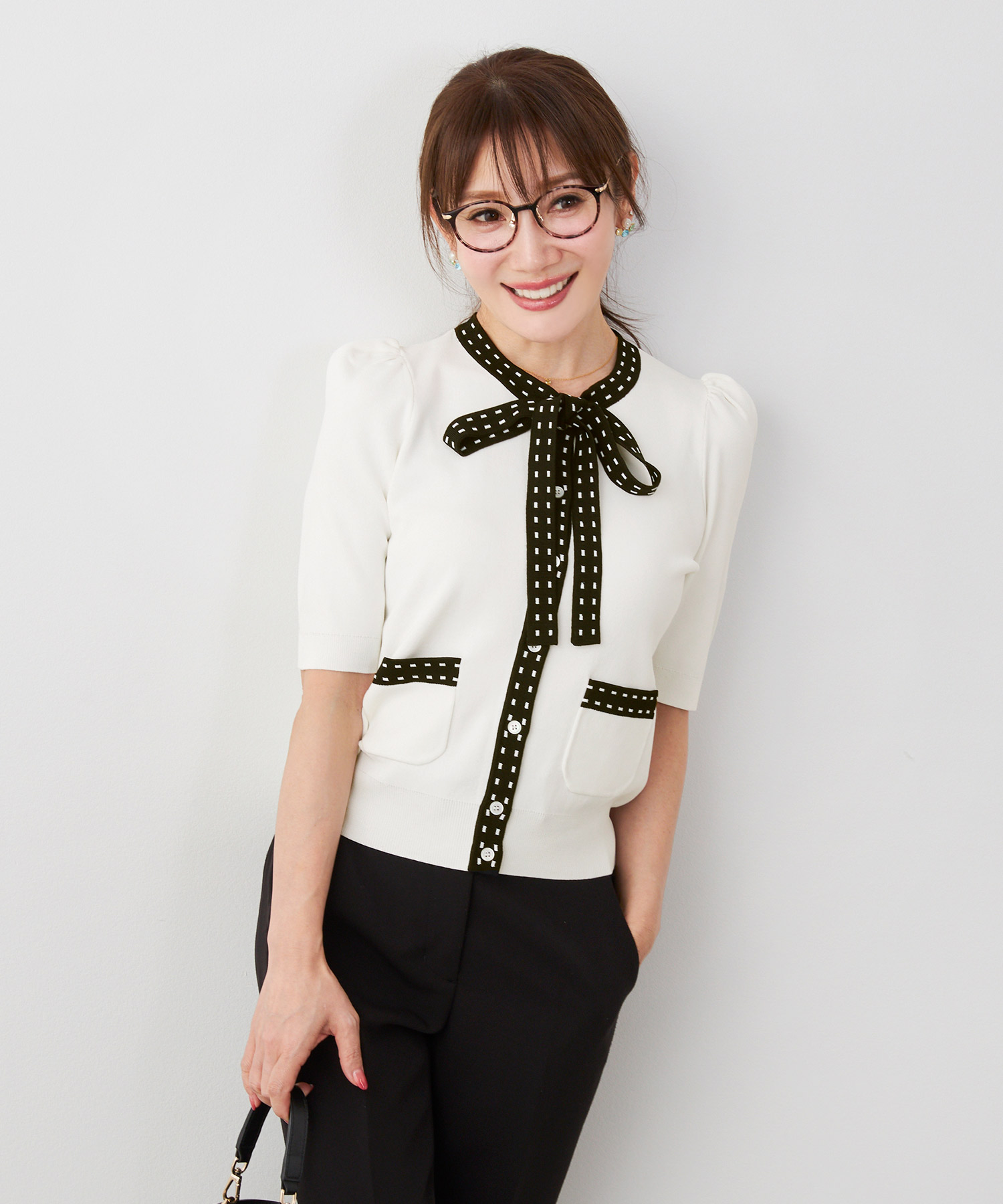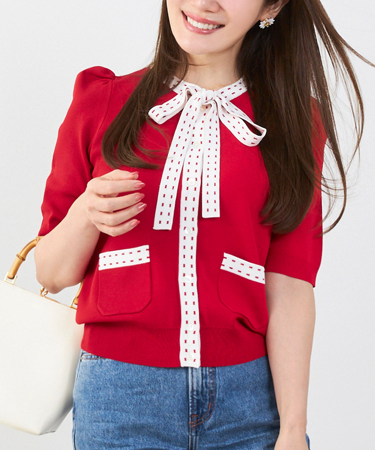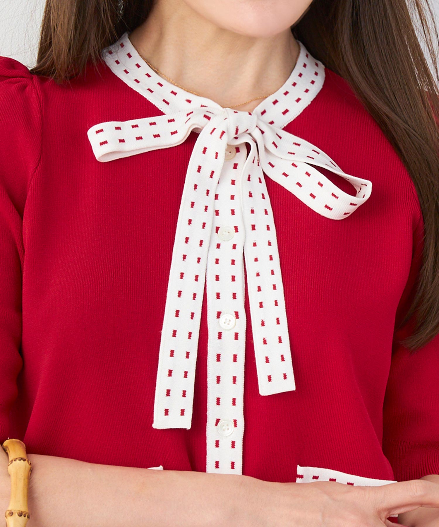 ステッチ ジャガード ボウタイ5分袖 カーディガン(Liala×PG)¥9,350(税込)