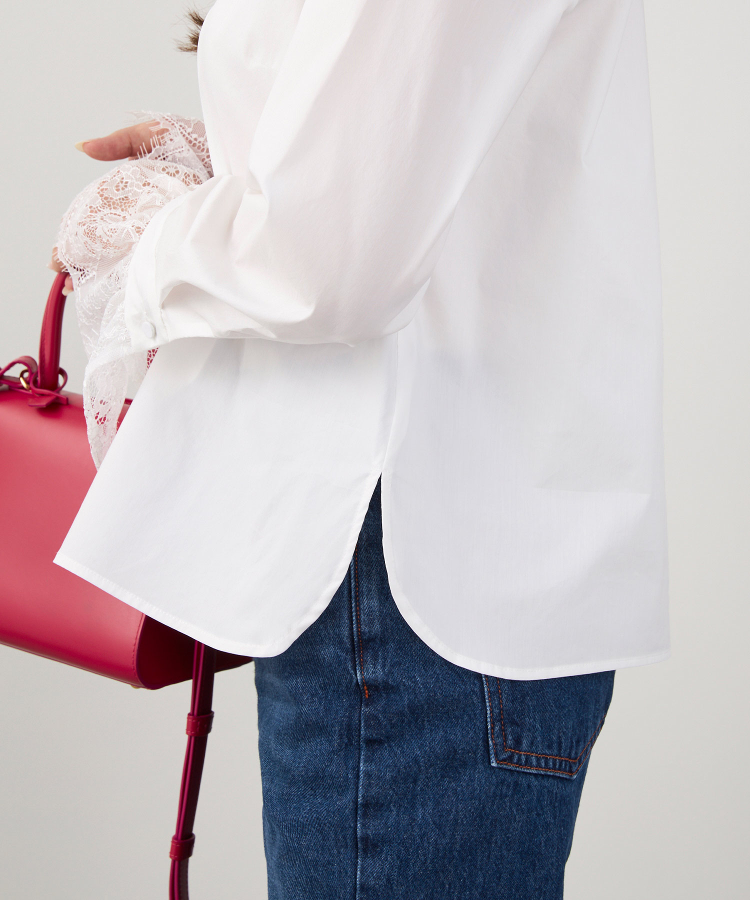 顔まわりと手元に繊細な華やかさを添えてくれる、レースフリル付きのブラウスです。きれいめな印象がありながら甘くなりすぎず、ジャケットなしでも装いにきちんと感を加えたい日に活躍します。襟と袖口のディテールがさりげないアクセントになり、シンプルなパンツやスカートと合わせるだけでも上品にまとまりやすいのが魅力です。