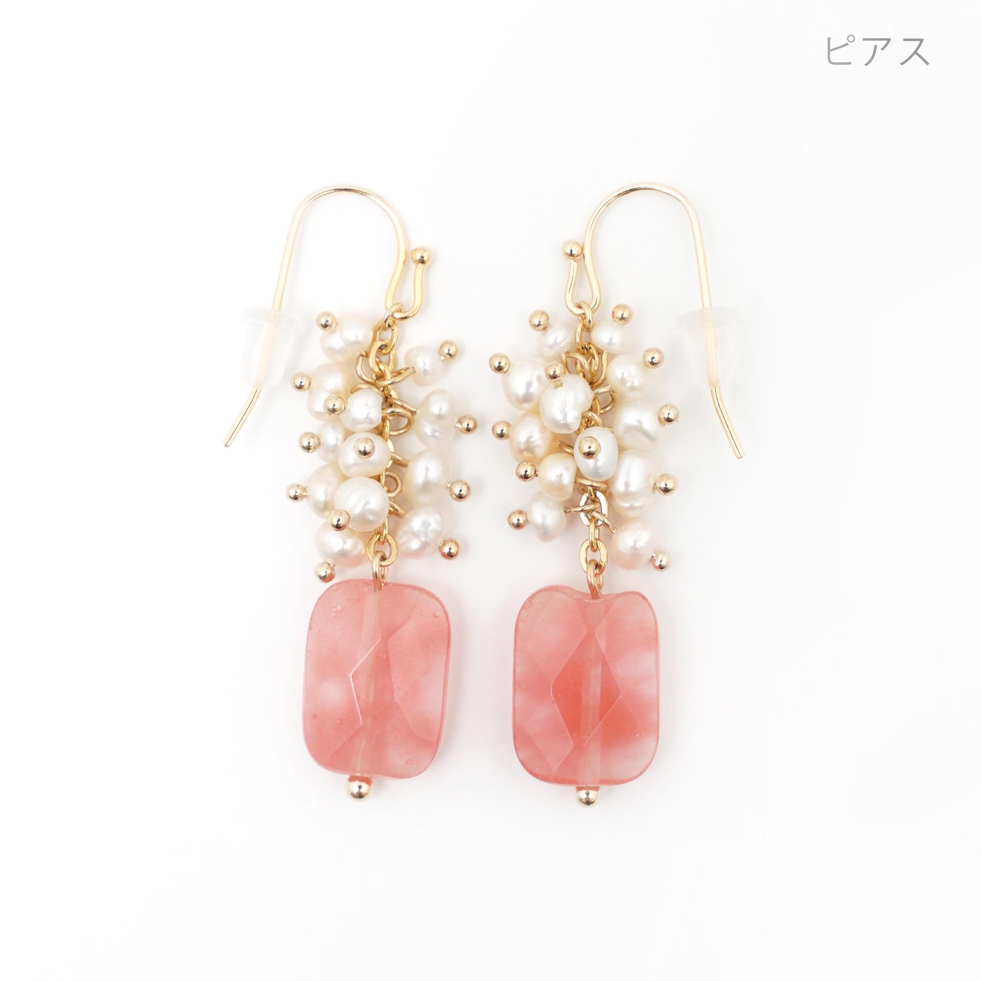 ピンクのマーブルストーンに淡水パールを合わせた春の陽気にぴったりなピアス。
