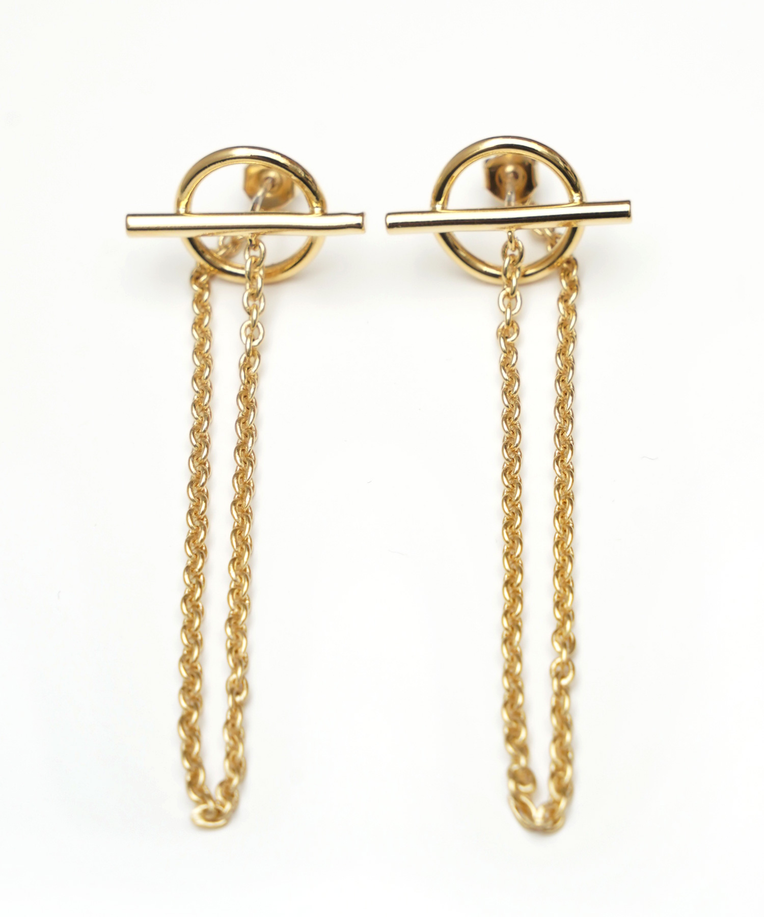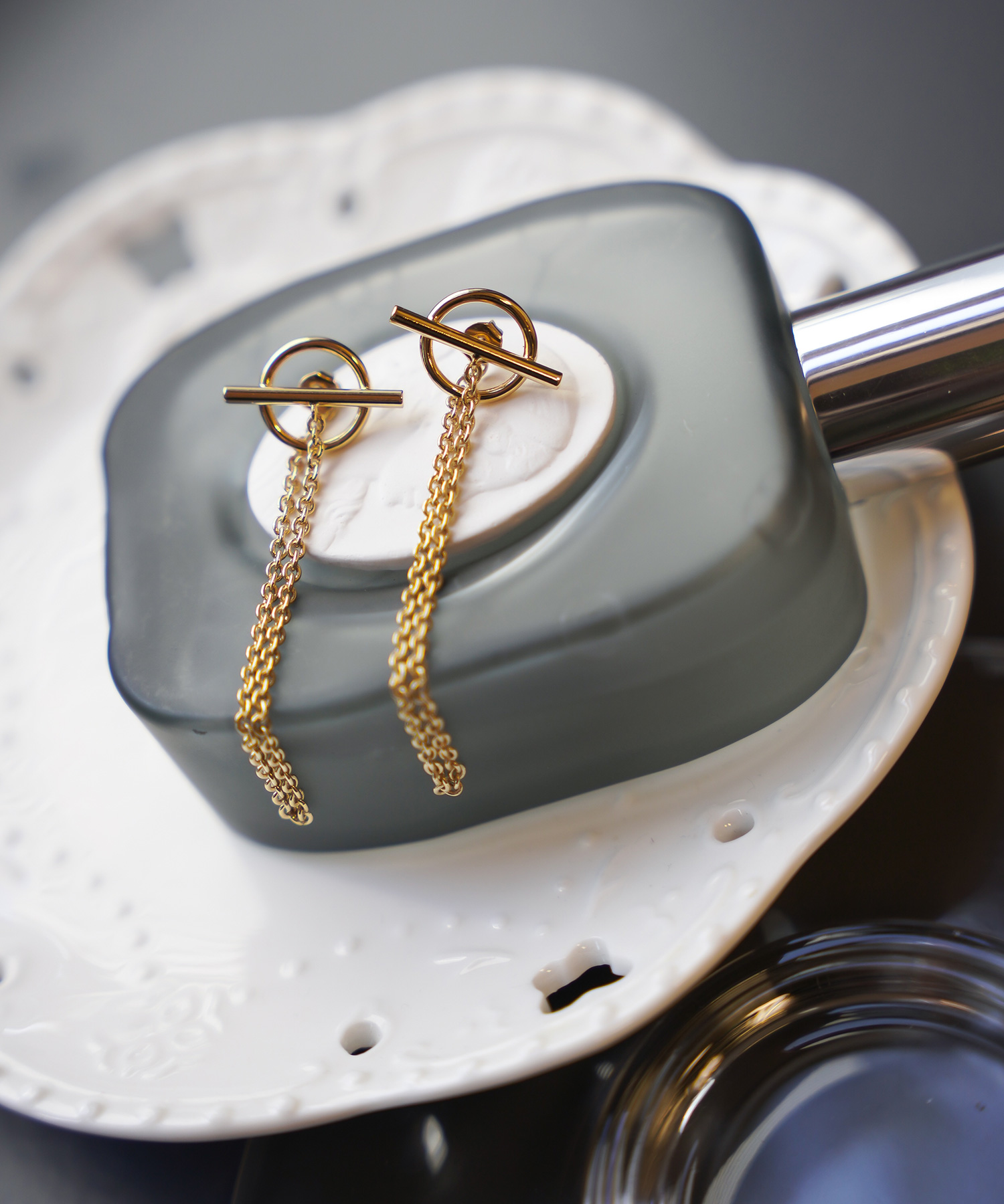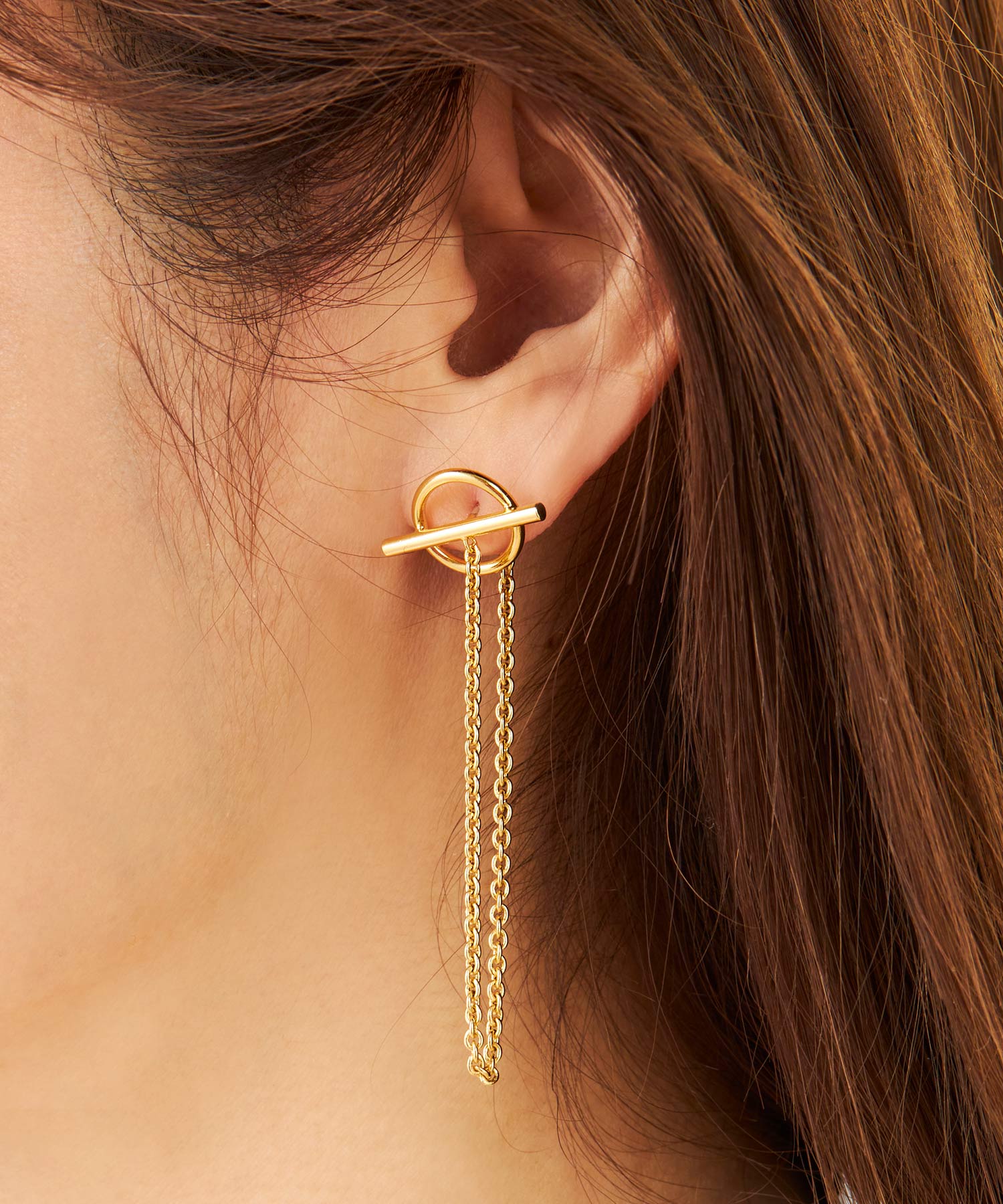 さらりと流れるロングチェーンが顔まわりで揺れ動く、表情豊かなシンプルピアスです。