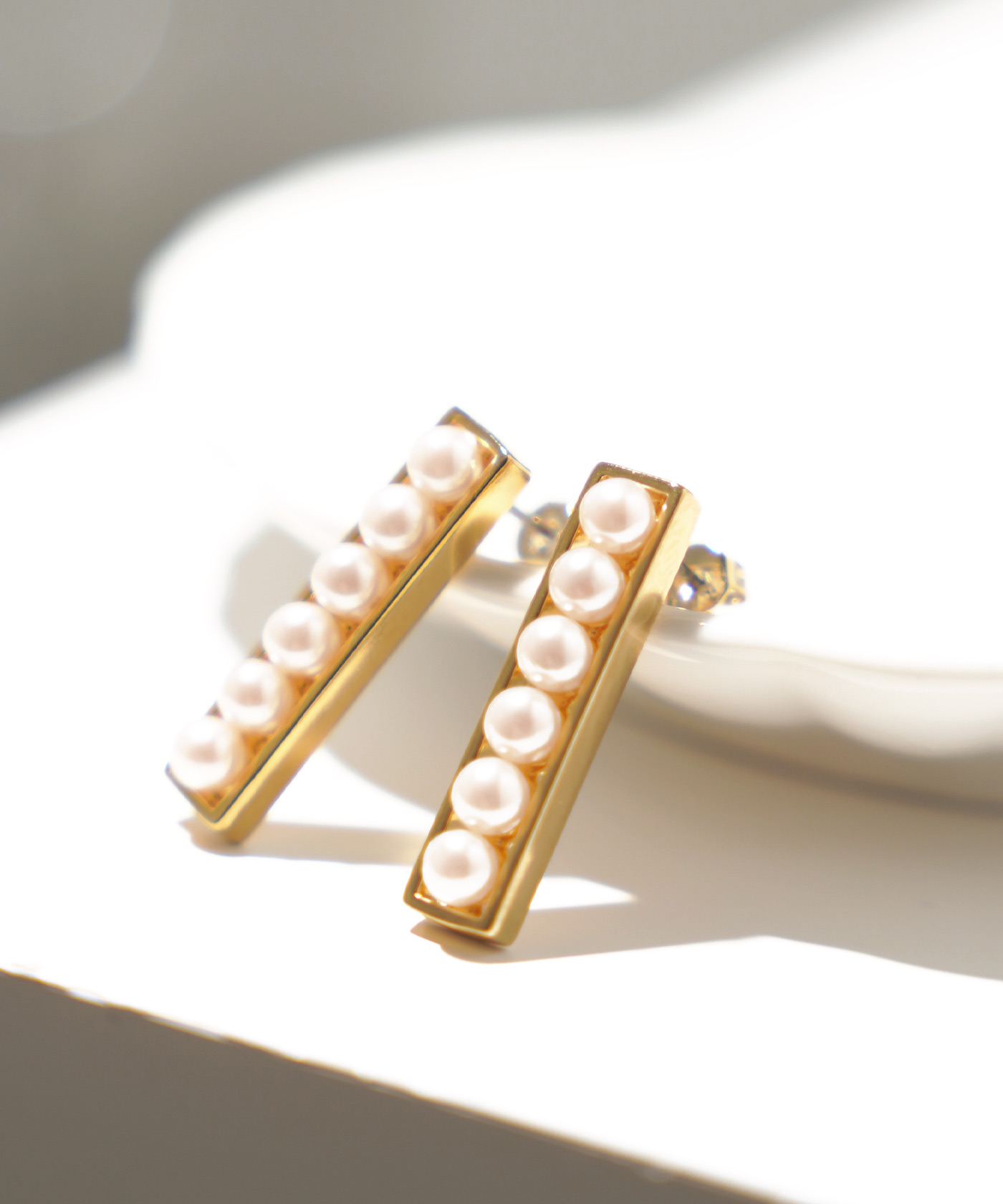 長方形の型にすっぽりとパールをはめ込んだシャープなパールピアス・イヤリング。