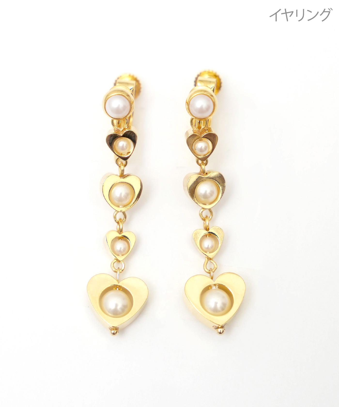 大小のハートにパールをあわせて連ねた女性らしいロングピアス・イヤリング。