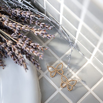 耳たぶに斜めにバタフライがフィットするように着き、さりげない存在感を放つデザインです。
