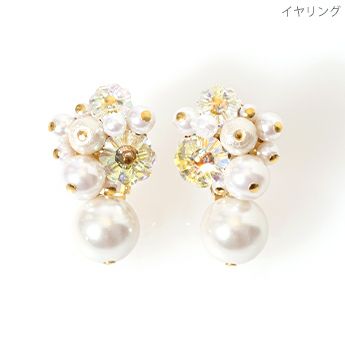 大小のパールをふんだんに使い、お花の形をしたクリスタルが寄り添う、 上品で女性らしいデザインに仕上がりました。
