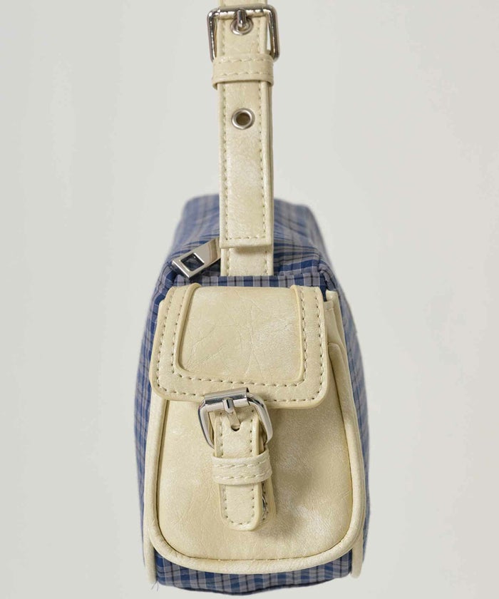 チェック柄と合皮を組み合わせたハンドバッグ。