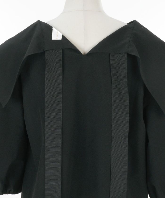 後ろ襟には幅広のリボンを取り付け、女性らしいバックスタイルに仕上げました。