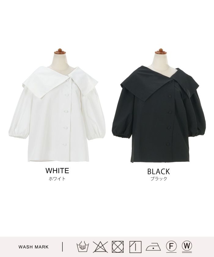 大きな襟とくるみボタンを左右非対称なサイズ・配置で仕上げ、お洒落な印象に。