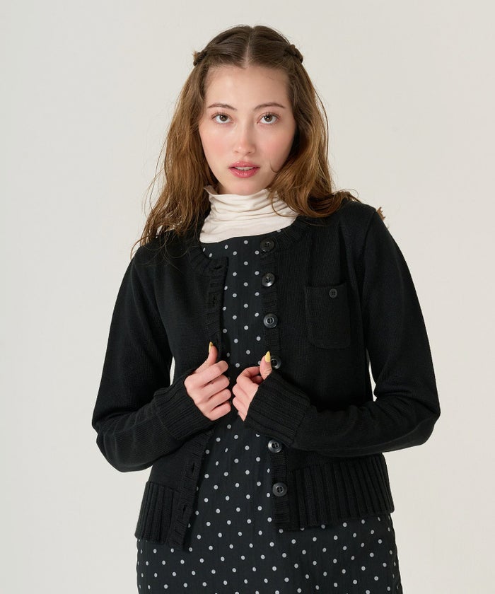 特殊な紡績法により毛玉になりにくいアンチピリング素材を使用したカーディガン。