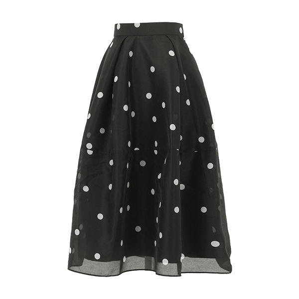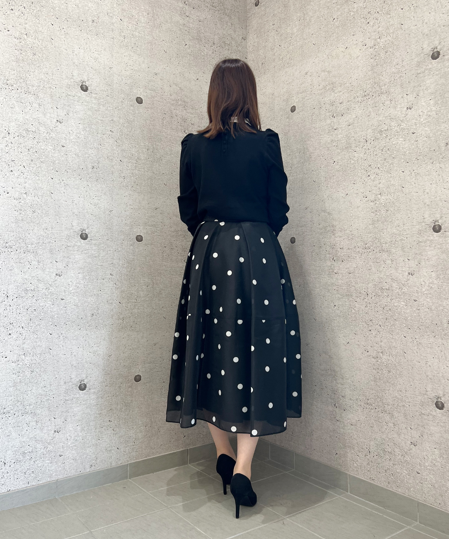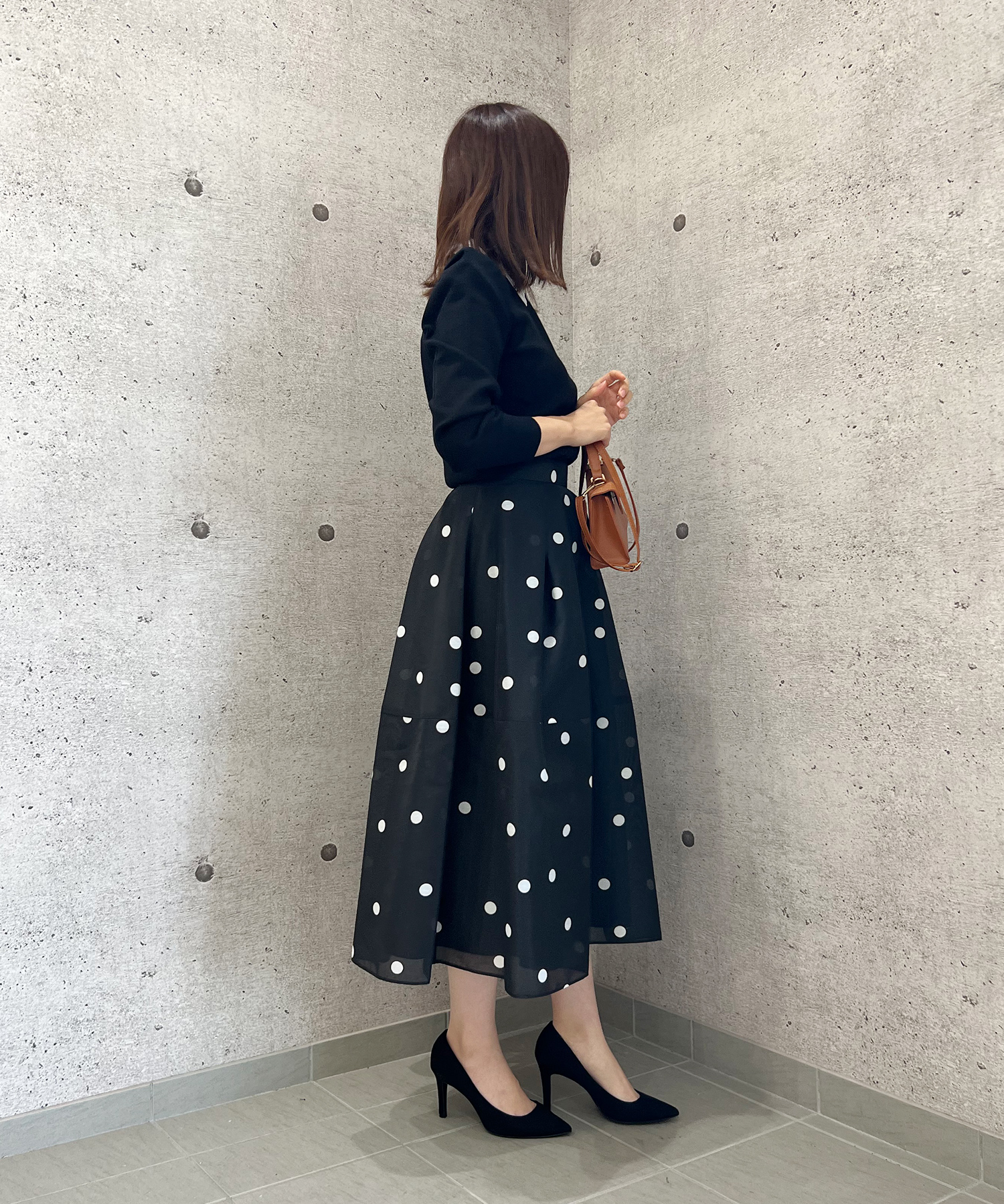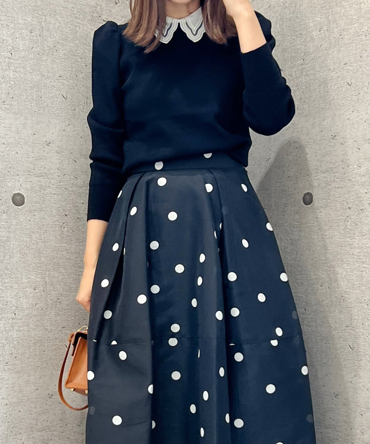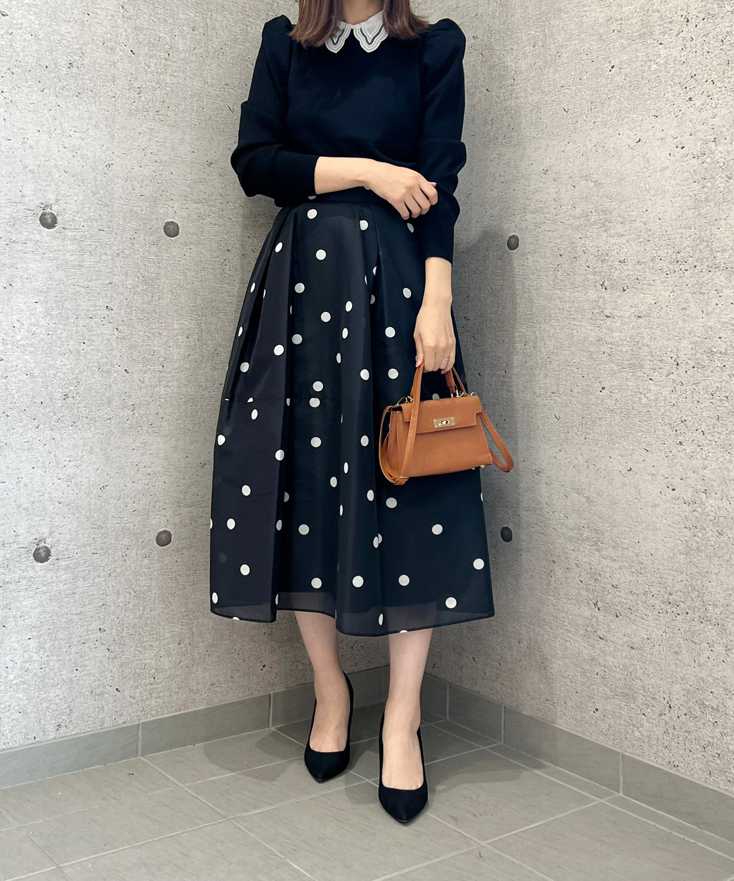 ドット柄が印象的なスカートに同色ブラックの襟付きニットを合わせて大人可愛いコーデに♡