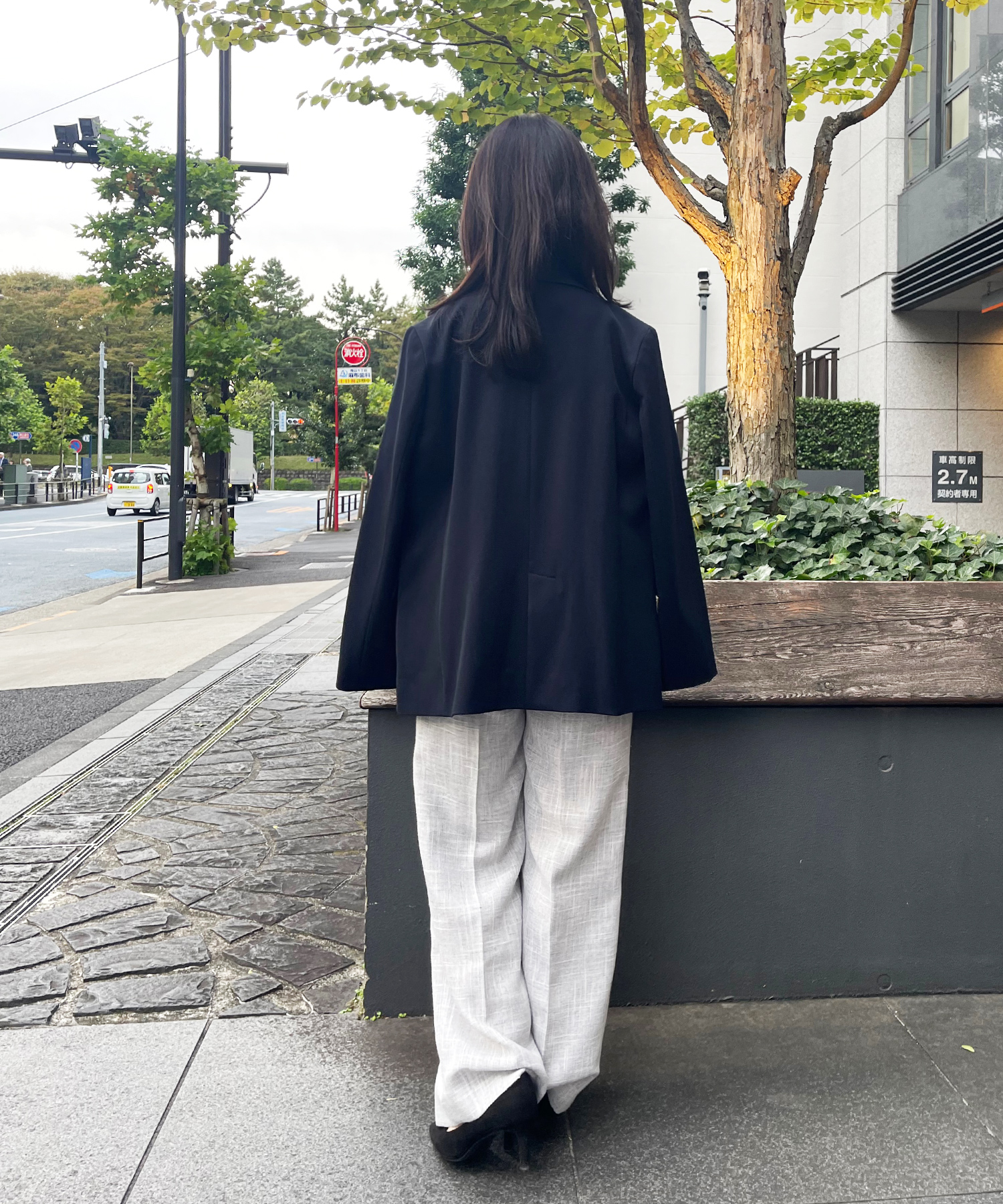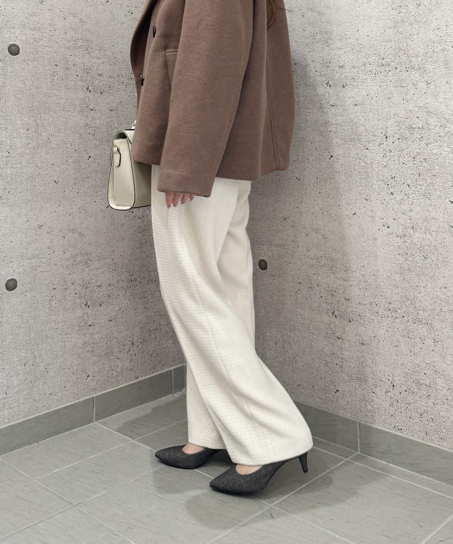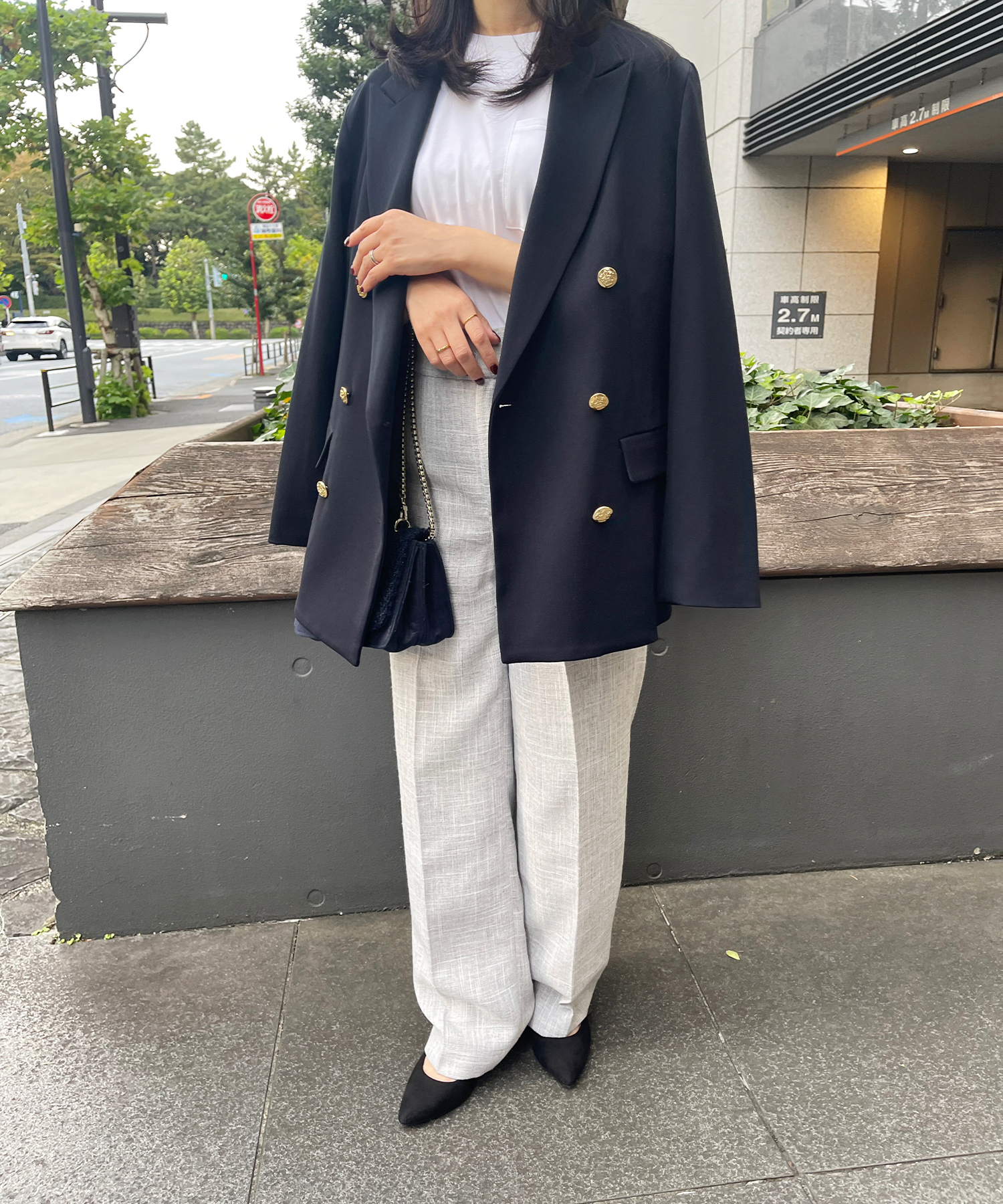 すらっとしたワイドなシルエットに入ったセンタープレスがシャープさを引き上げてくれるので、甘さを控えたジャケットスタイルにもピッタリ♡