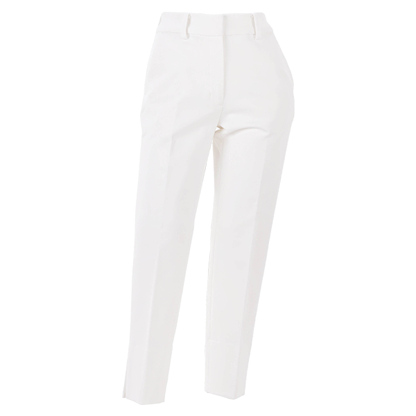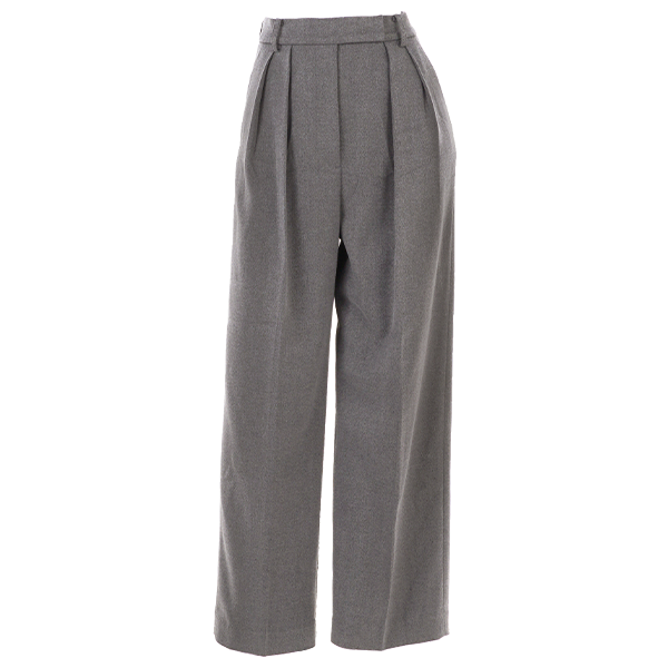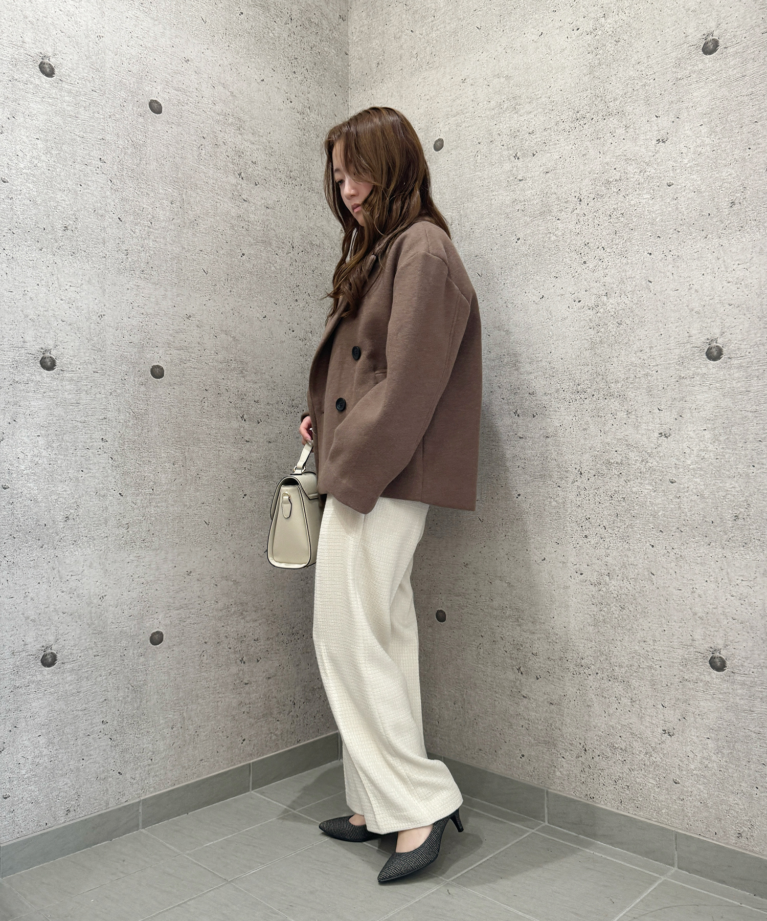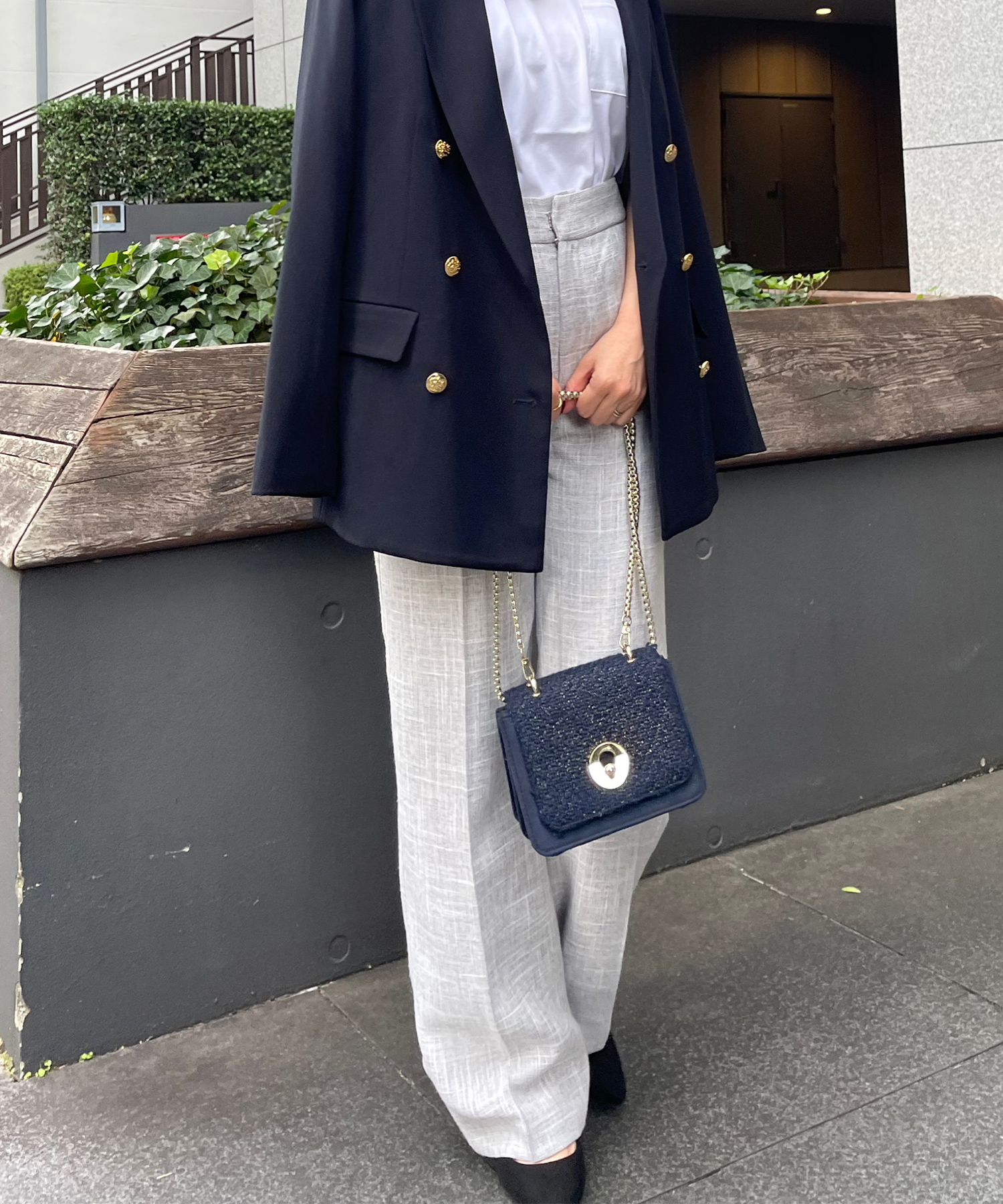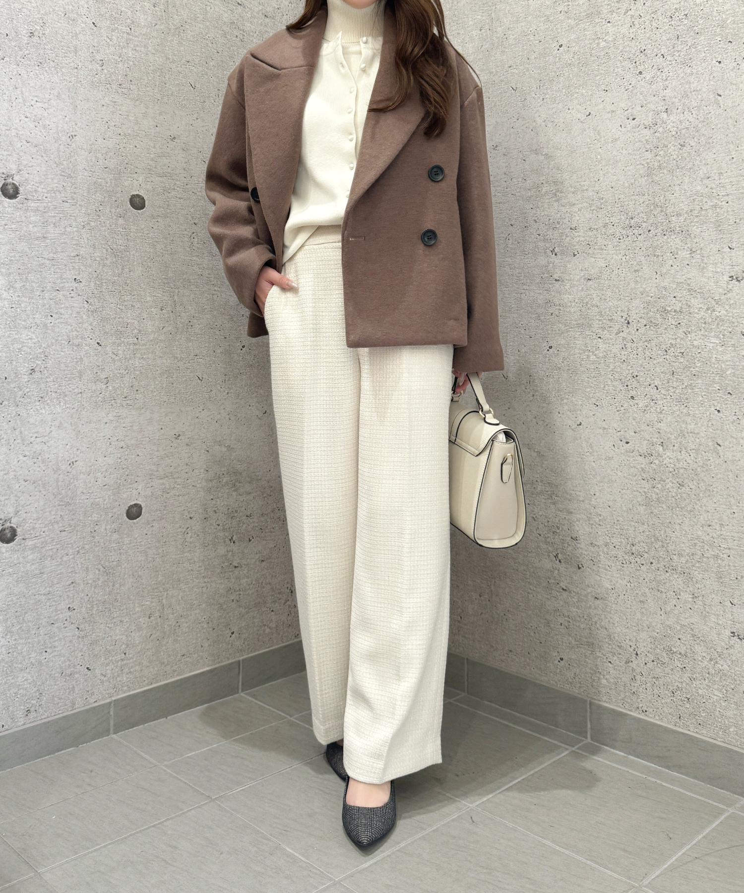 すらっとしたワイドなシルエットに入ったセンタープレスがシャープさを引き上げてくれるので、甘さを控えたジャケットスタイルにもピッタリ♡
