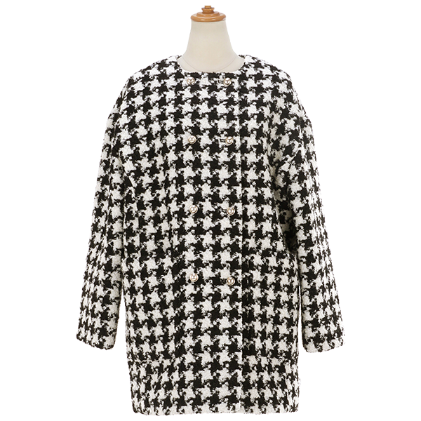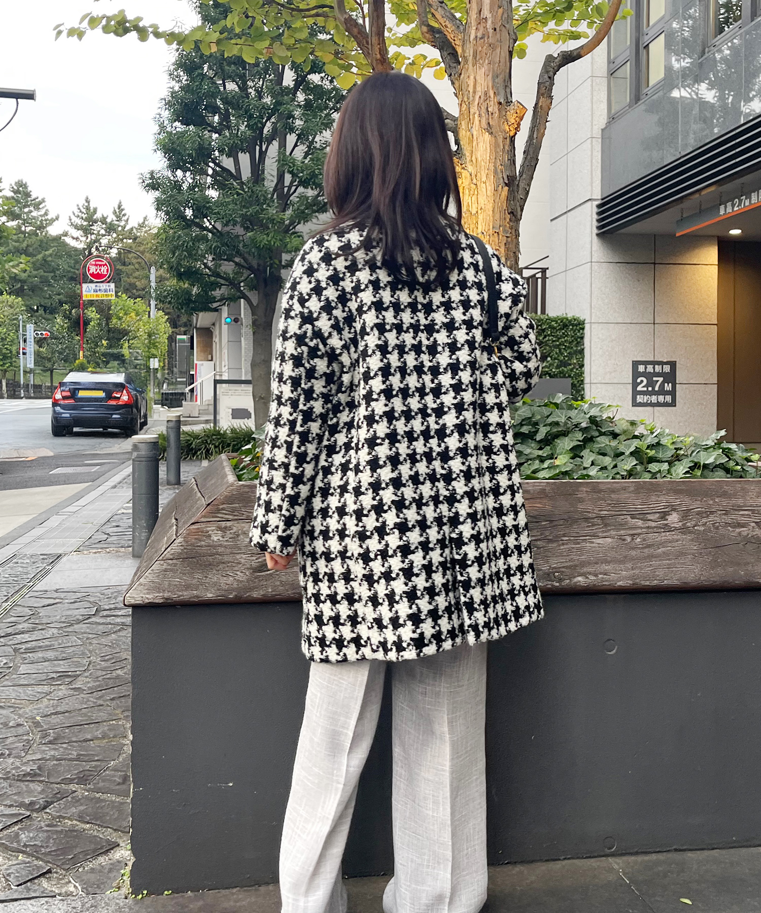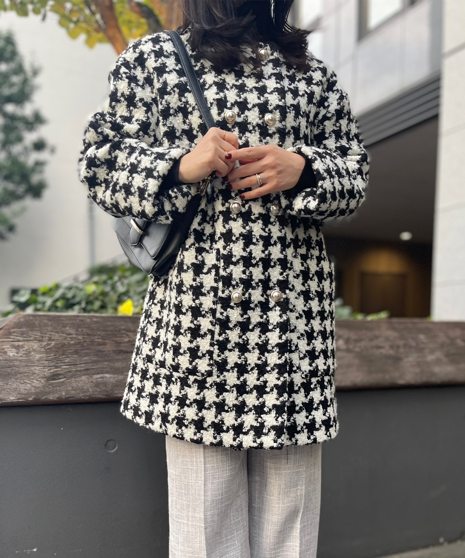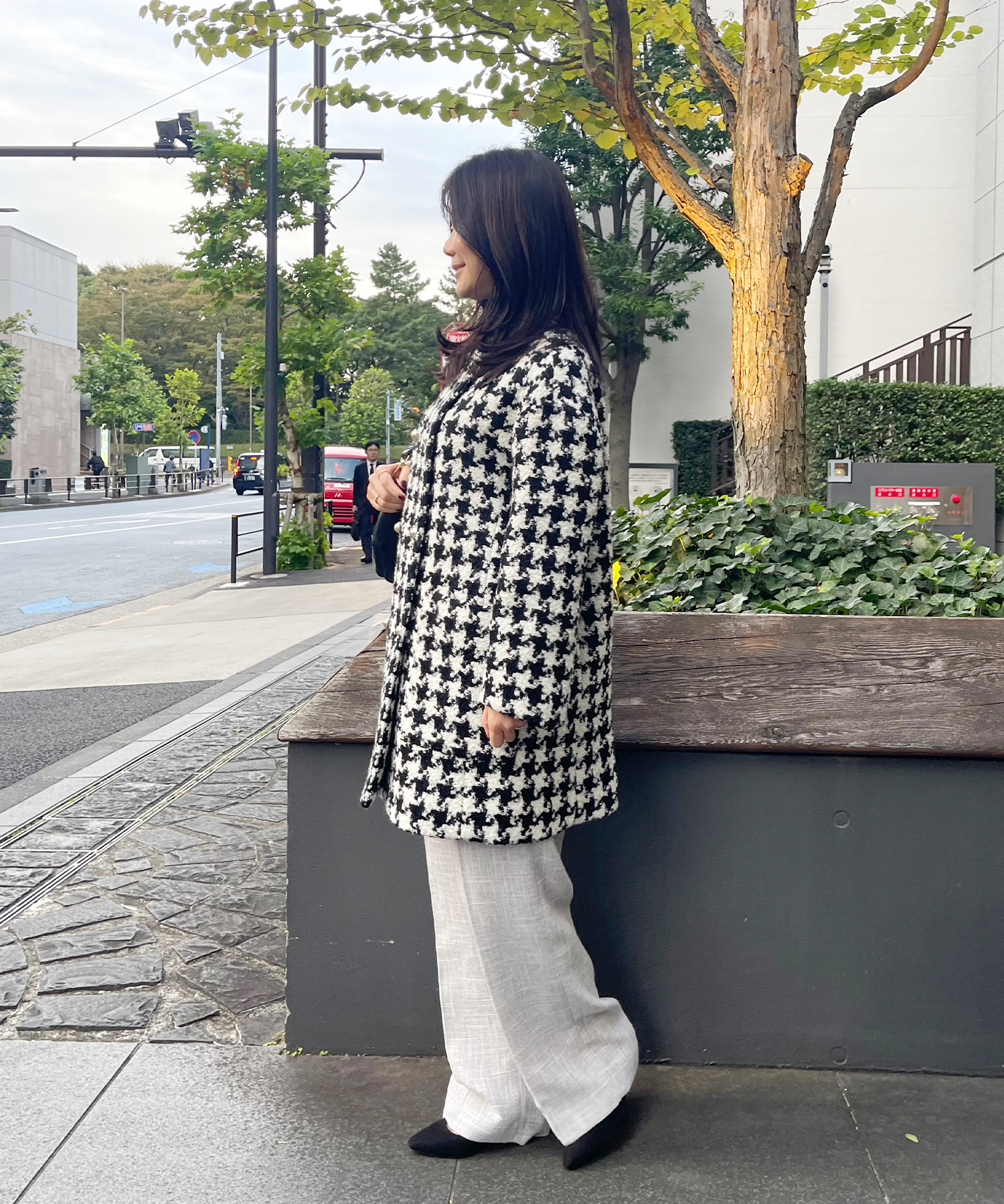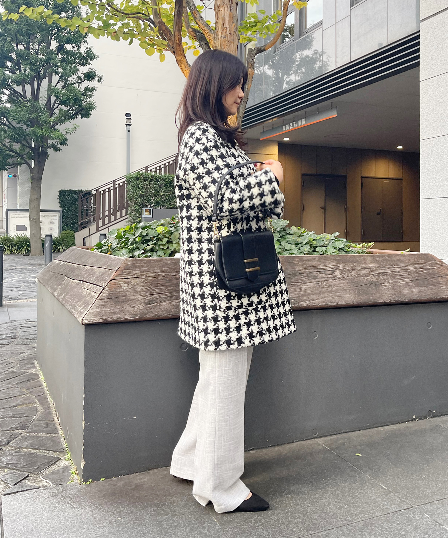 旬のオーバーサイズコートとワイドパンツは小柄な方だと嫌煙しがちですが、千鳥格子の白黒が重く見せずにちょっとレトロでシックなスタイリングになります◎