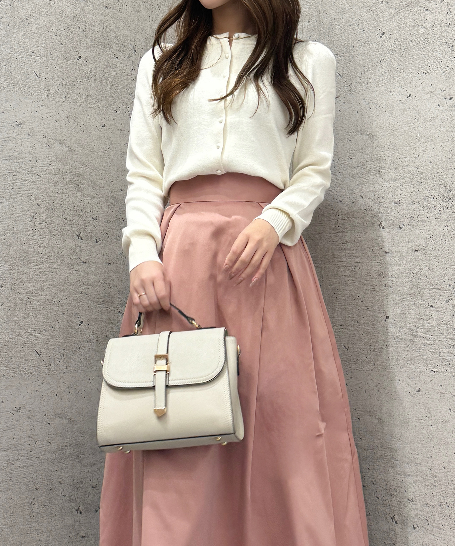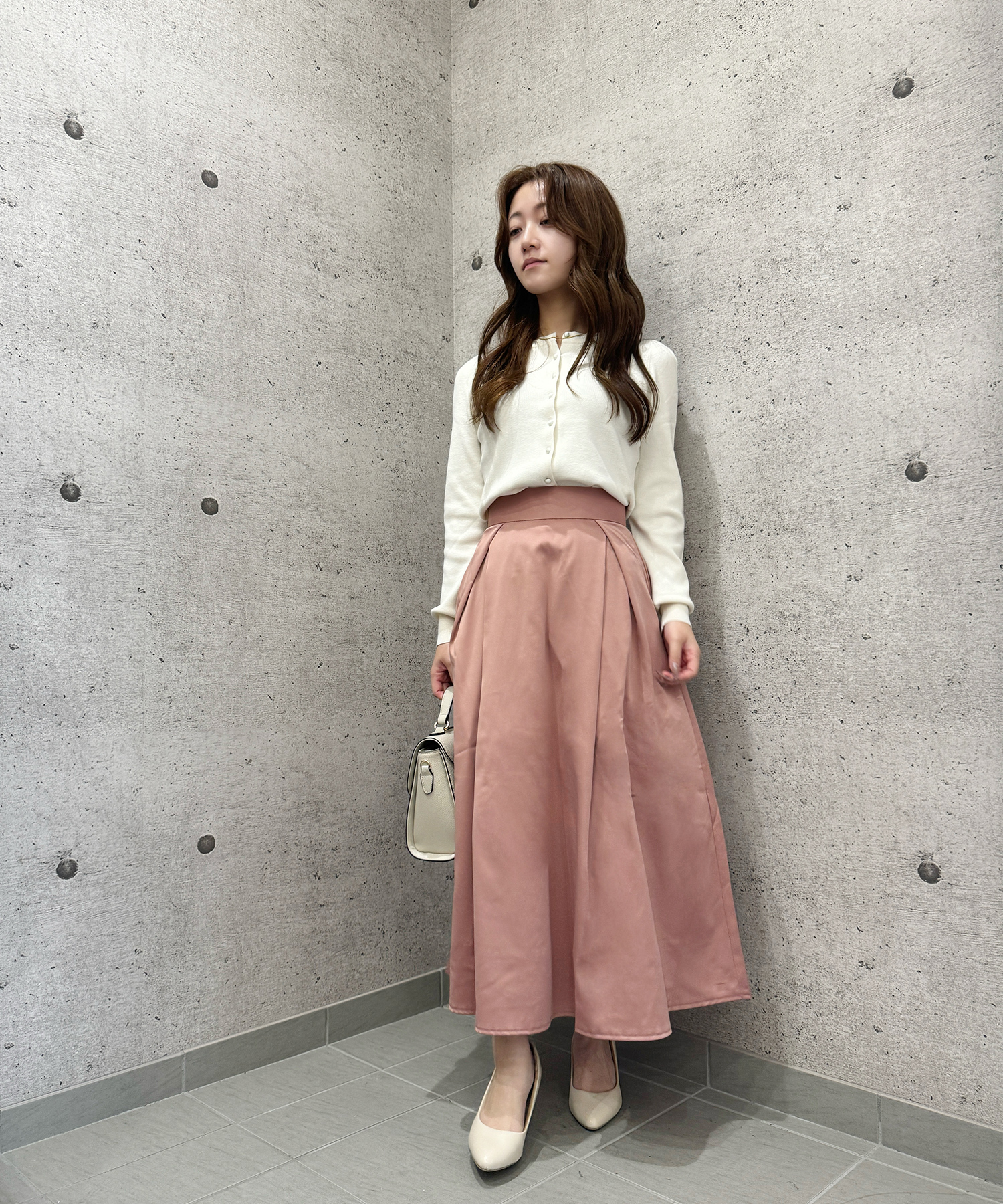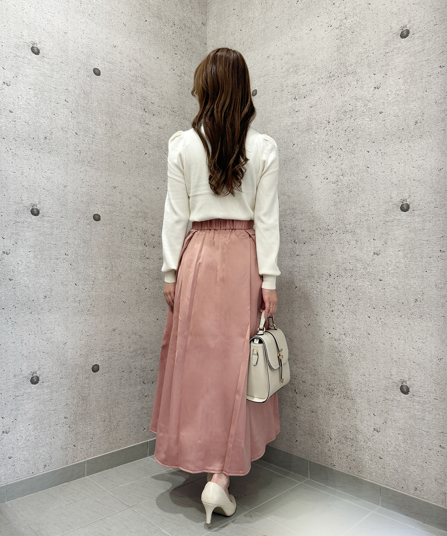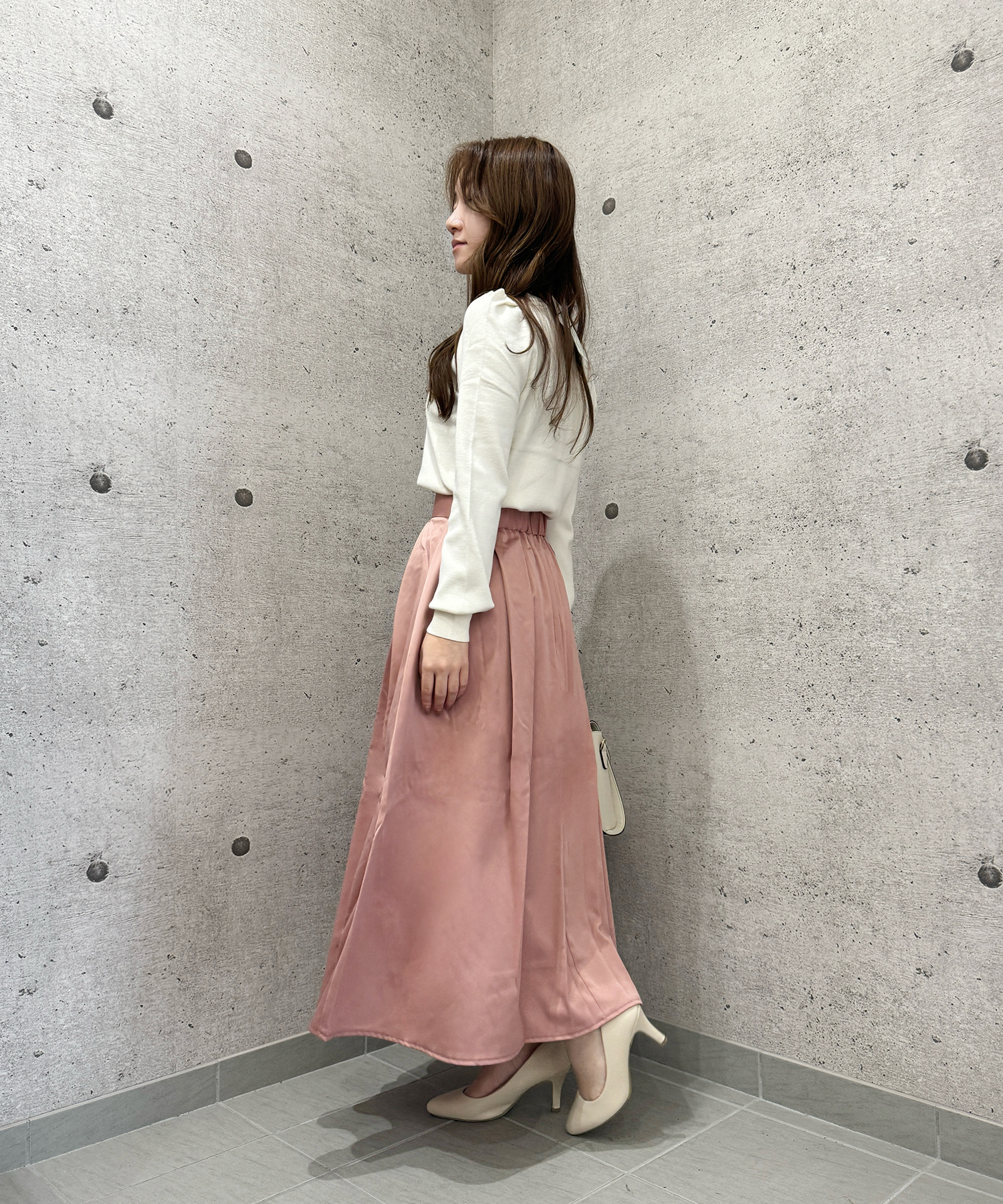 ボトムスには鮮やかで大人なサテンライクのボリュームスカートで、ぽかぽかとした秋の雰囲気漂うコーデに💡
