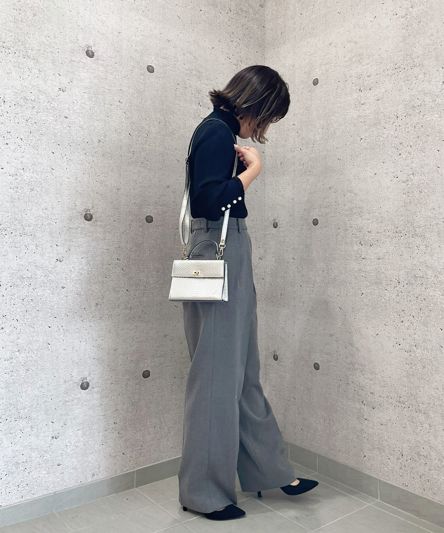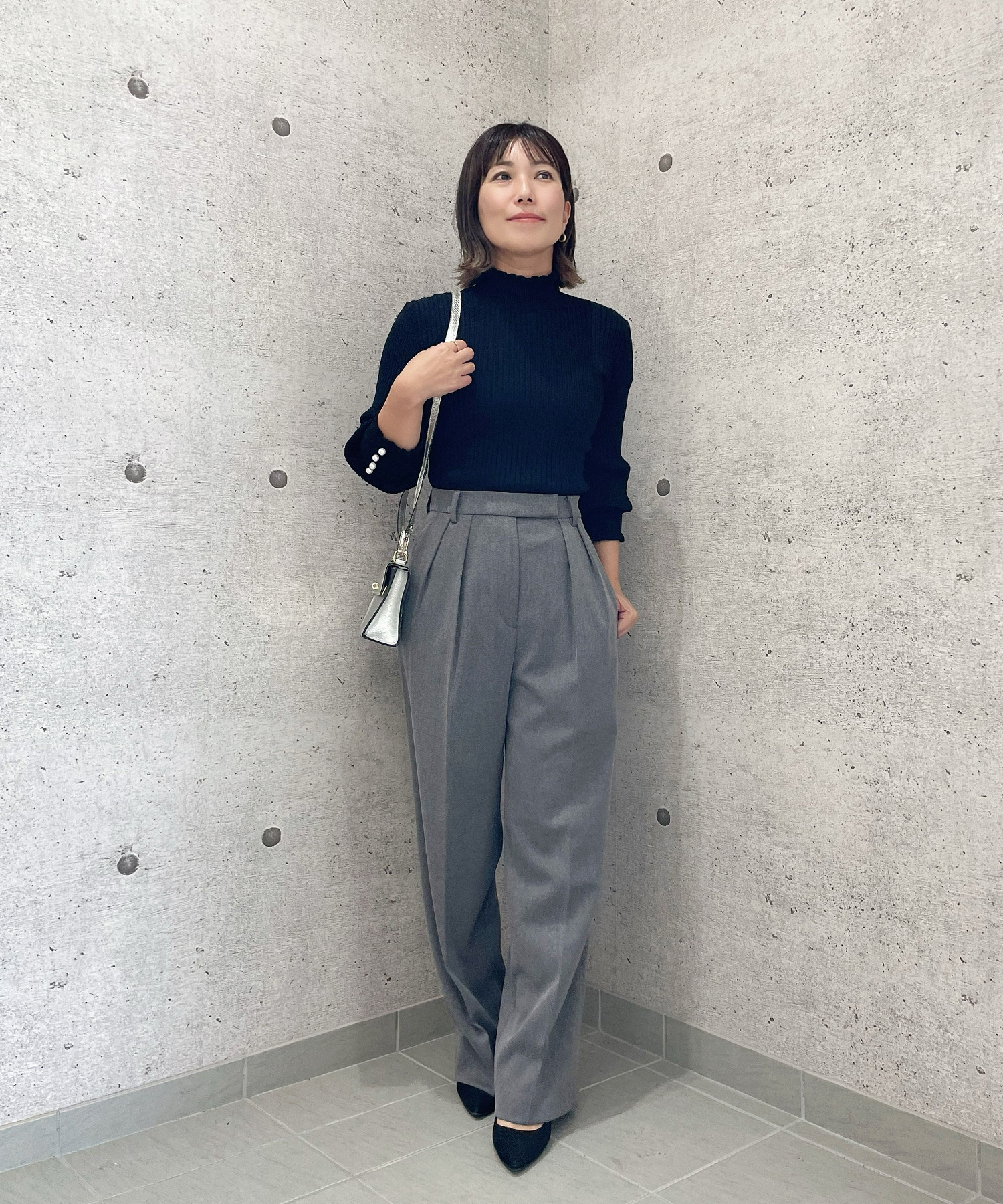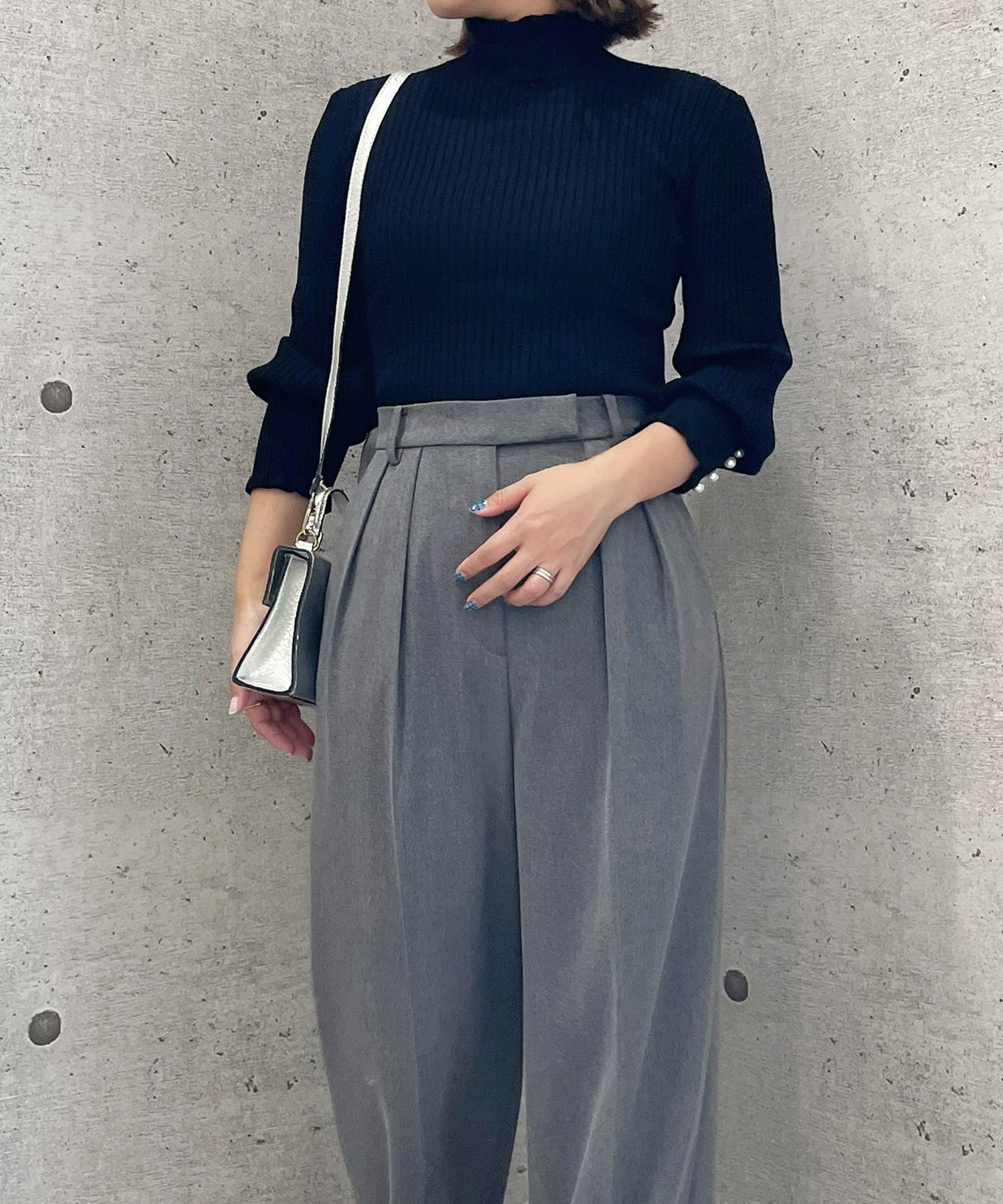 シンプルに見えて、袖口のさりげないパールが上品さをUPさせてくれるタートルニットには、ワイドパンツを合わせてトレンドスタイルにしてみました!