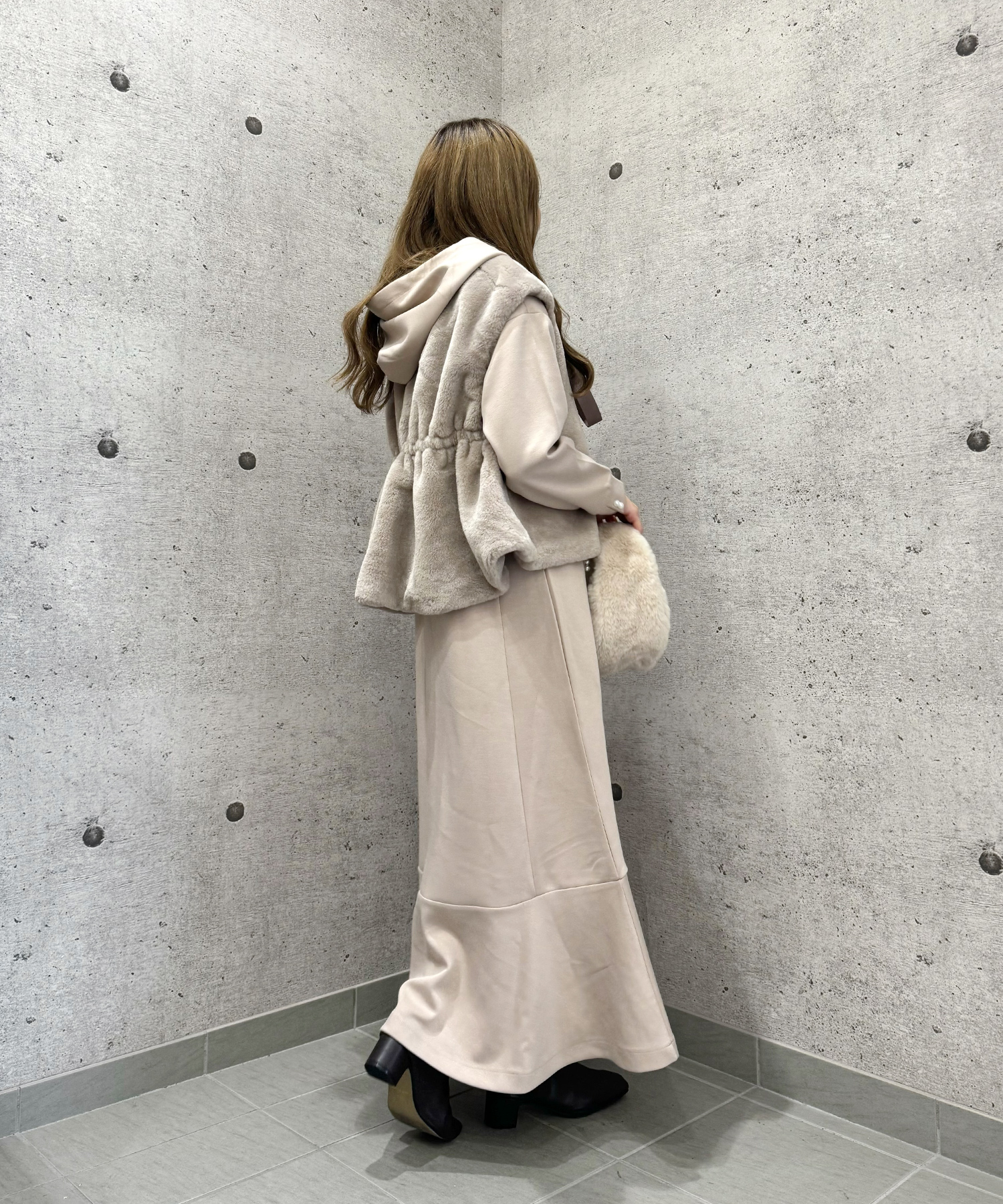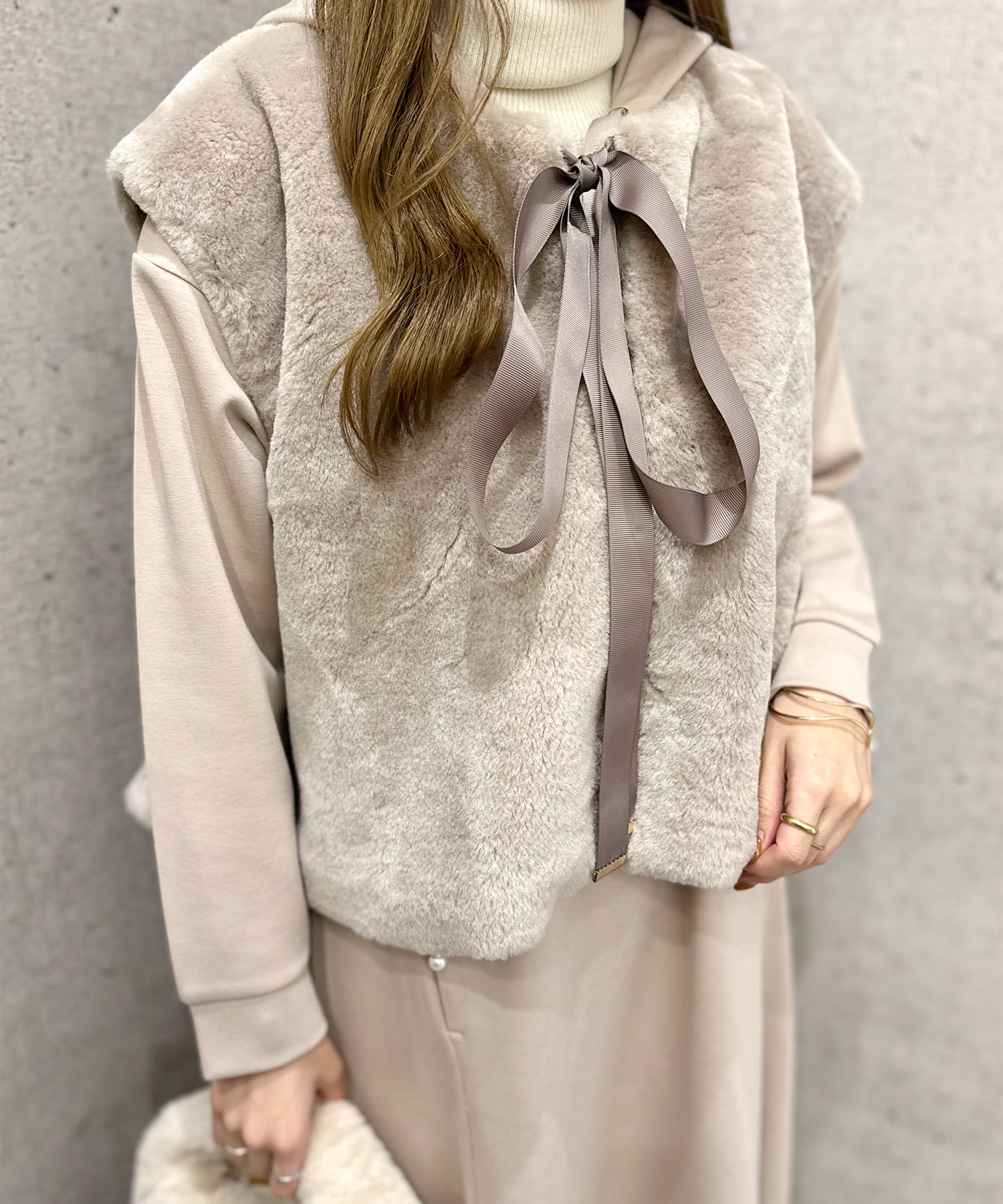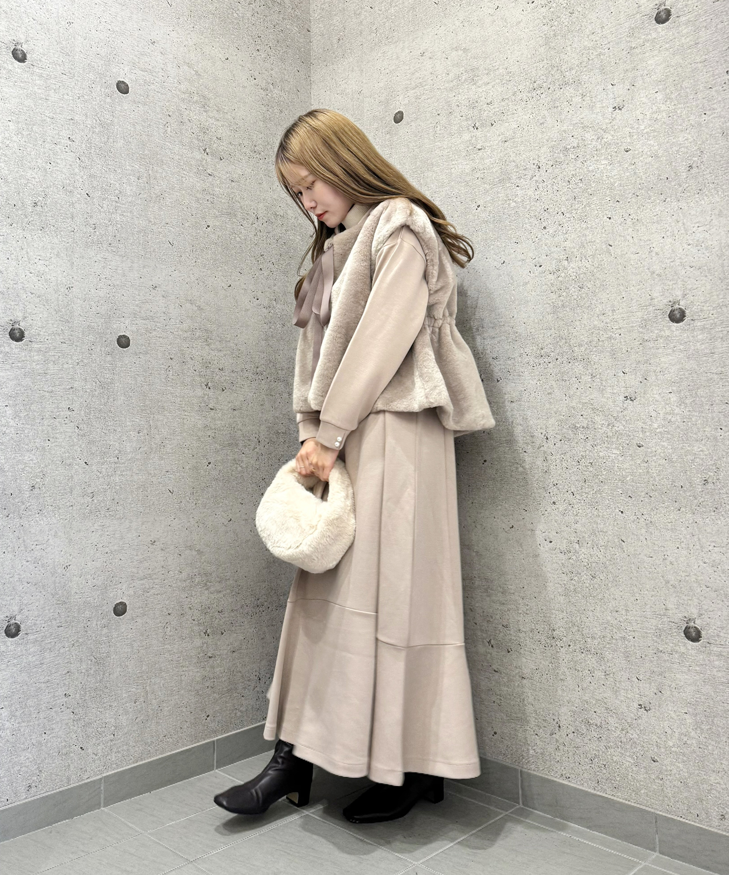 インナーにタートルネックニット、アウターにはふわふわのファーベストを合わせ、あたたかな冬コーデの完成✨