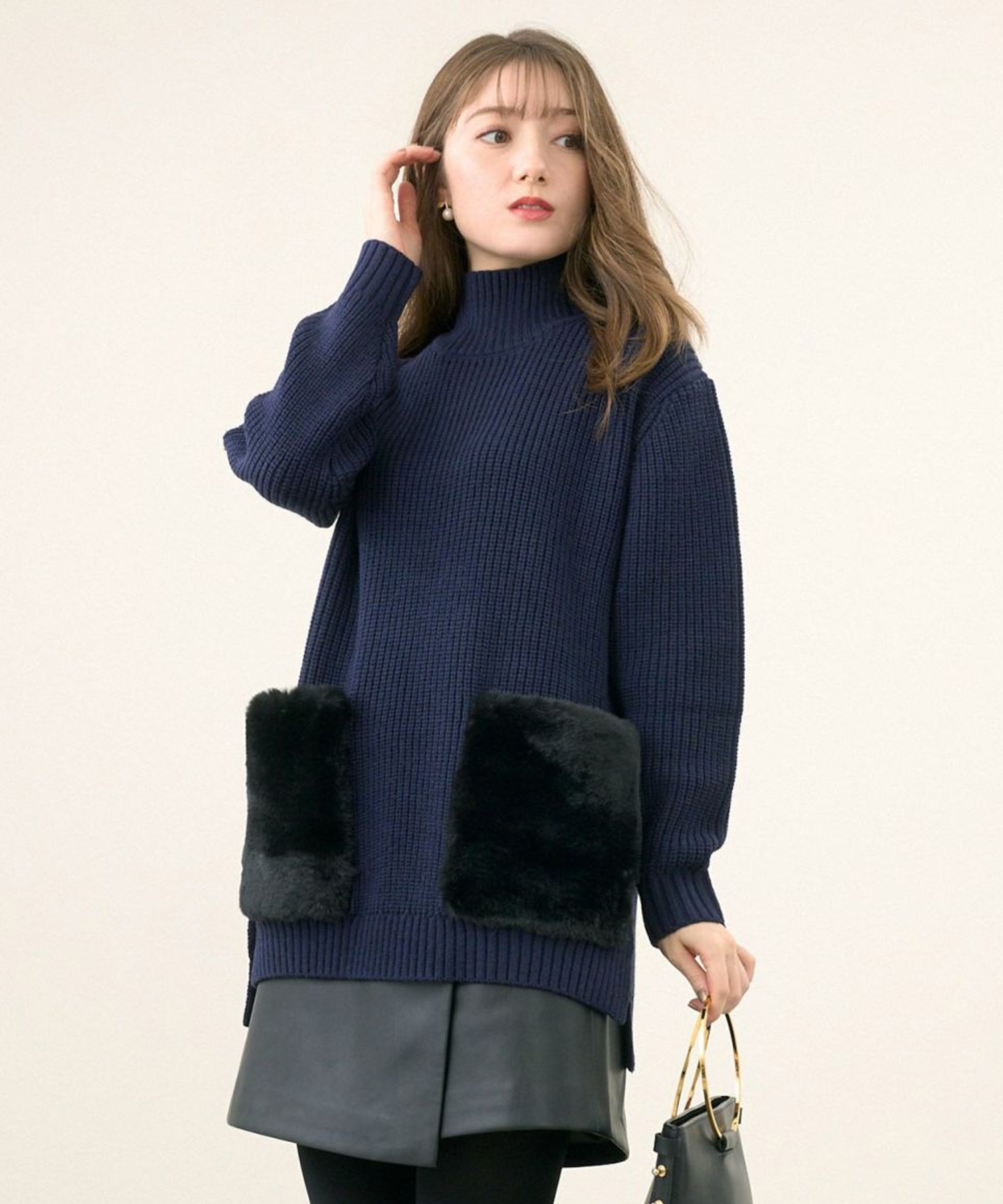 昨年も人気だった片畦ニットにフェイクファーのポケットをあしらった1枚。