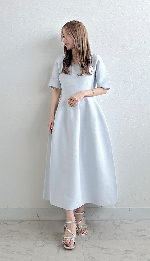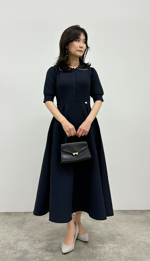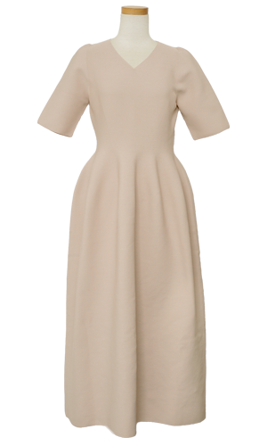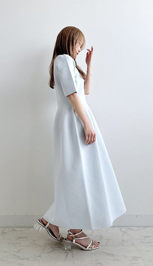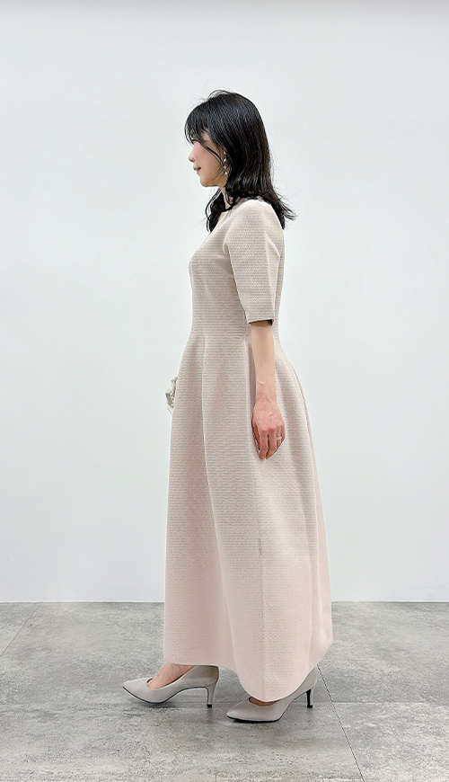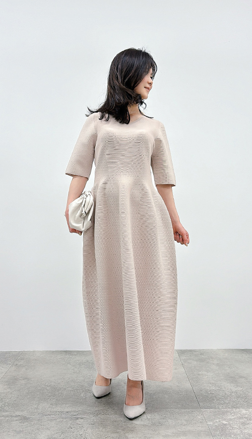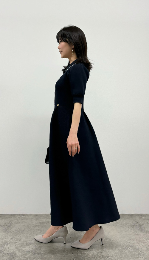 程よくハリ感がある生地できちんと感がある着こなしになりました。とてもきれいなシルエットのワンピースで、ヒールを合わせていただくとスタイルアップします!