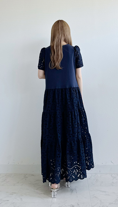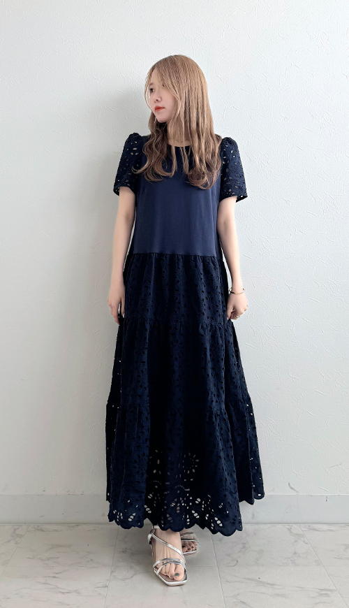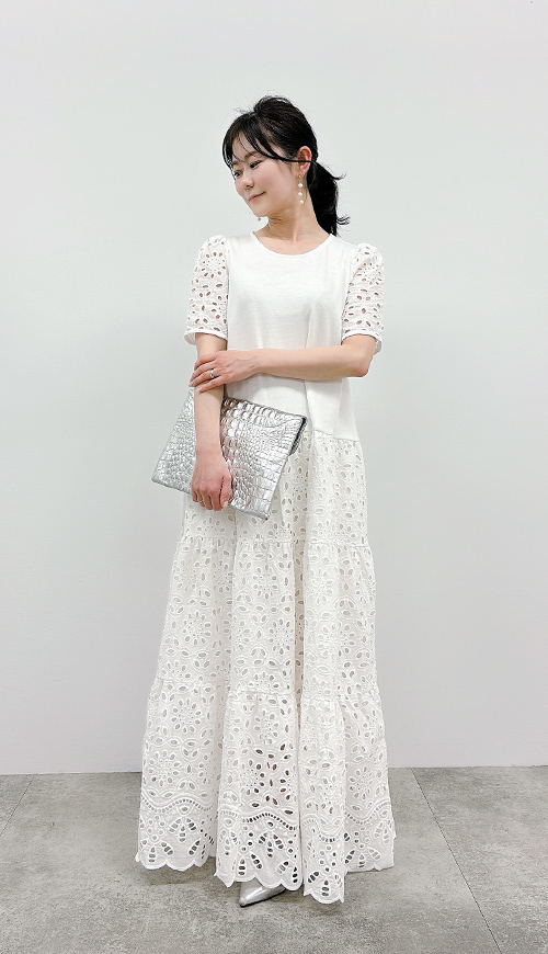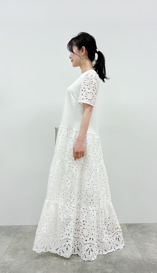 5cmヒールの靴を着用しても地面すれすれの着丈だったので、150cm未満の方には長く感じるかと思います。着心地はとても軽く、上半身のカットソーの素材が夏場にピッタリだと思ったので残念です!