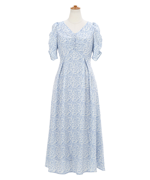 パフスリーブのふんわりブラウスも細めなフレアラインのスカートでスッキリ見せてくれます。
