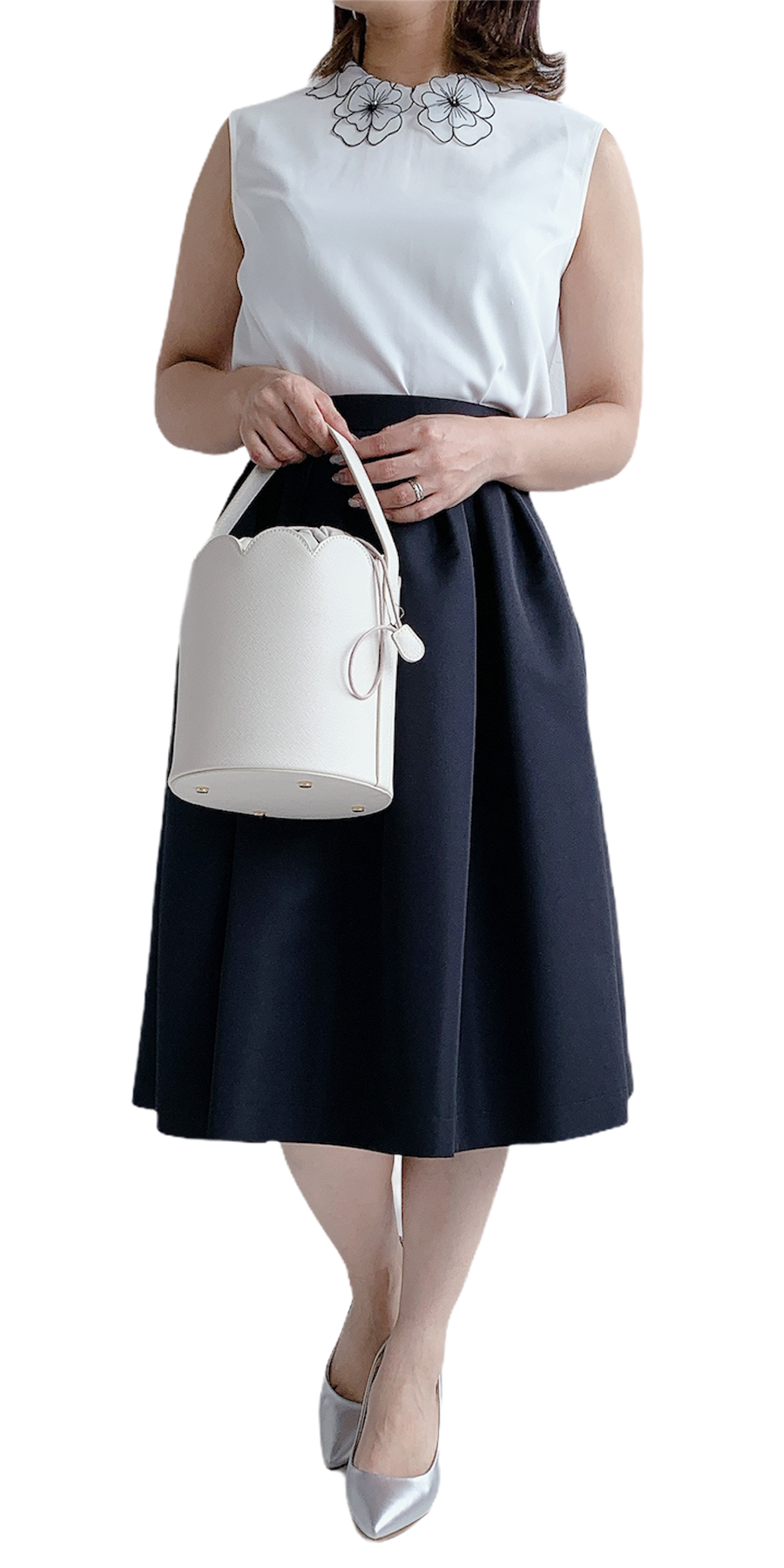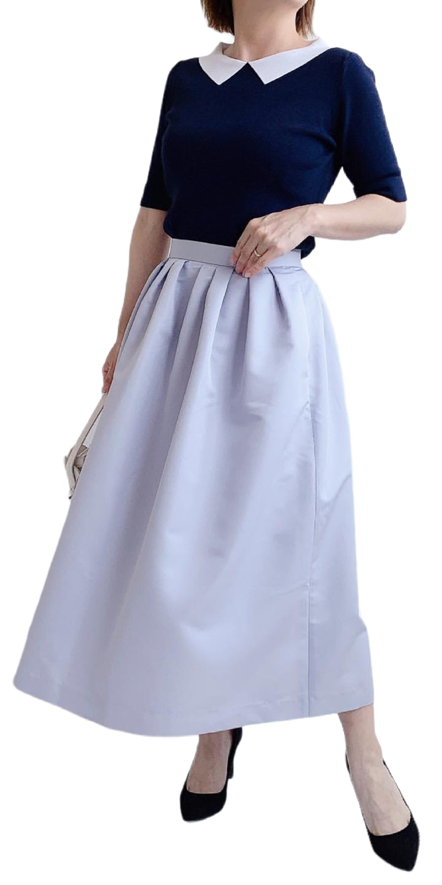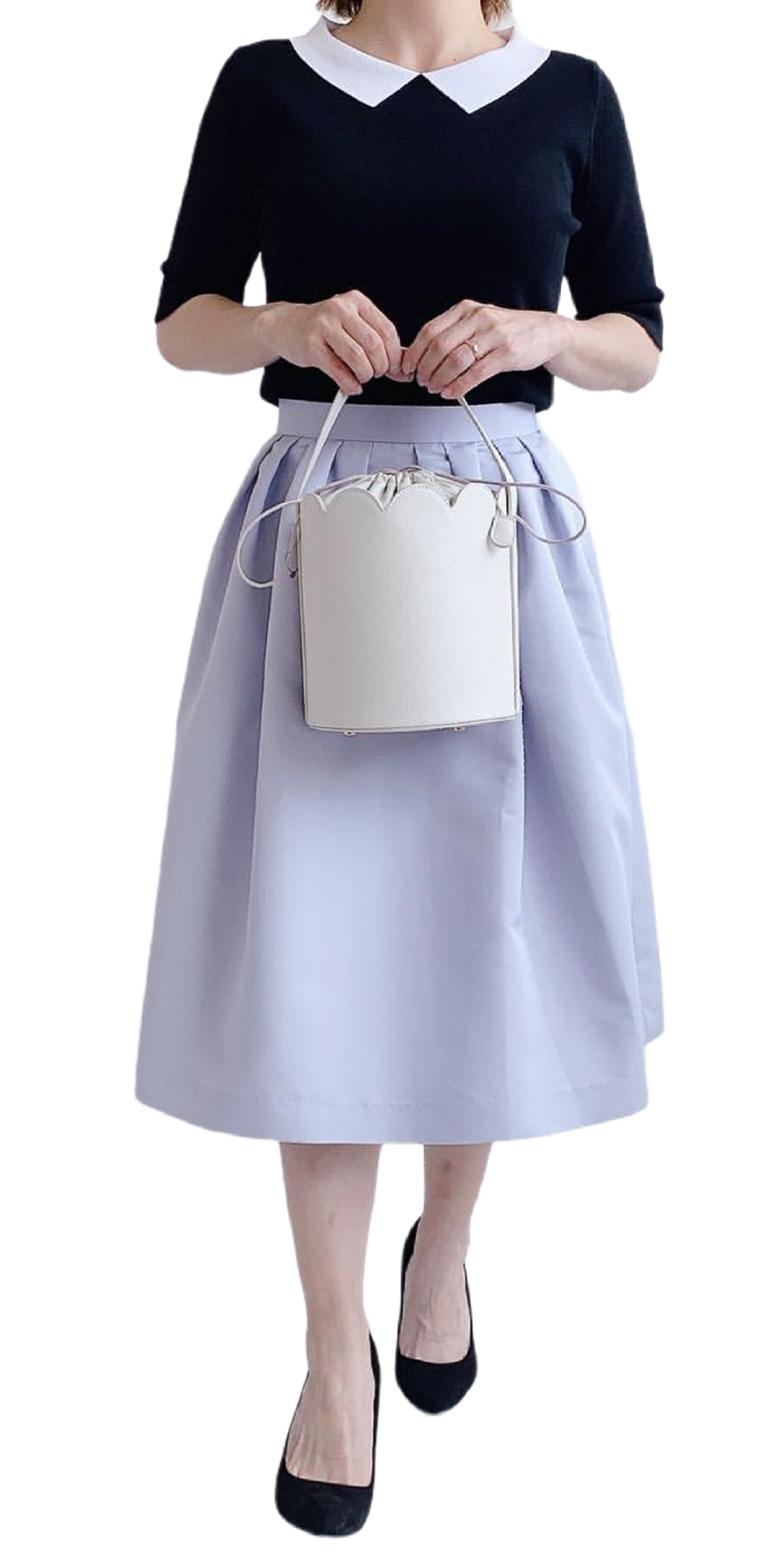 ショート丈でも膝が隠れる程の丈感で、学校行事やオフィスにも使えそう。