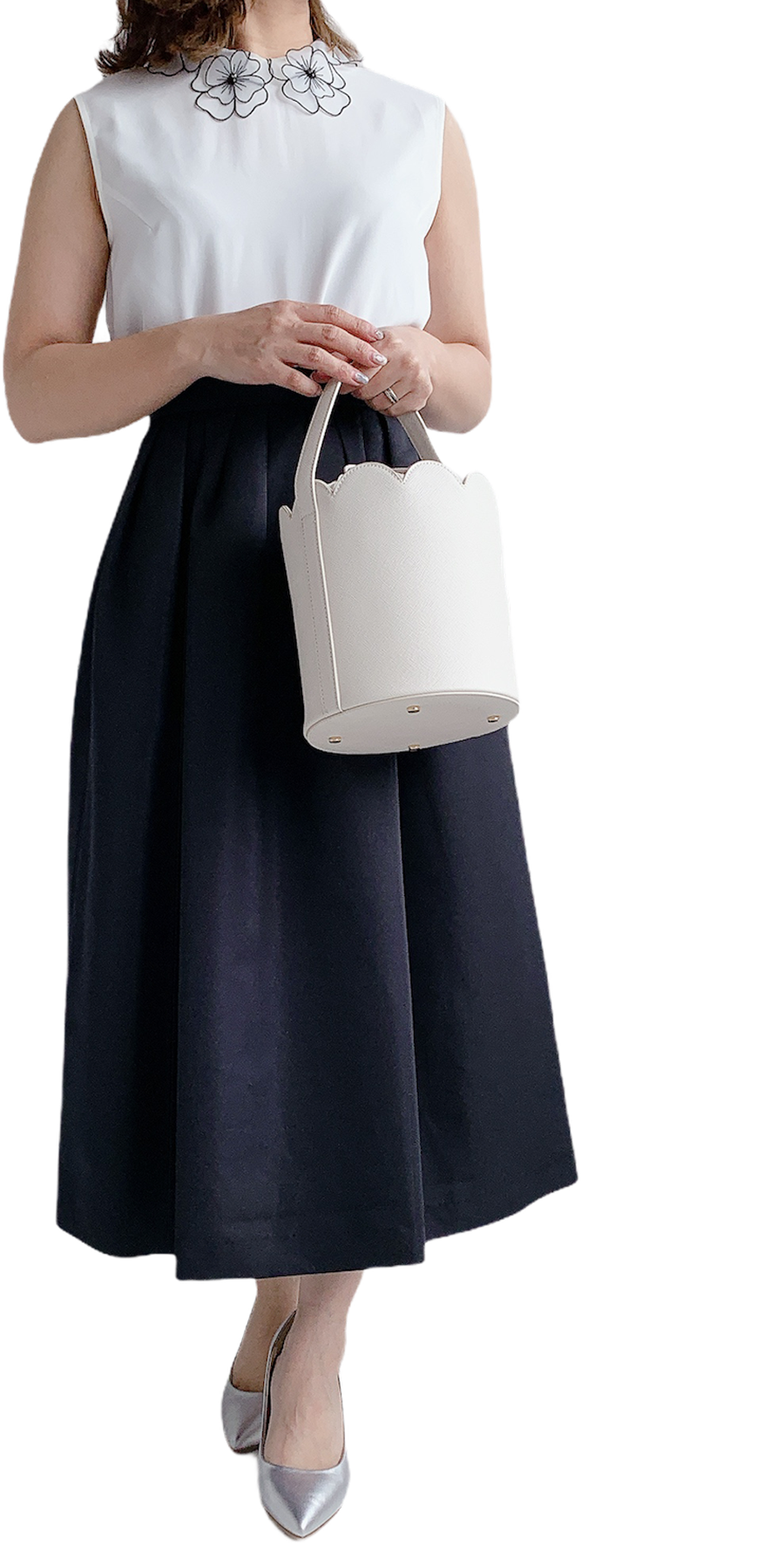 高め位置のウエストマークで小柄さんもバランスの良い着こなしに。