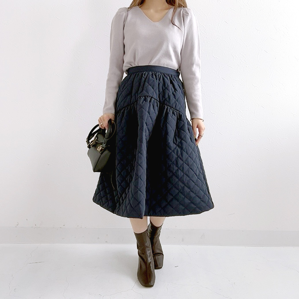 ヒップに切り替えを入れてふんわり可愛らしい印象のキルティングスカート。