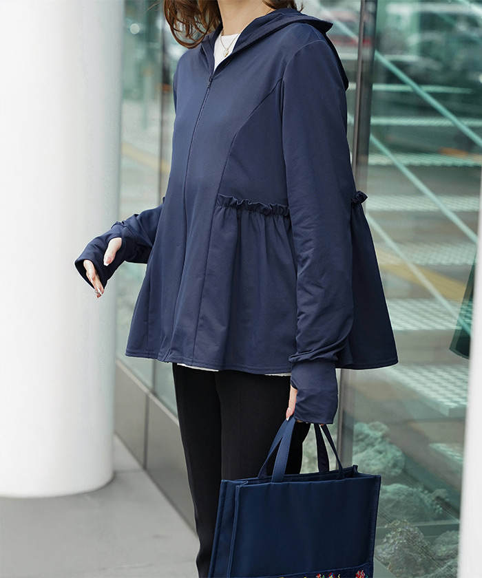 目の下までしっかり覆えるフードに加え、指穴スリットで指先までガード。