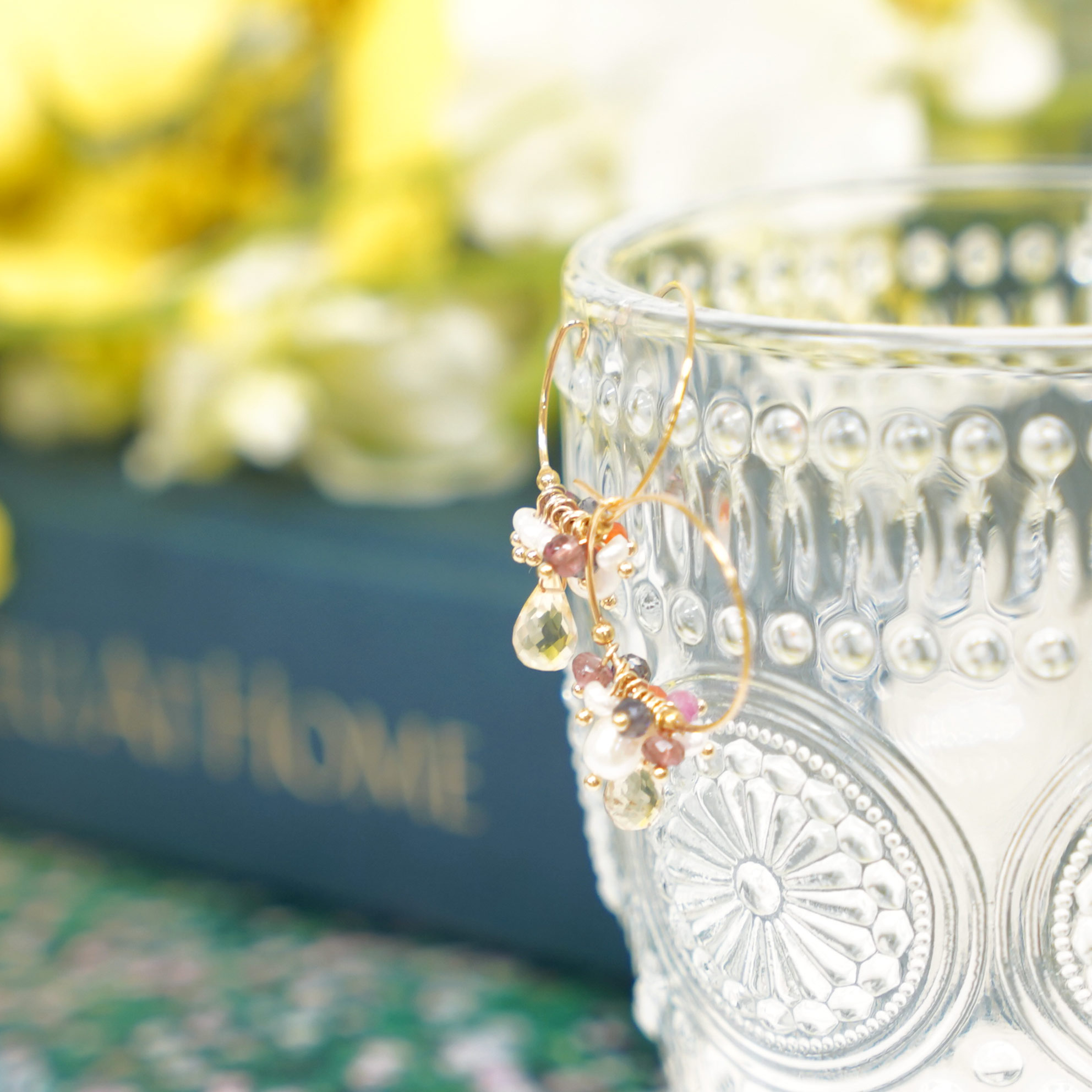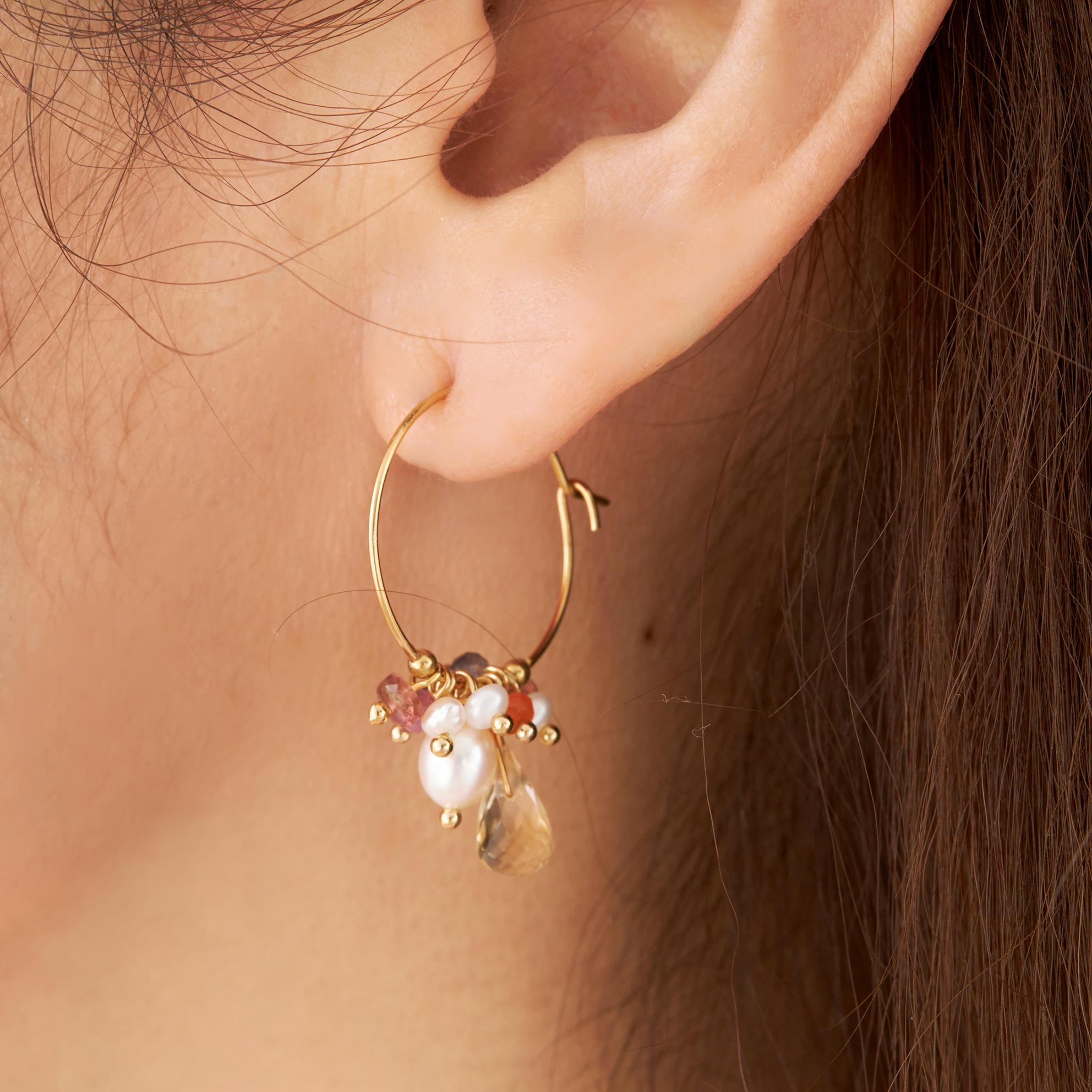 小ぶりのフープにカラフルな天然石をあわせたデザイン。