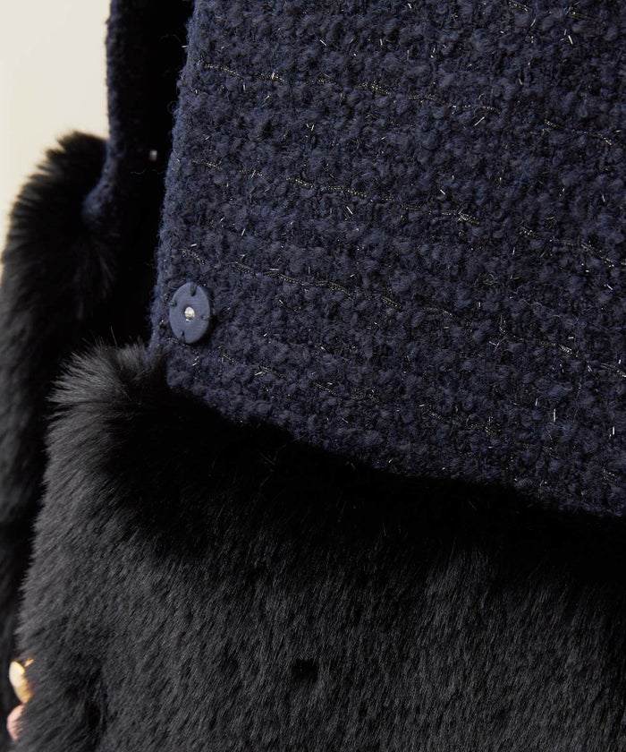 上品なツイードをベースに裾まわりをフェイクファーで切り替えたコート。