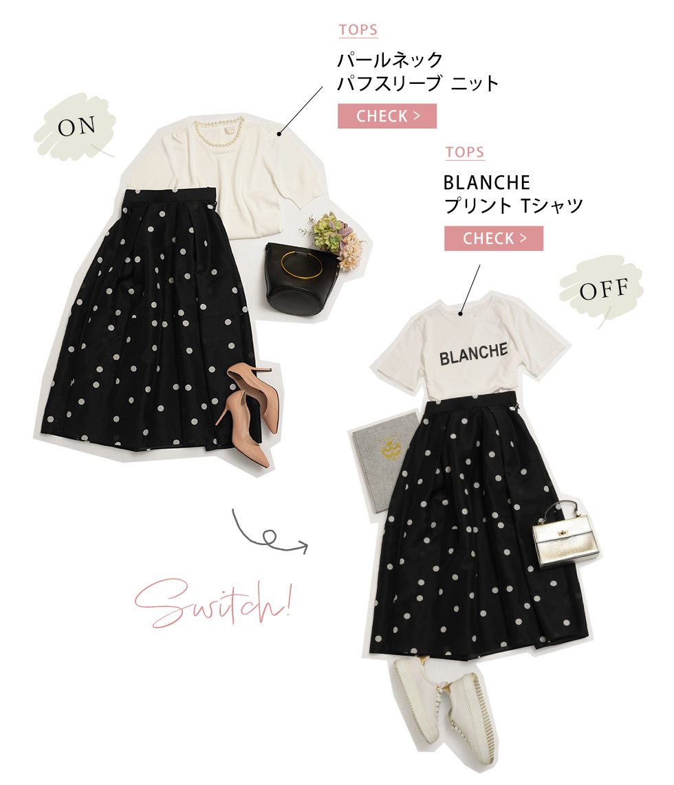 ほんのり透け感のある素材が清涼感のあるドットスカート。