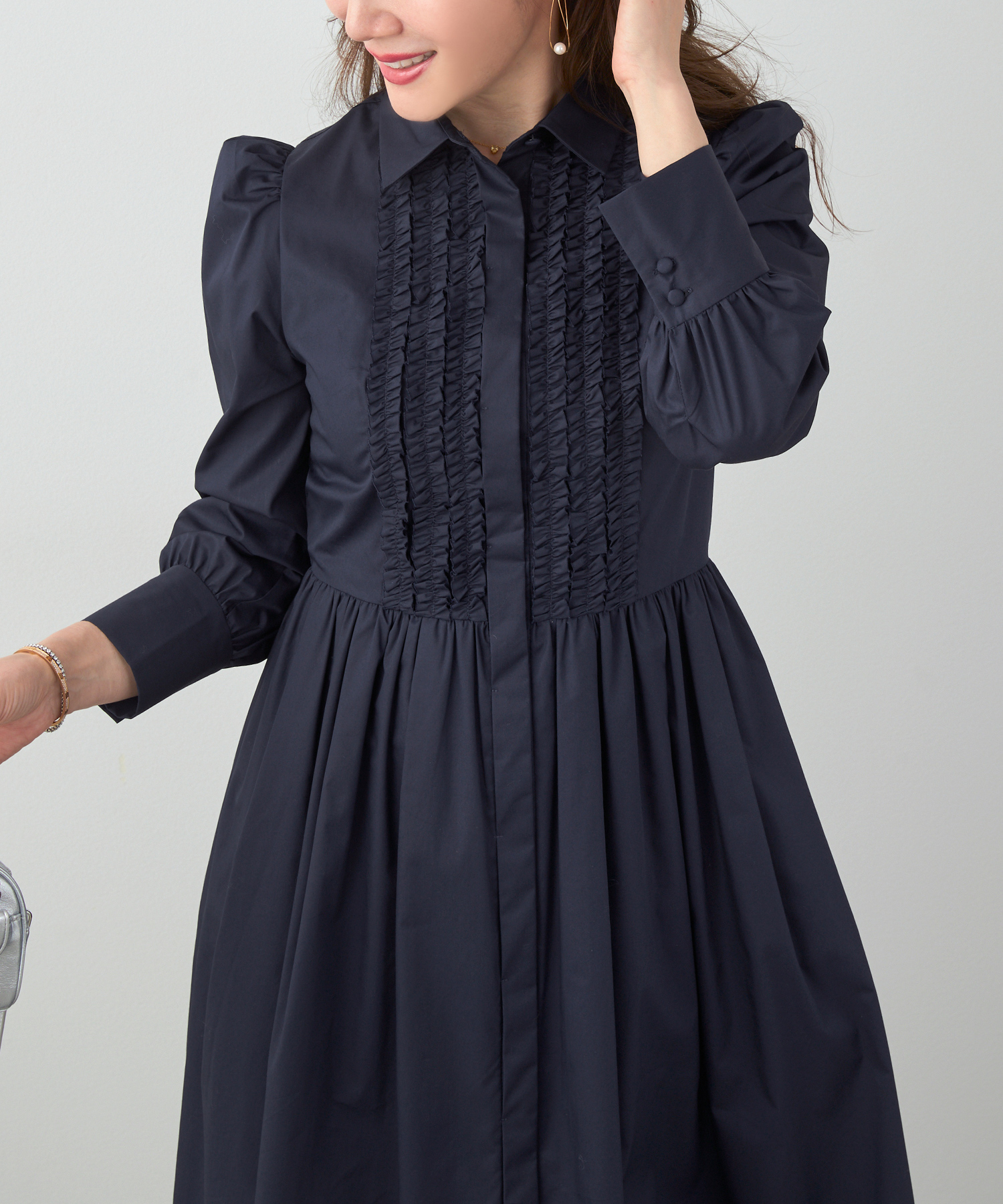 フロント部分にあしらわれたフリルがシンプルなワンピースに華やかさと立体感をプラス。
