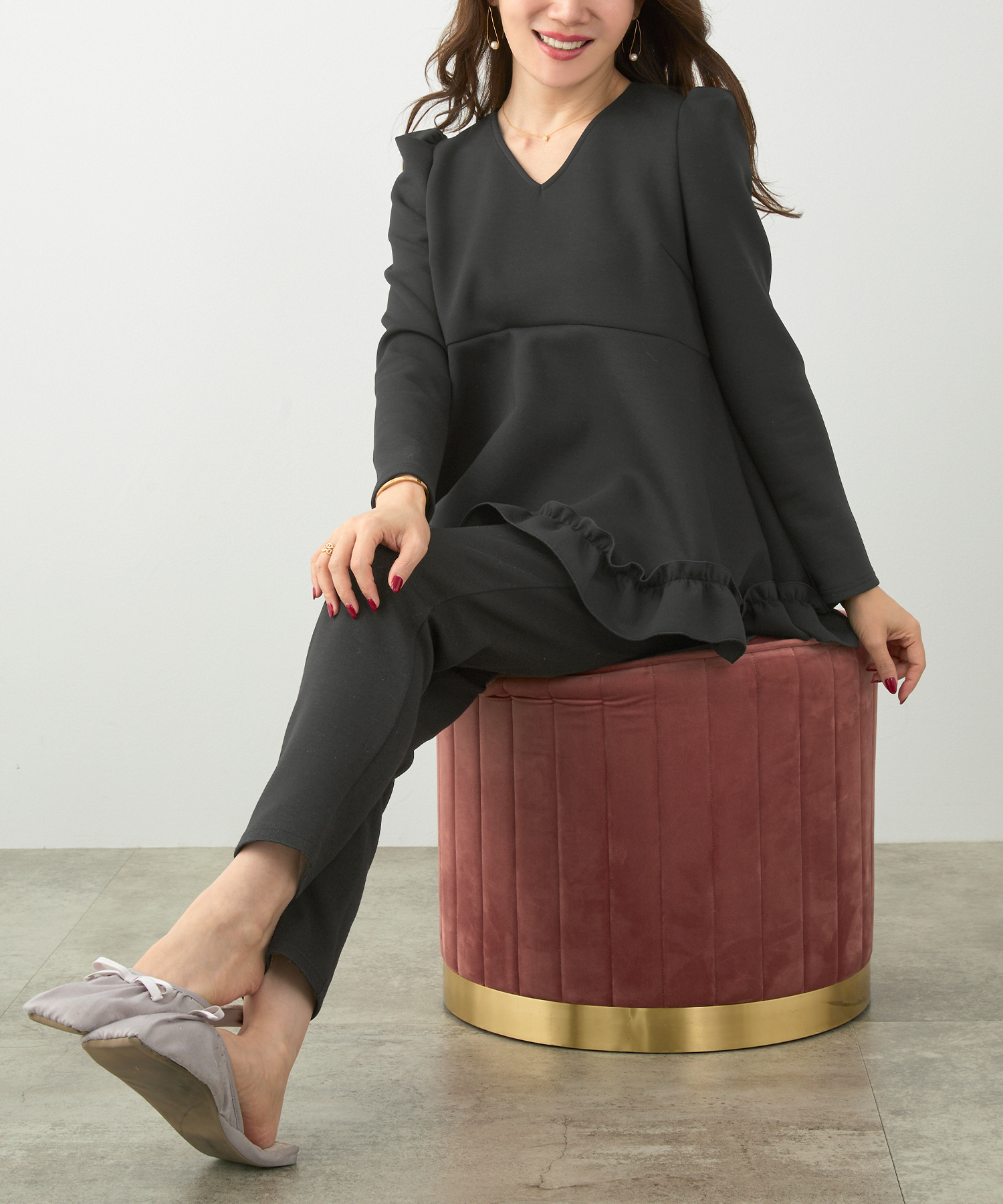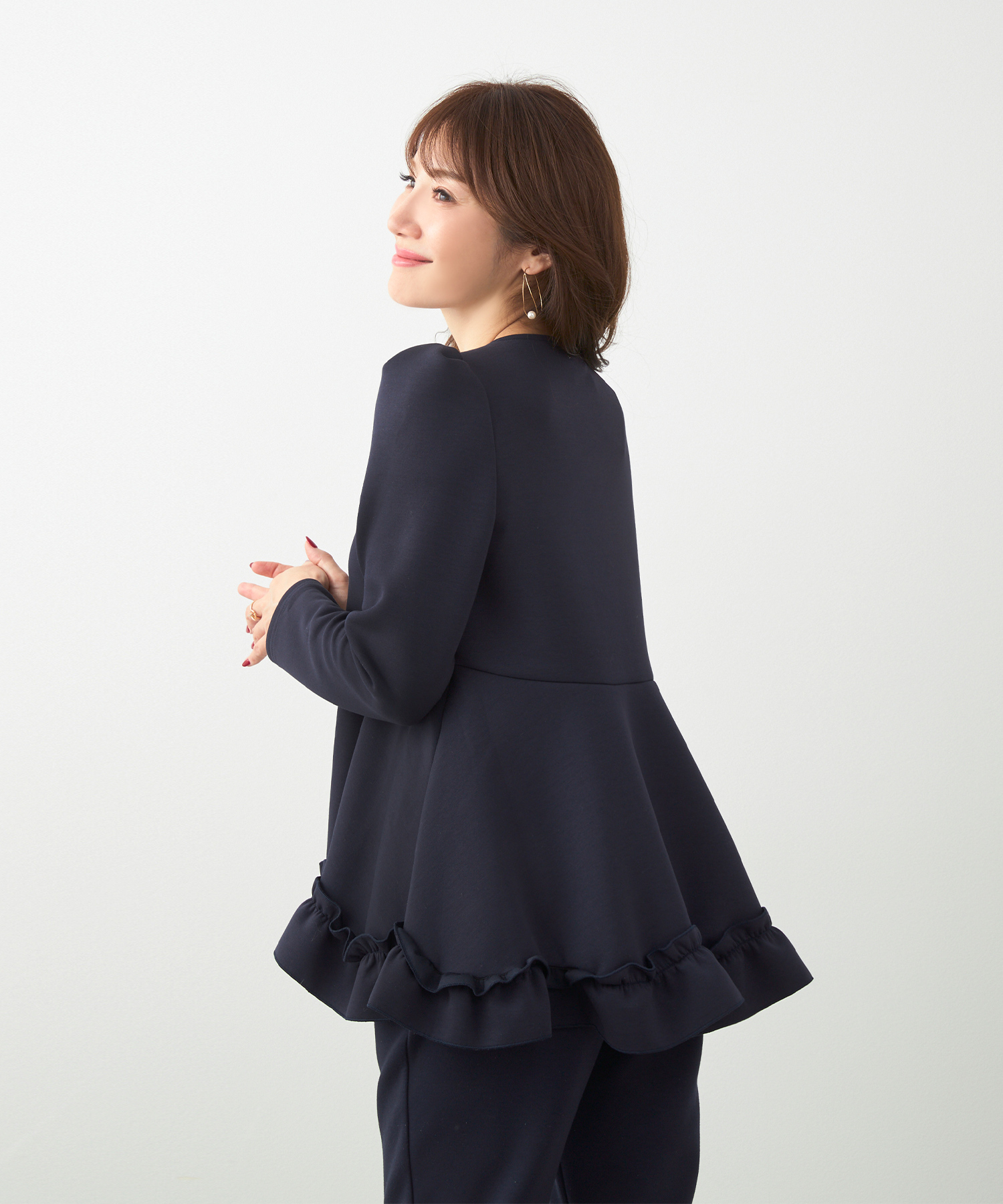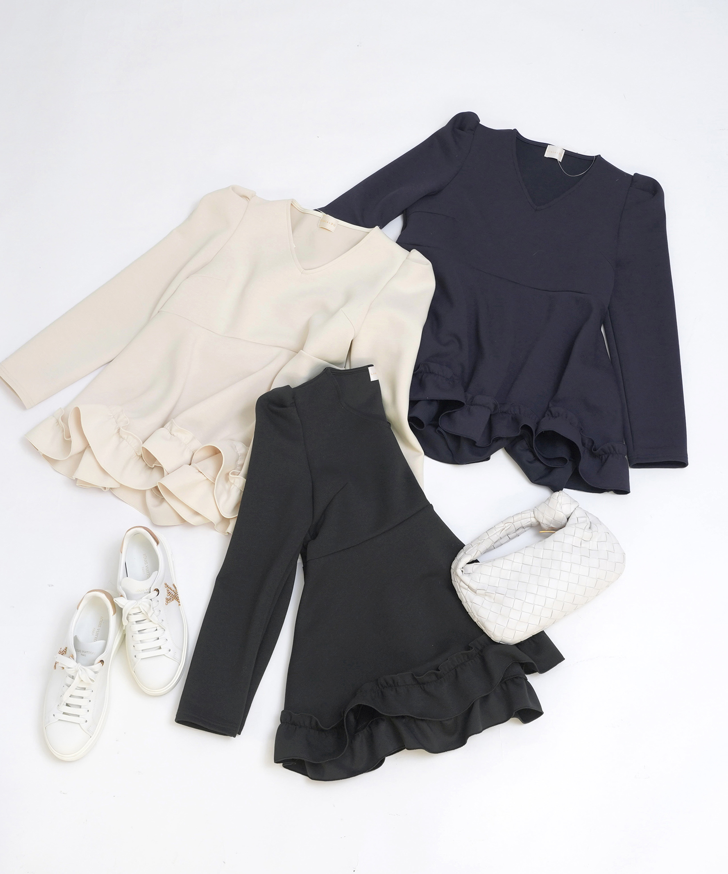 裾に施されたフリルが、シンプルなトップスに動きと華やかさをプラスし、女性らしいシルエットを演出します。