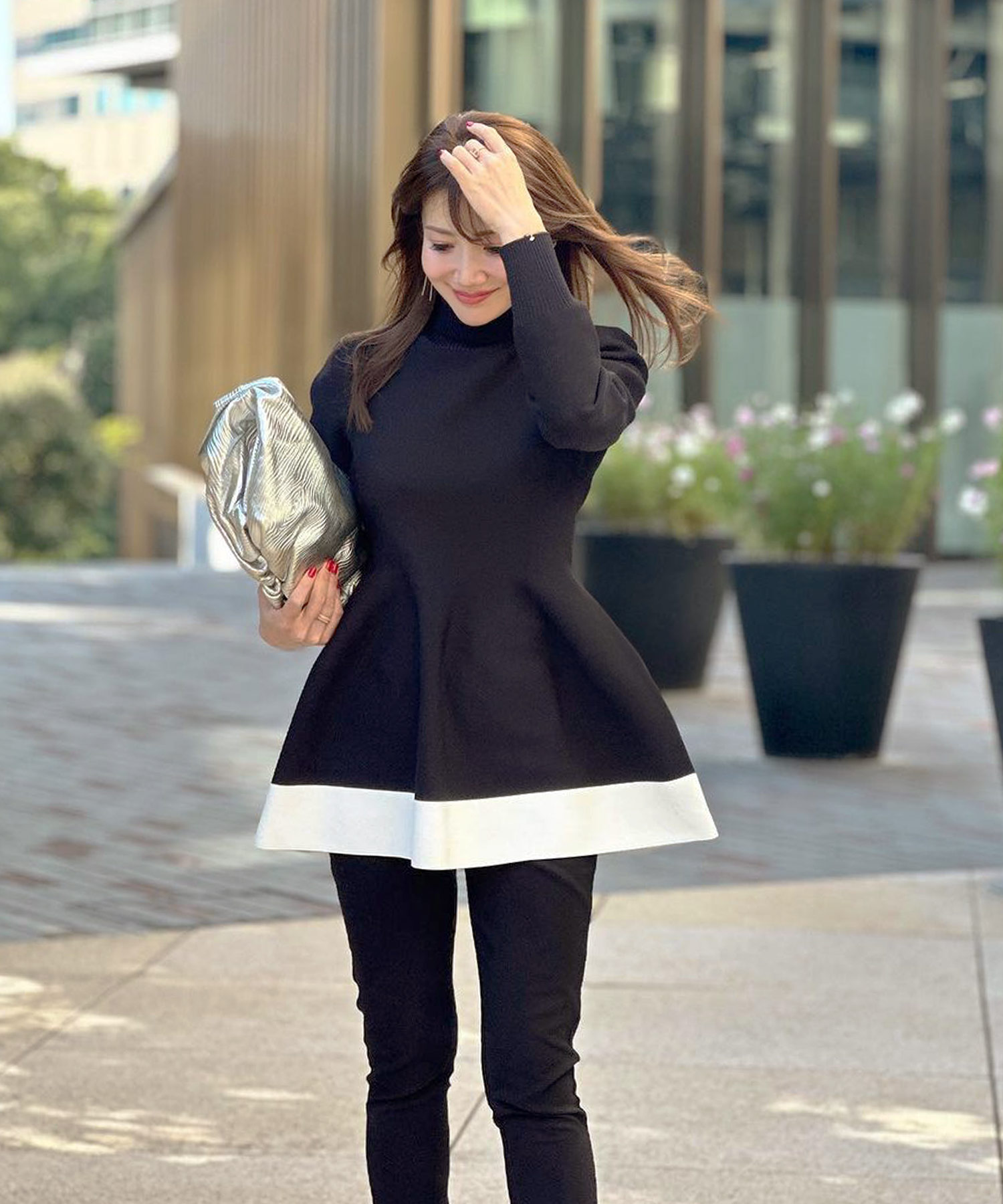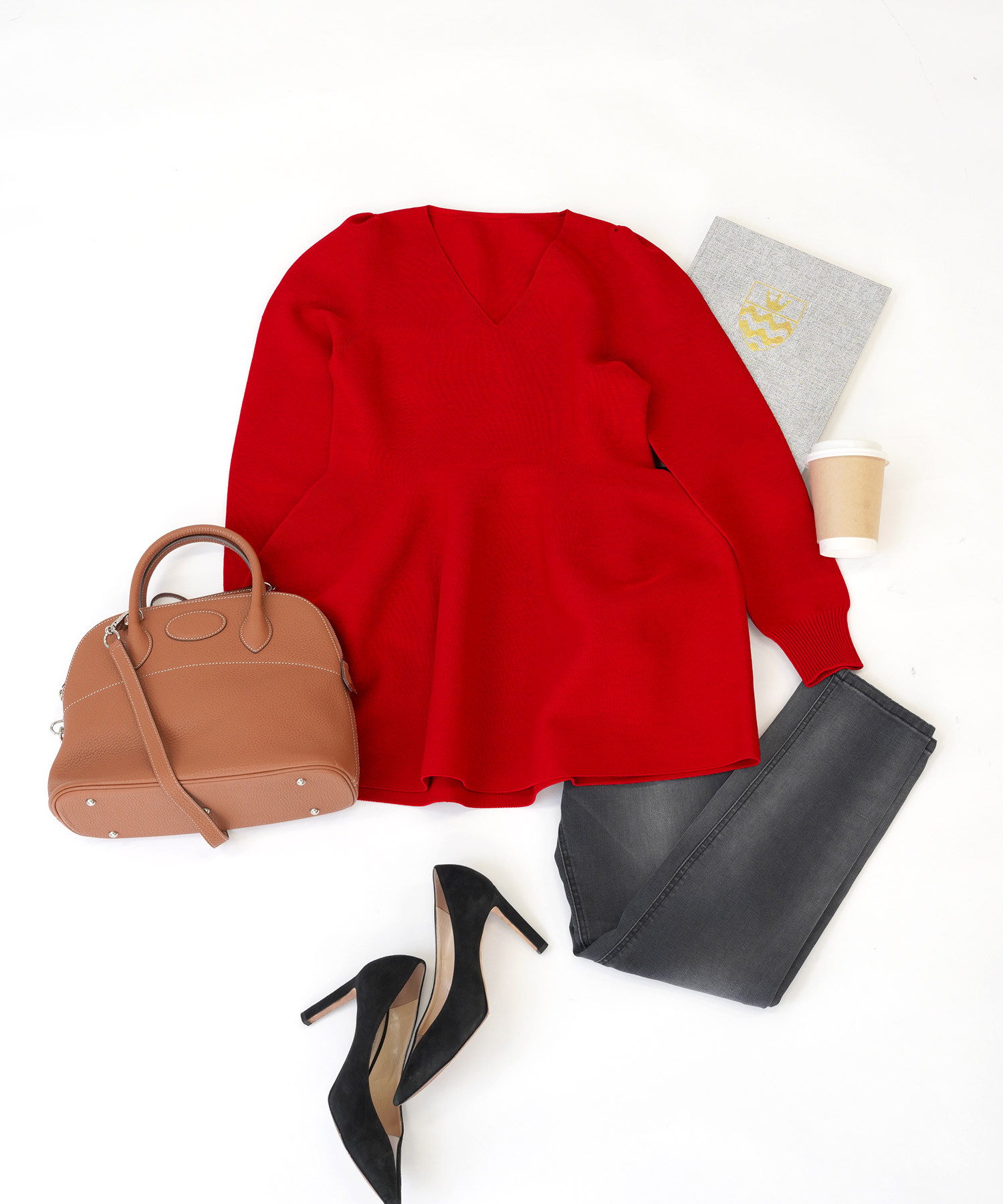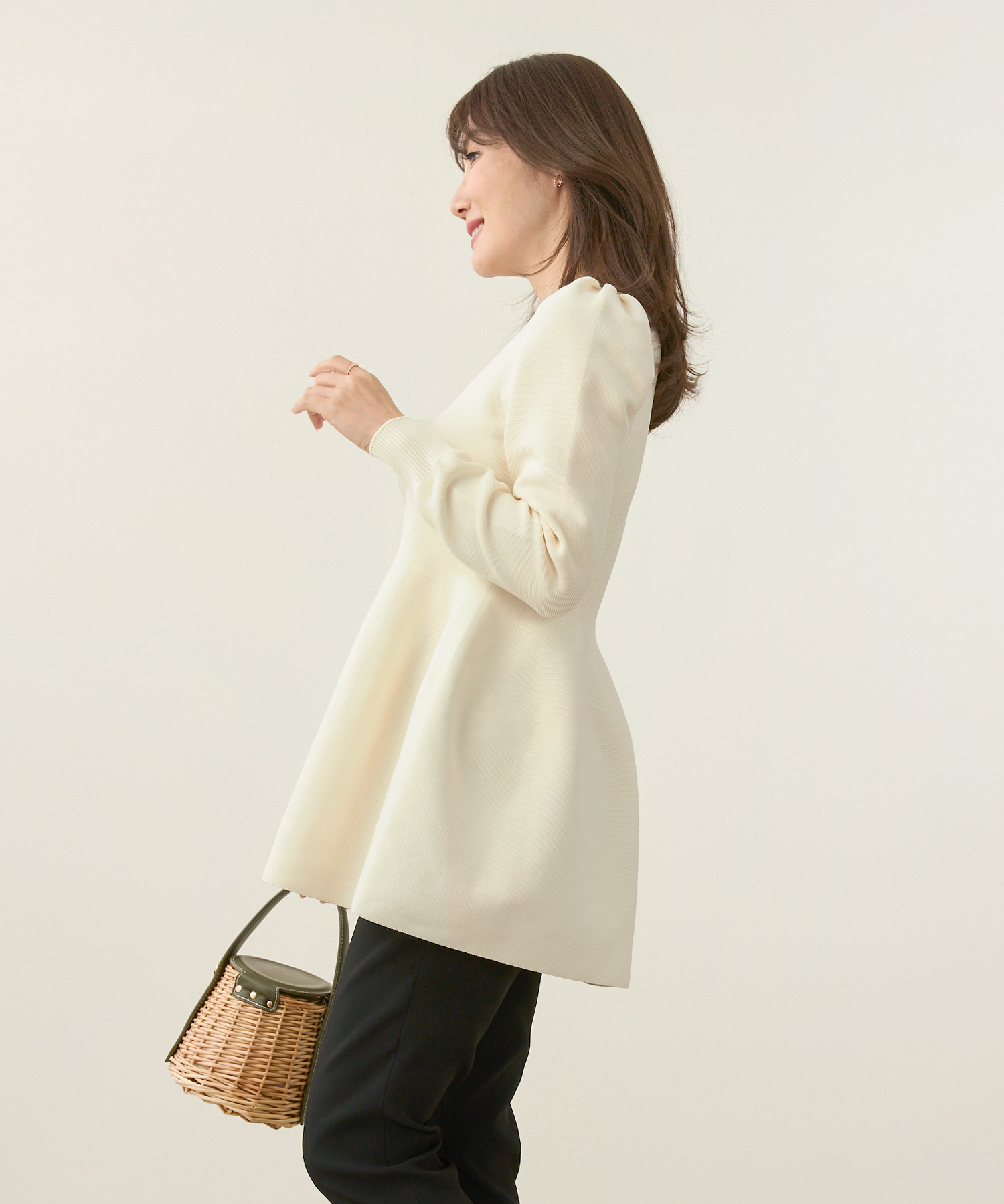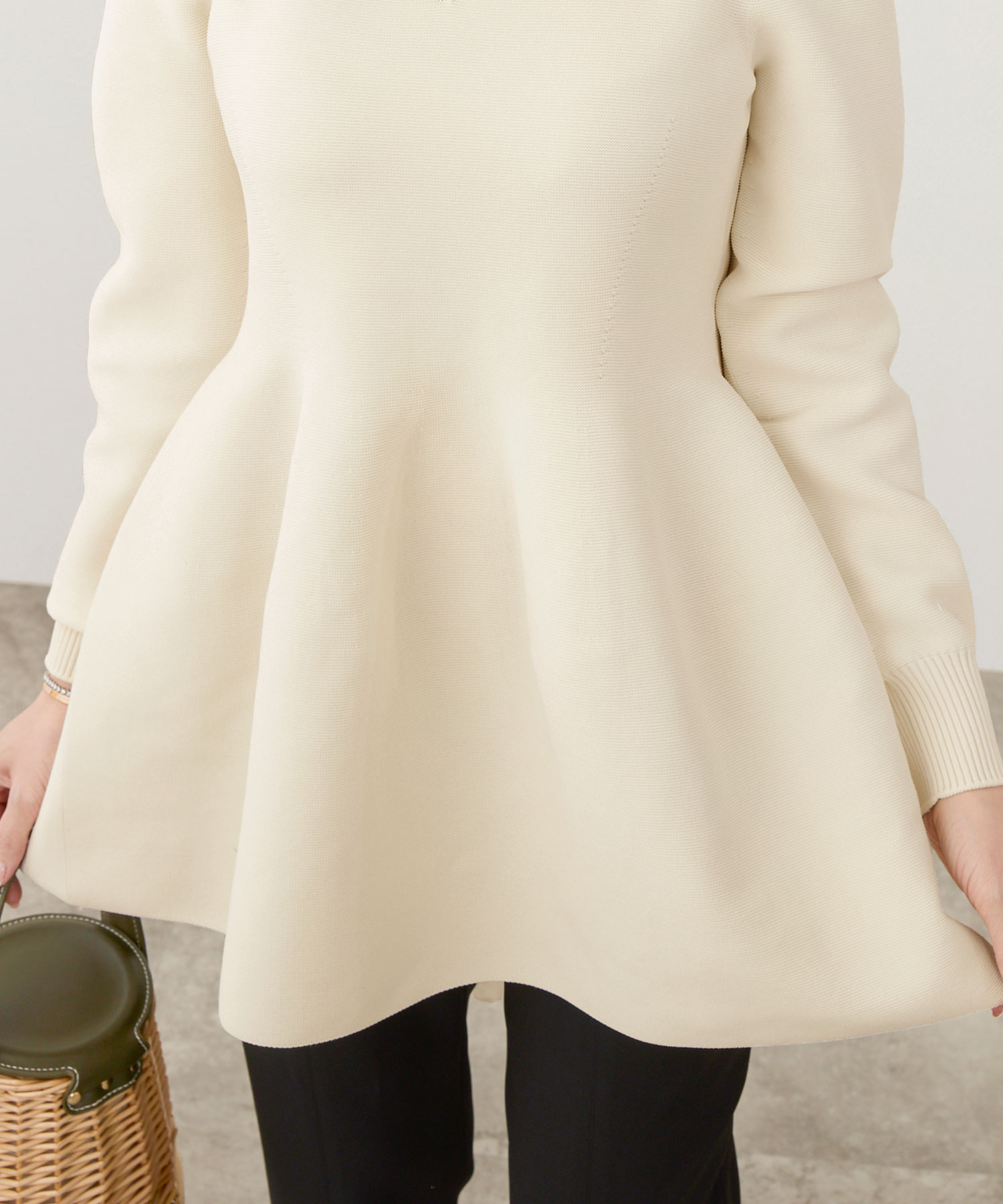 ふんわりと広がるペプラムシルエットが女性らしい着こなしに。