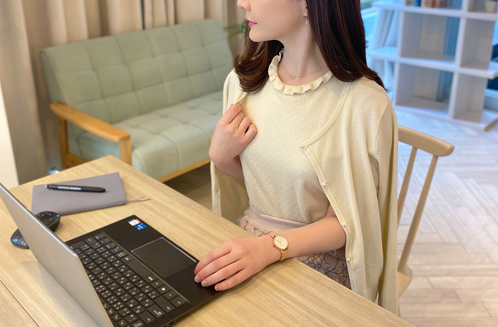 リモートでもお顔が映えるTOPSを選ぶなど、