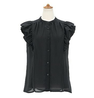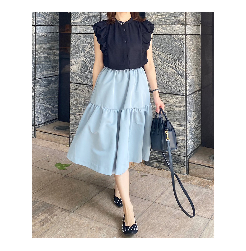 深みあるネイビーのトップスは、袖のダブルフリルがポイント。