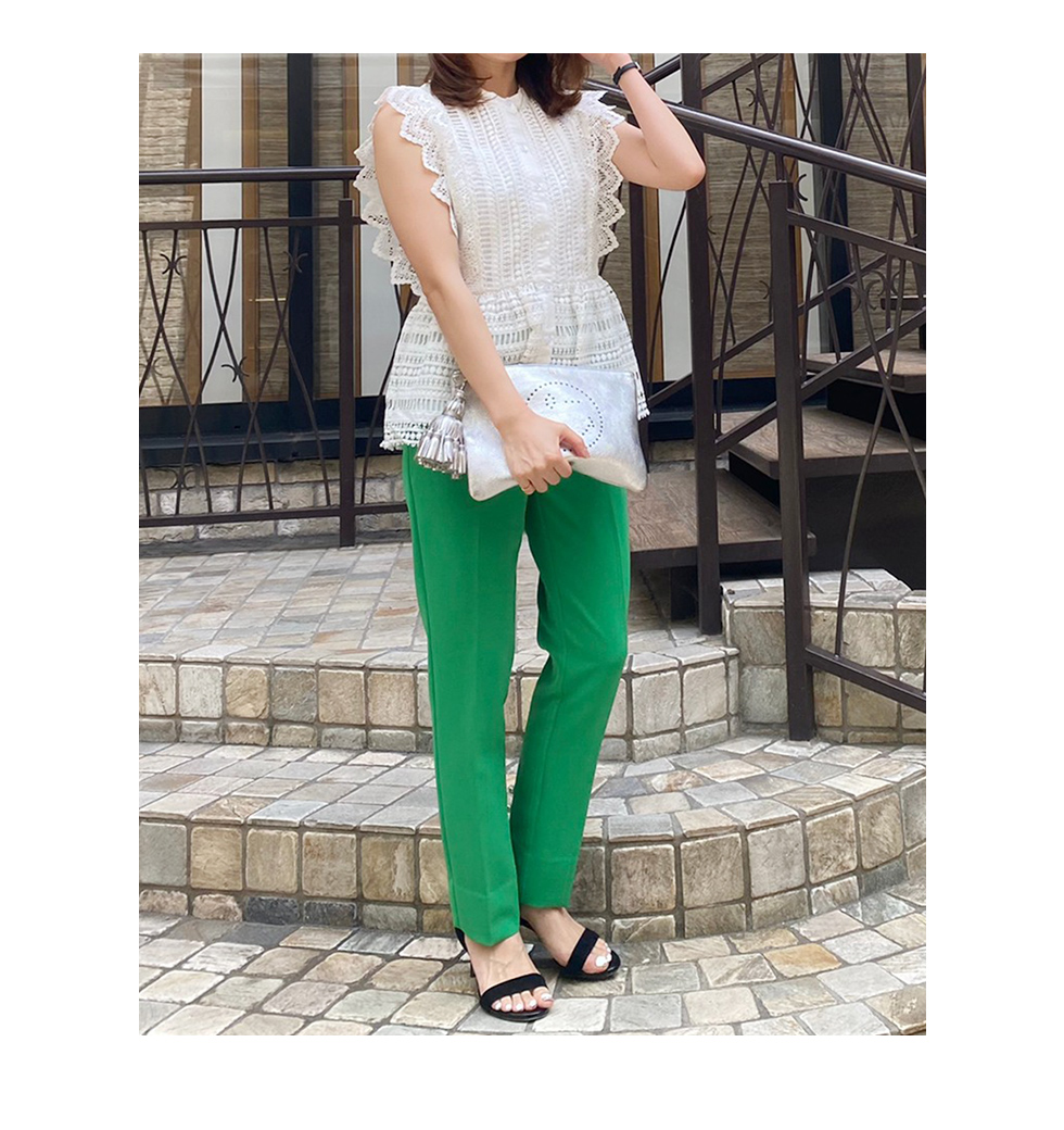 パキッとしたカラーパンツを合わせて甘辛テイストにしました。