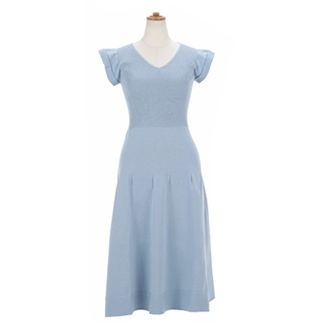 ホールガーメントの軽くて着心地よいワンピは、きれい色サックスを着てみました。