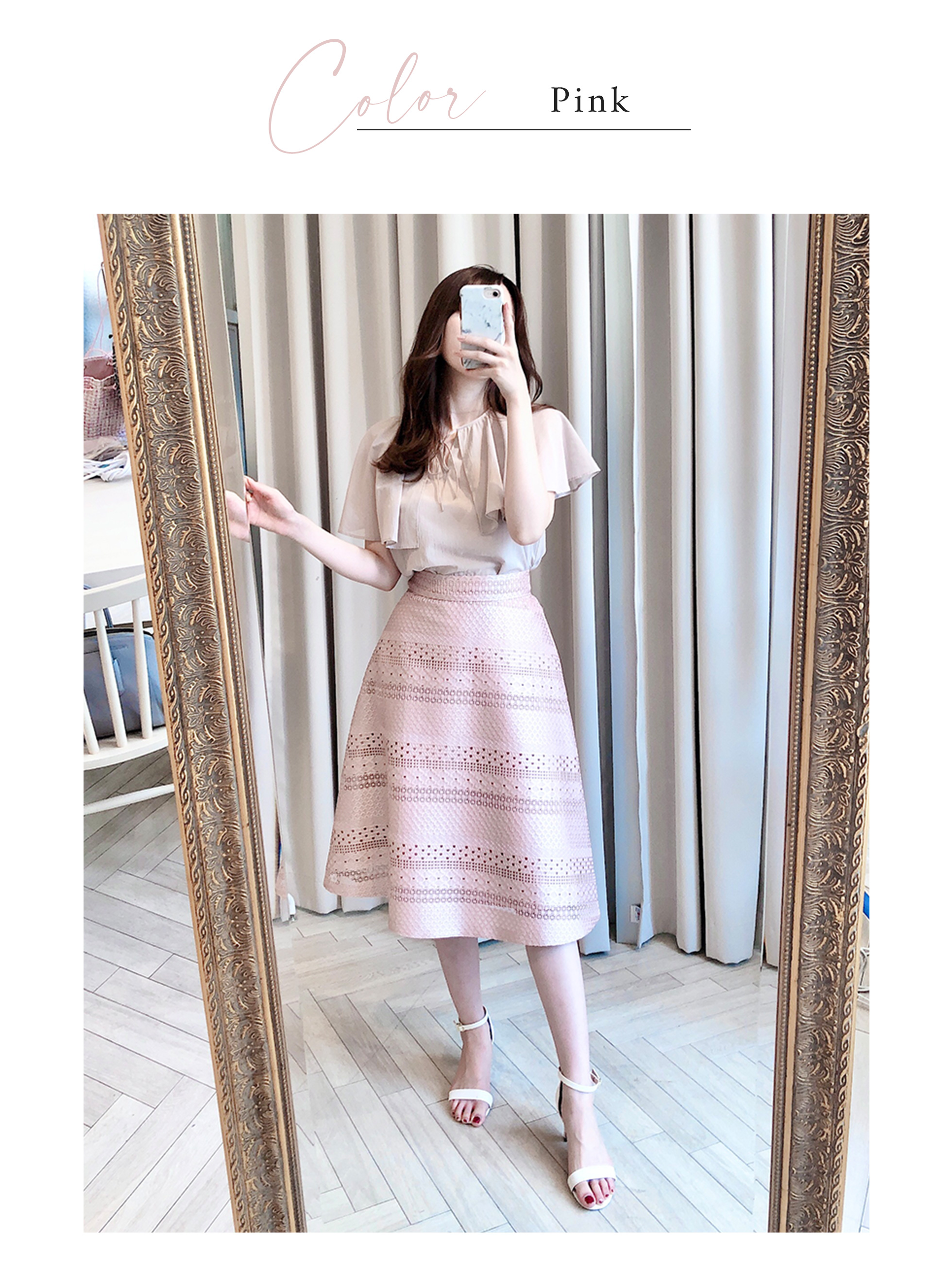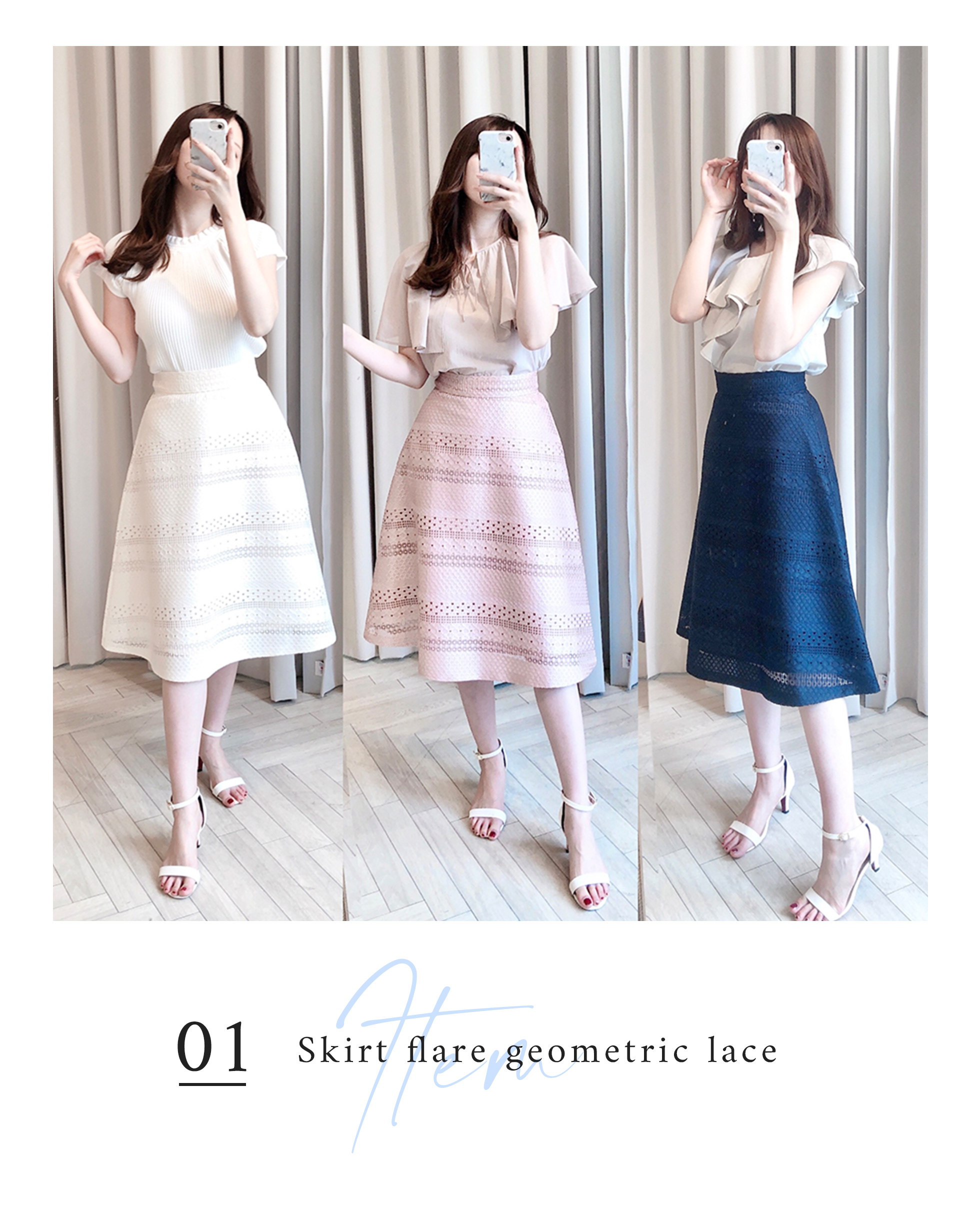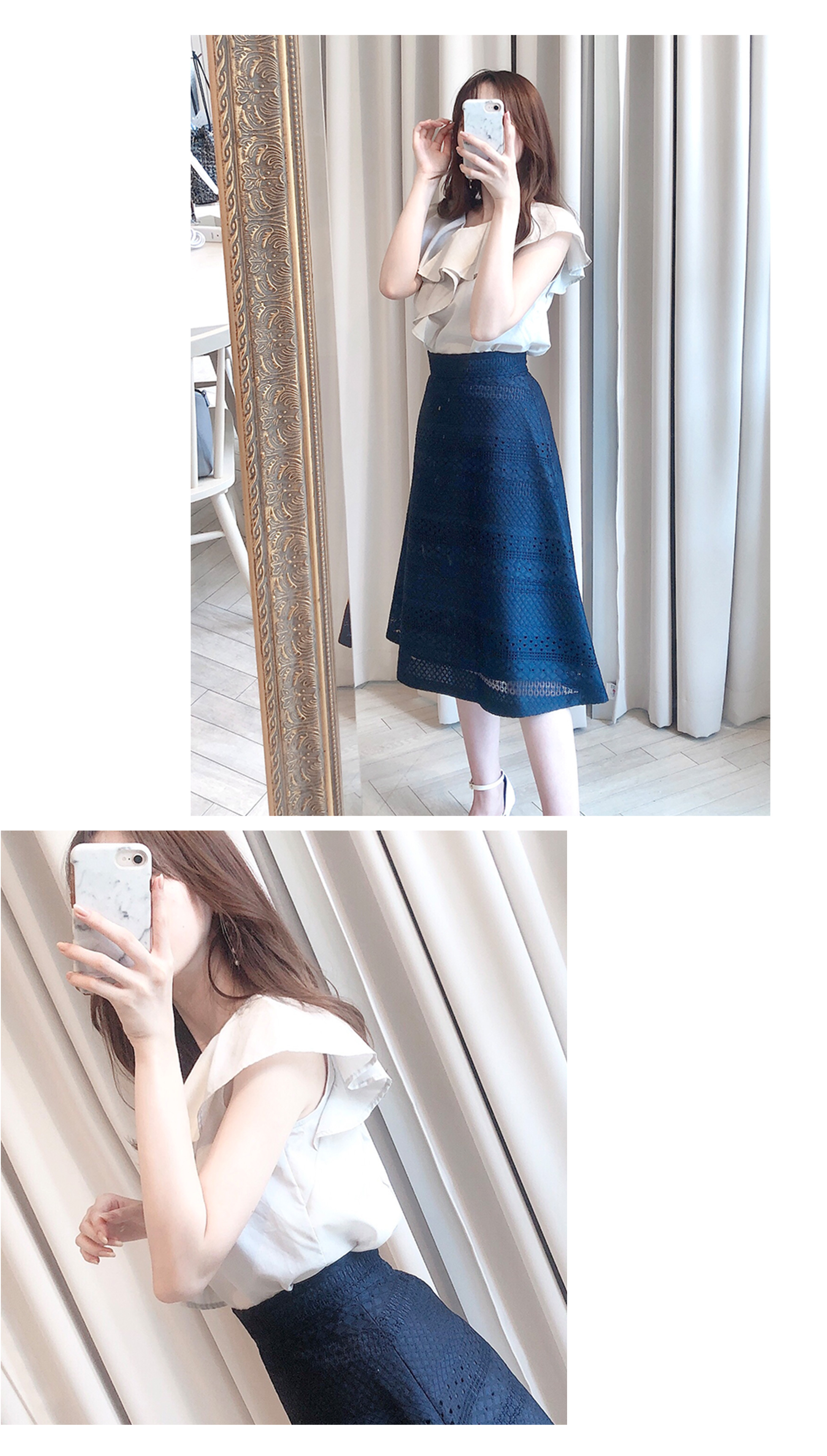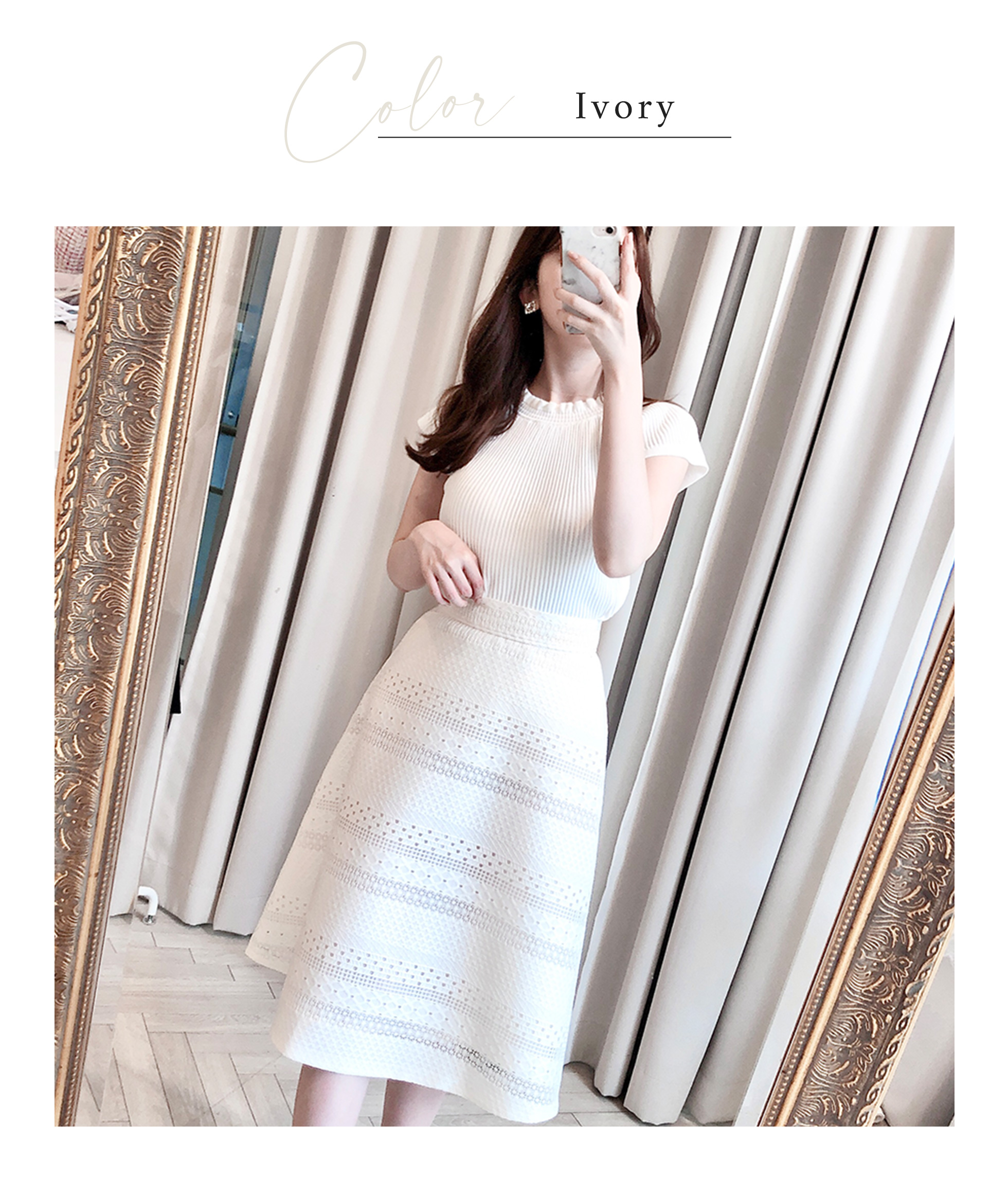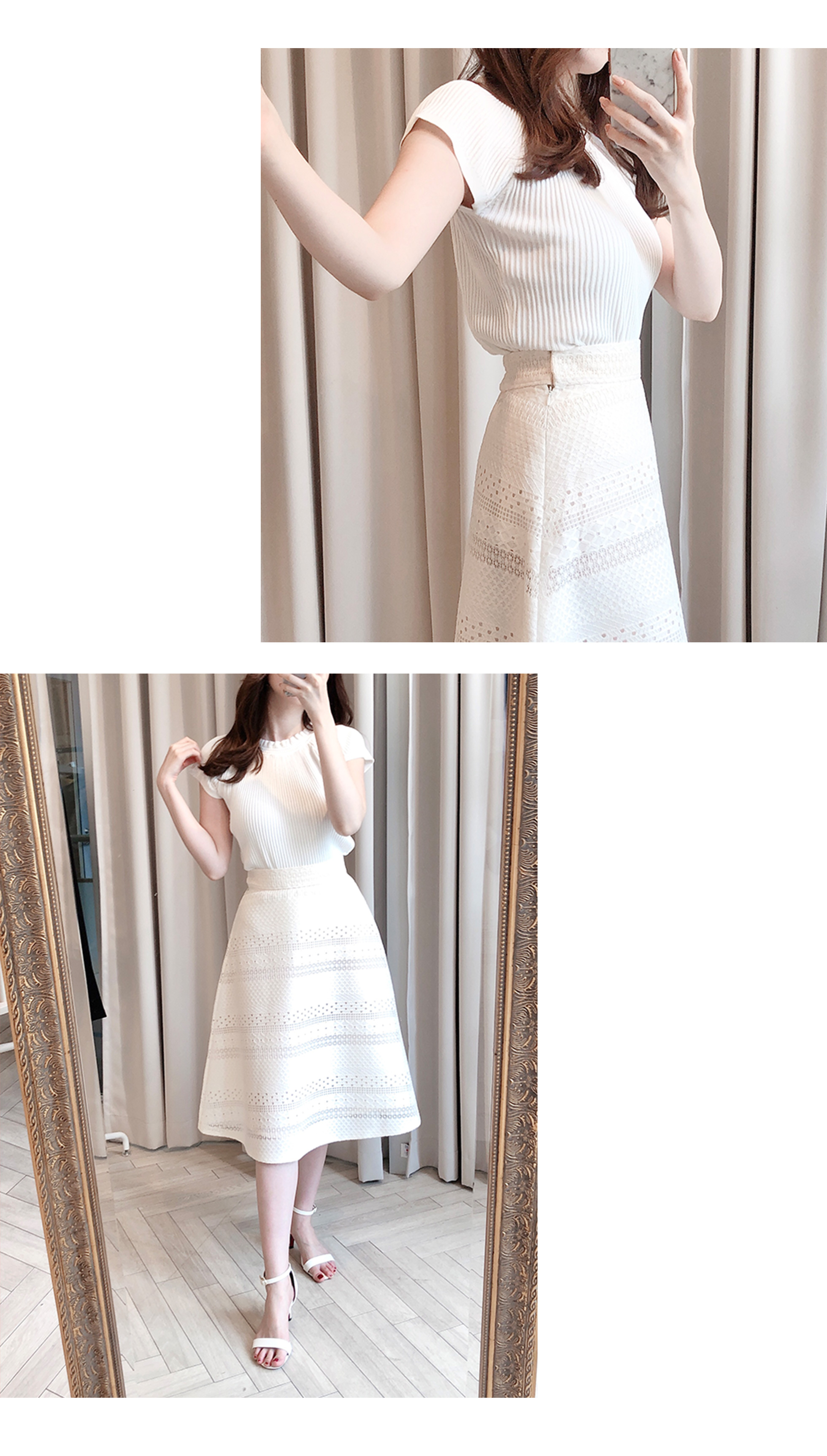 アイボリーのフレアスカートなら、上下ワントーンで合わせたり、明るい色のトップスと合わせると夏にぴったりのコーデに!