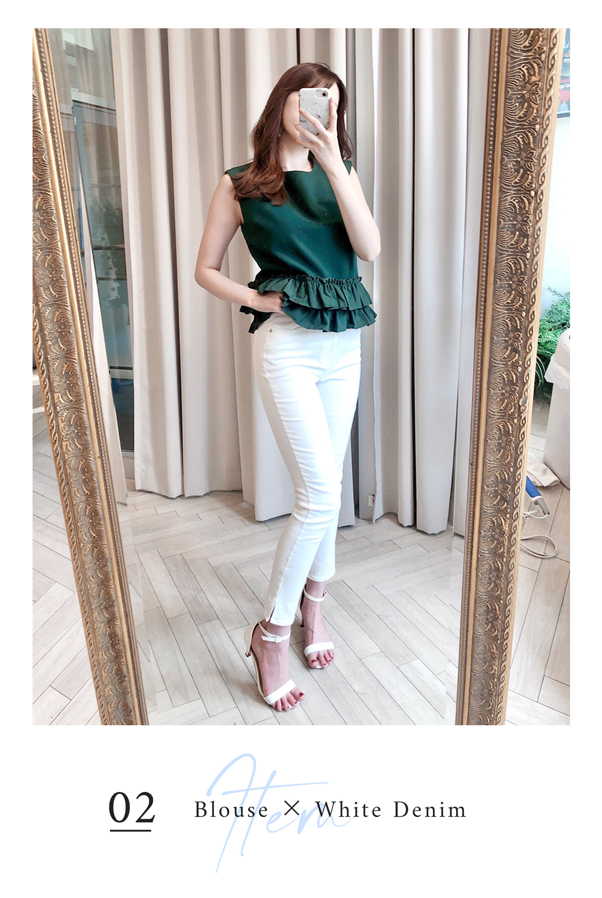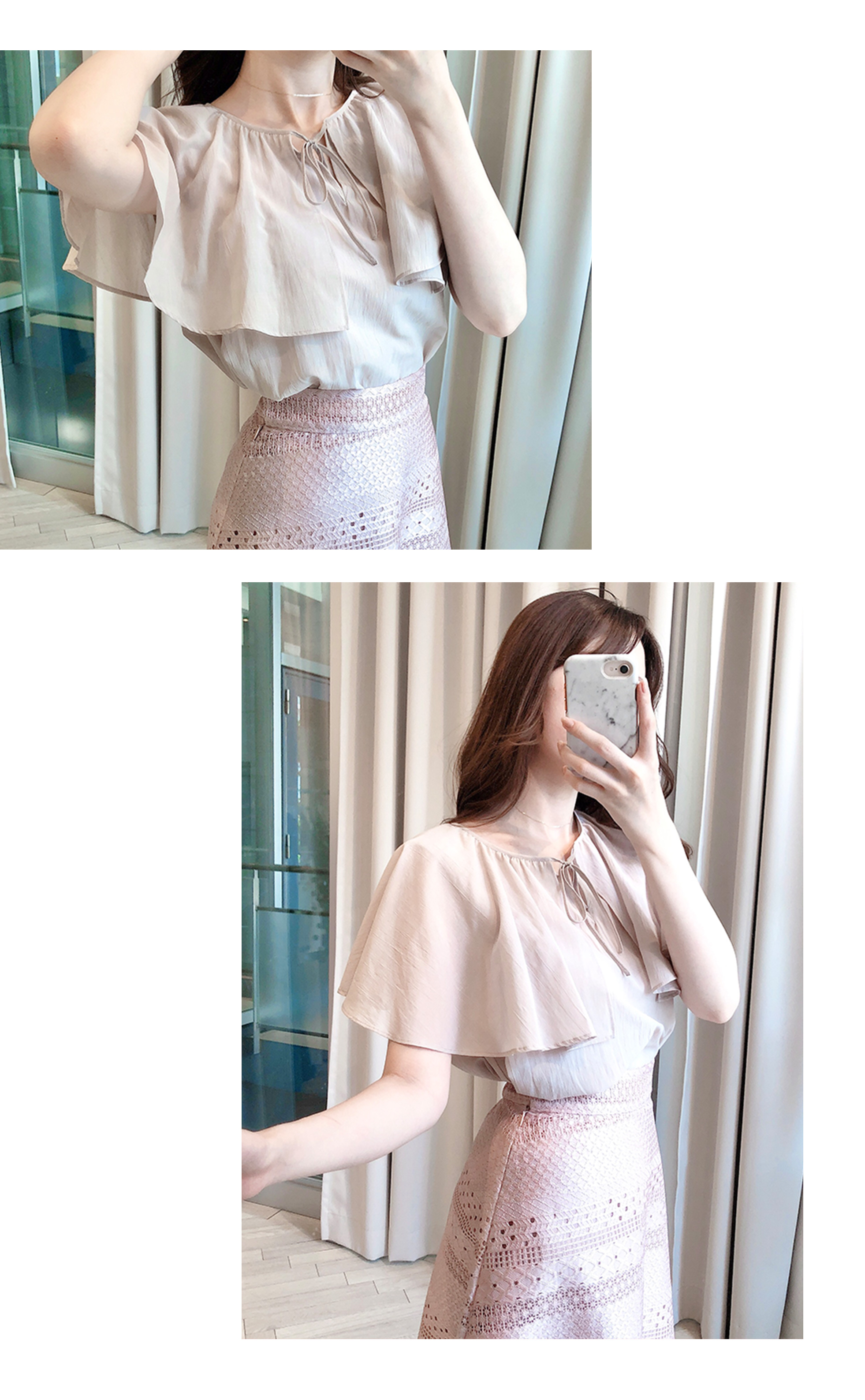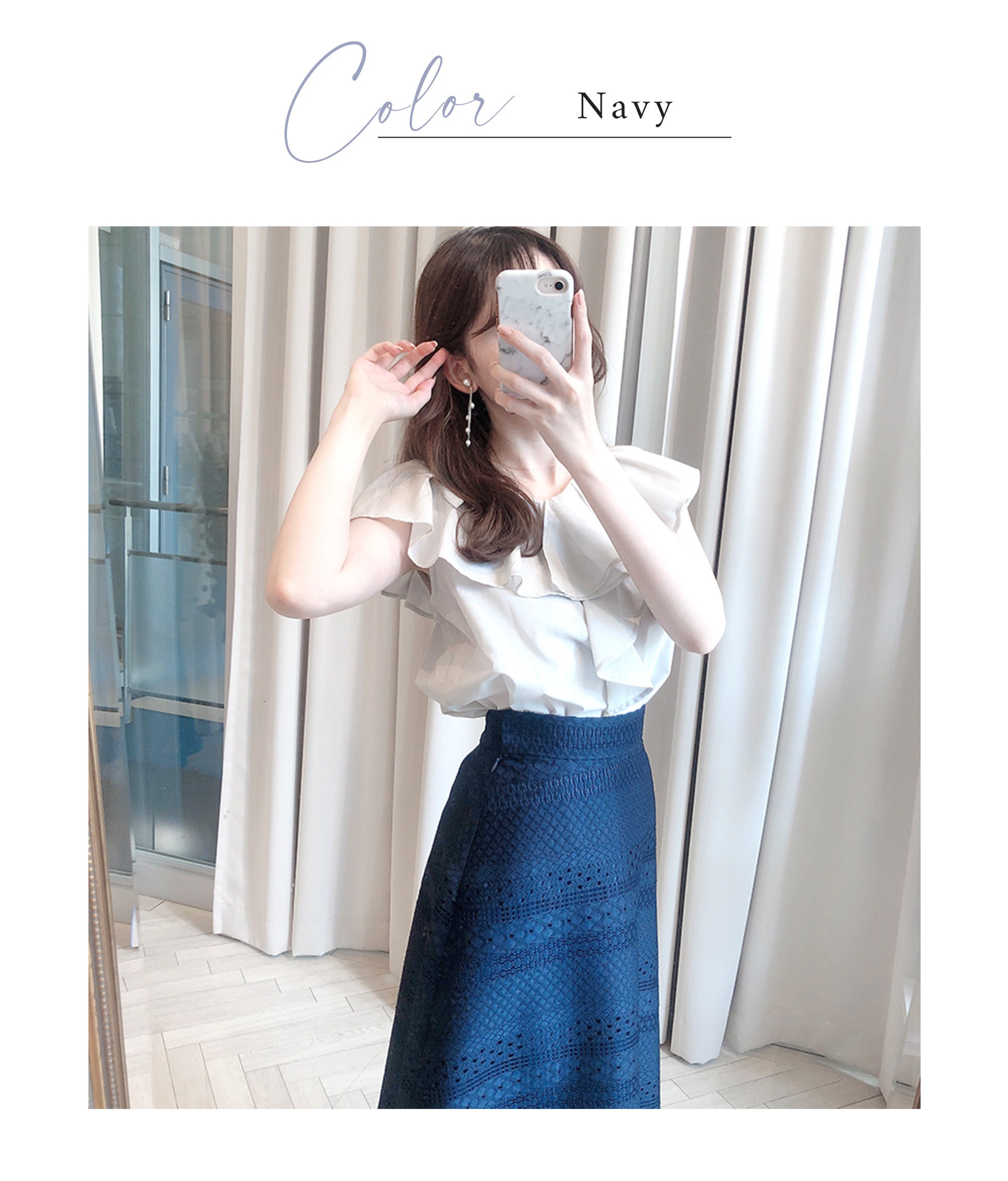 フリルになったトップスもグレーを選び、ネイビーと合わせることで甘さ控えめの大人コーデになります♡