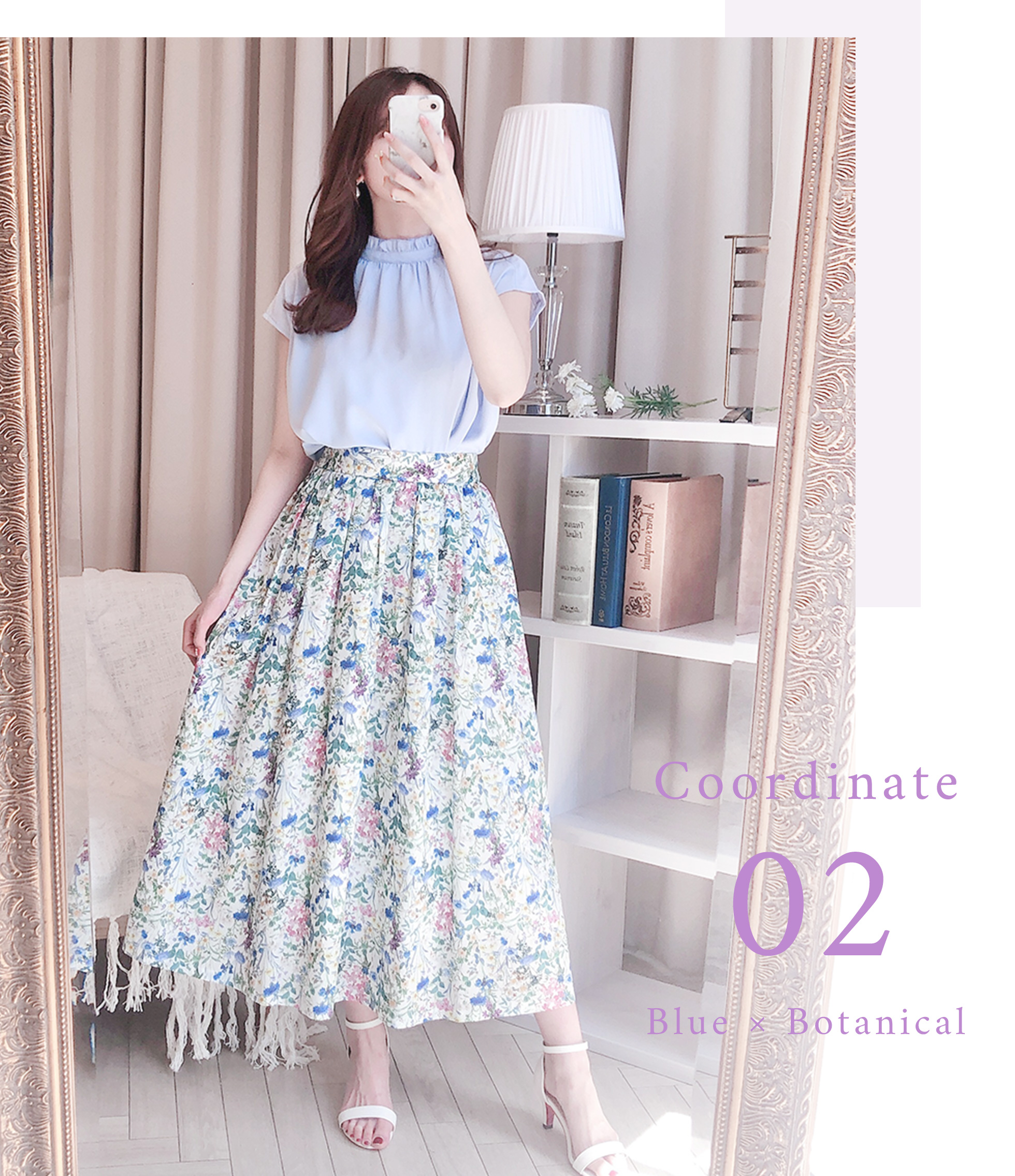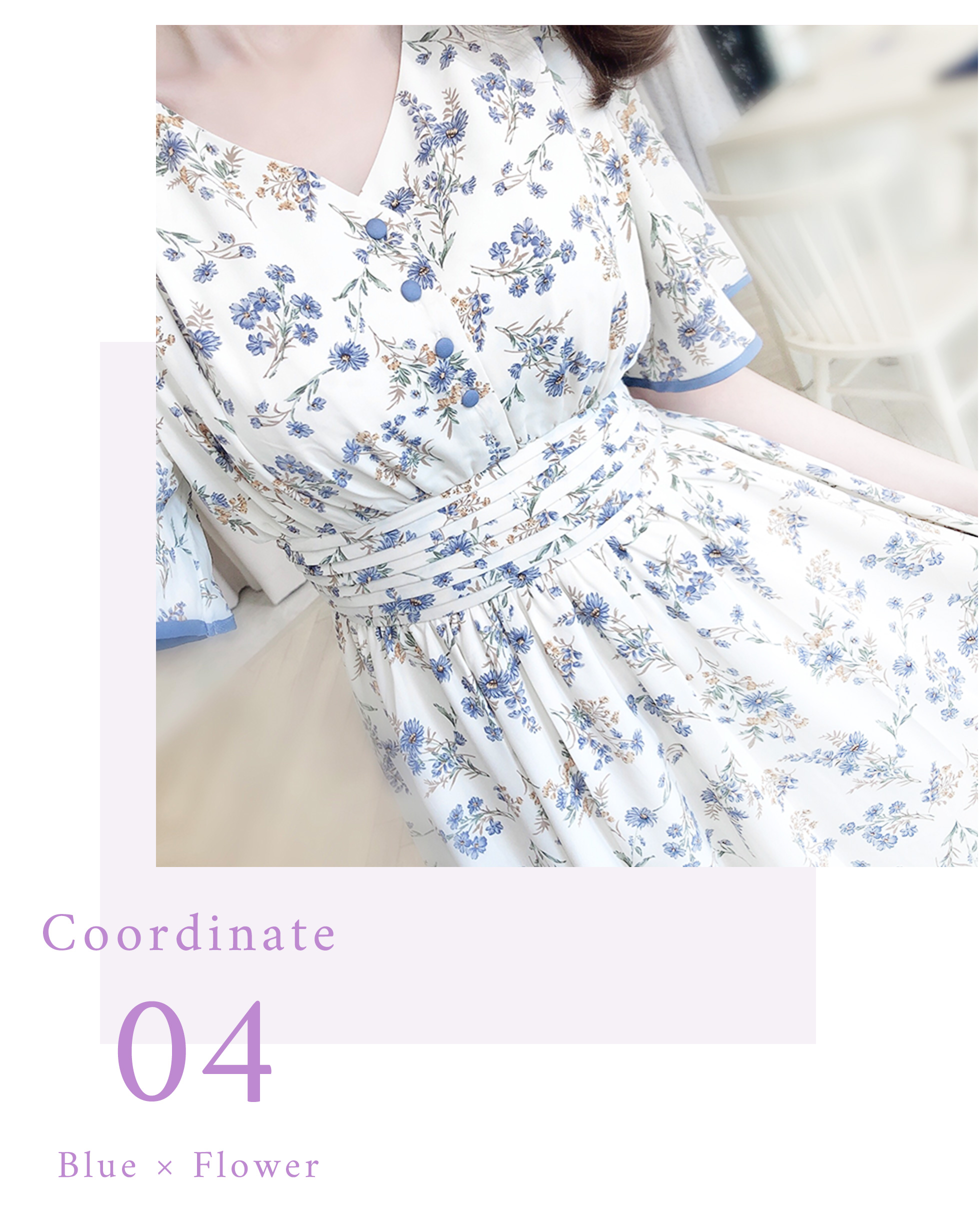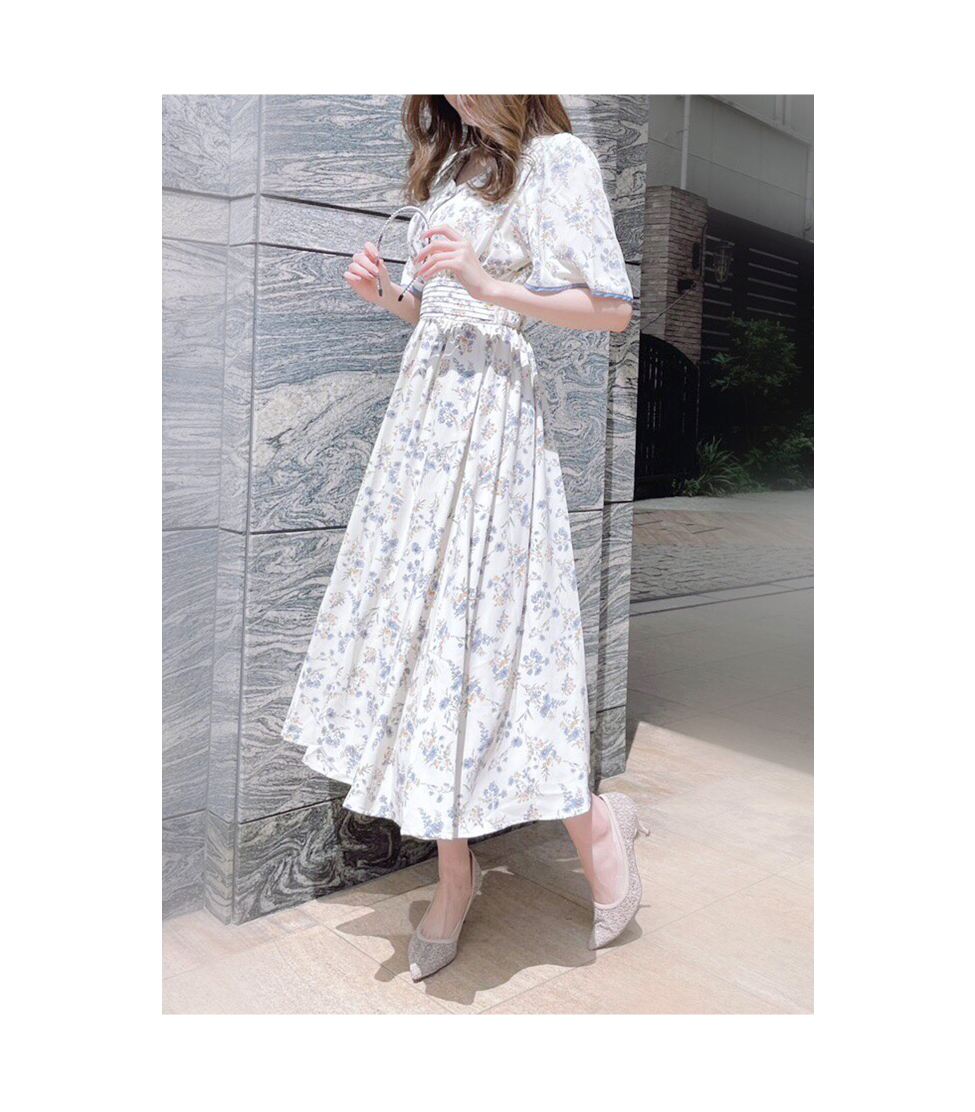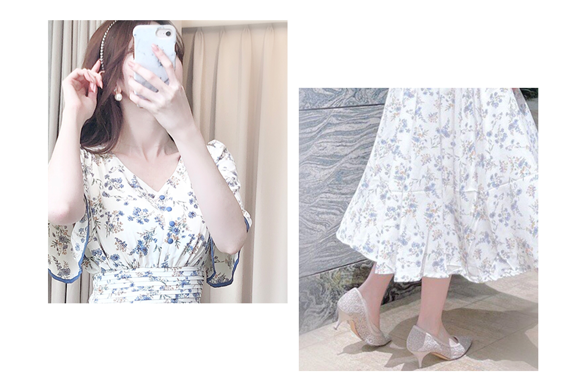 首元のフラワーデザインとスカートの柄がマッチします♡